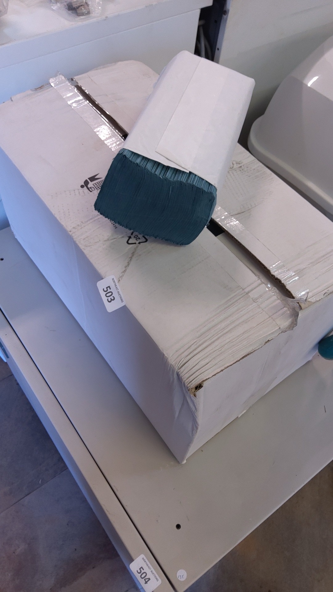A quantity of blue paper hand towels , in a taped cardboard shipping carton.(12 x 250 in box)