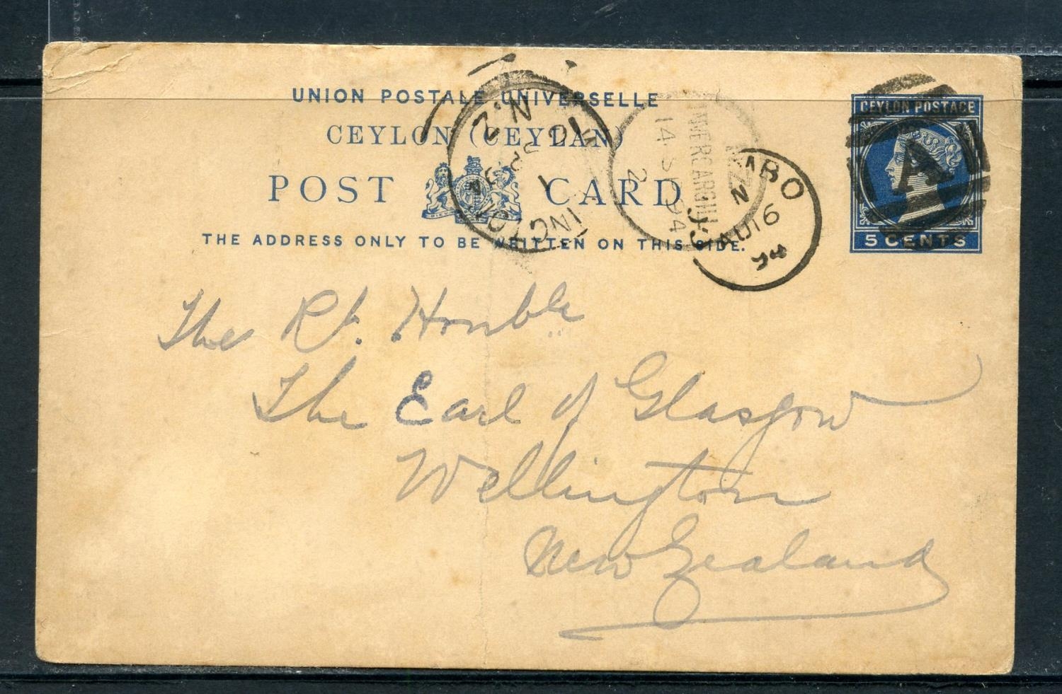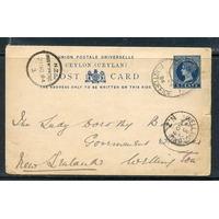 CEYLON 1894 Govenor's stationery card to New Zealand from Shipping Agent. Central crease.