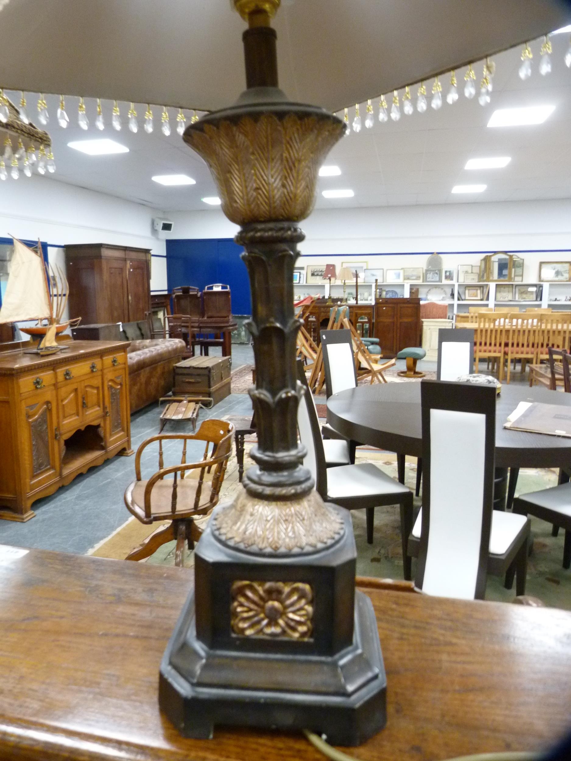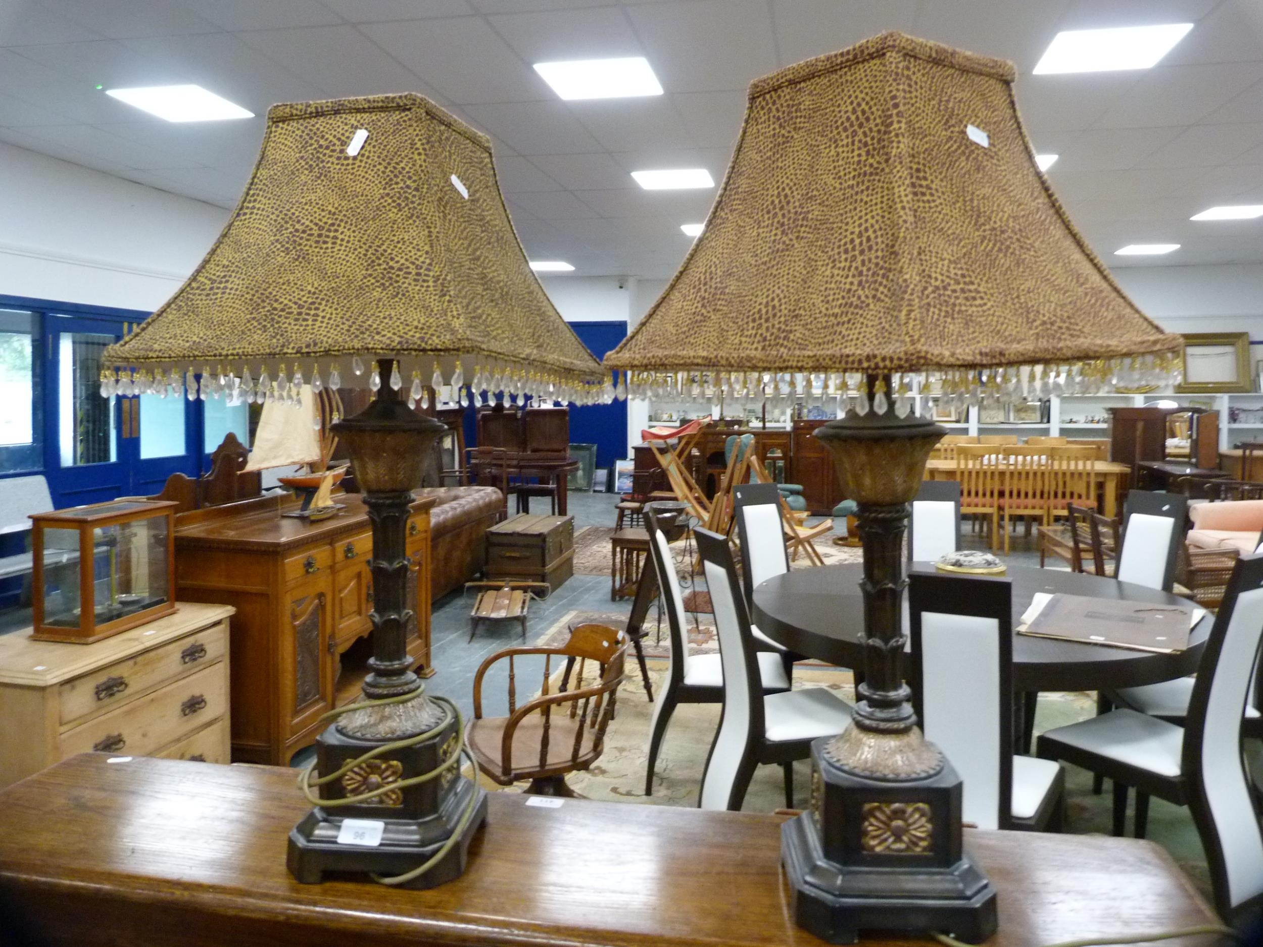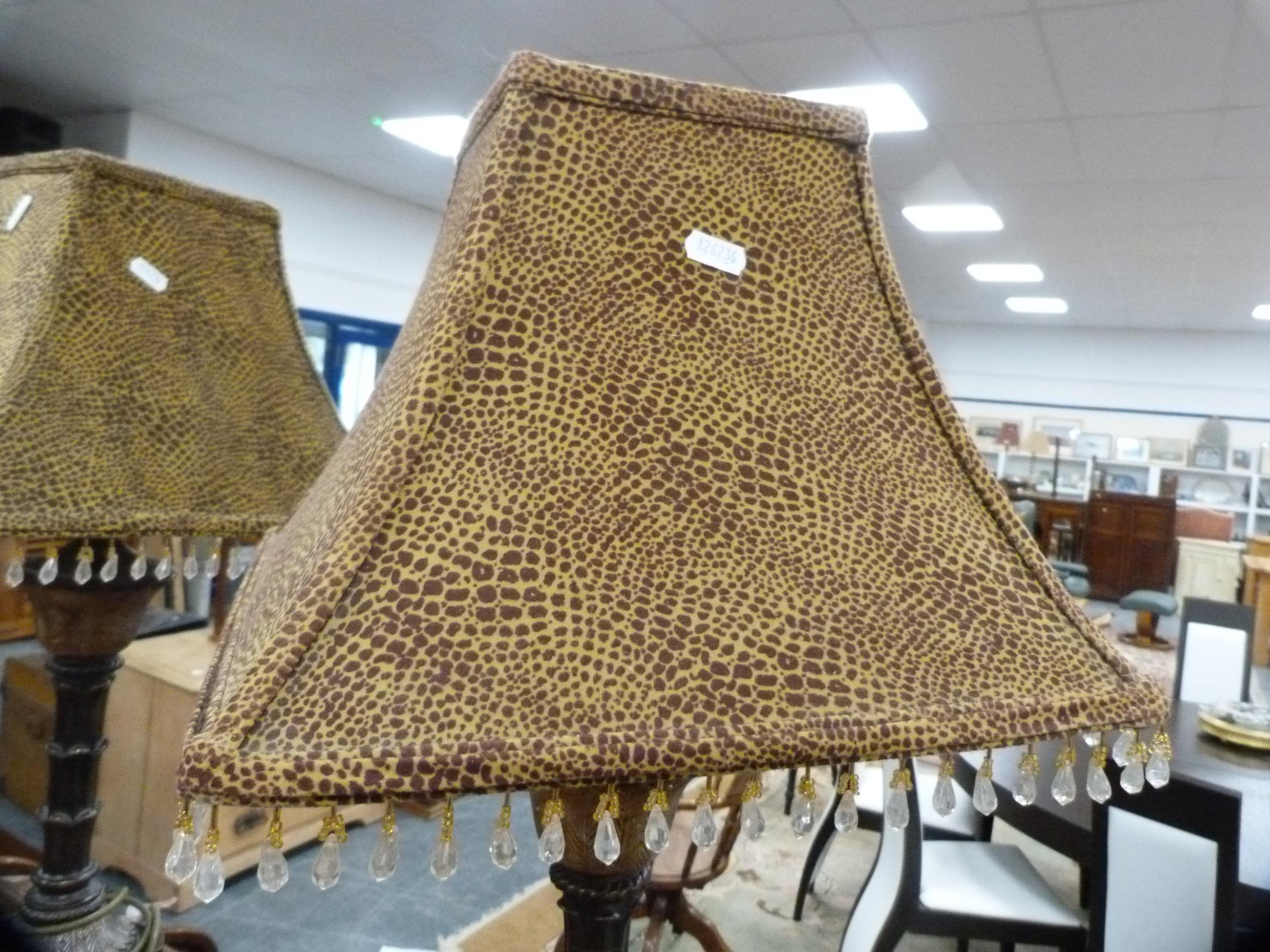 Pair of reproduction table lamps and shades, fitted for electricity. (2)