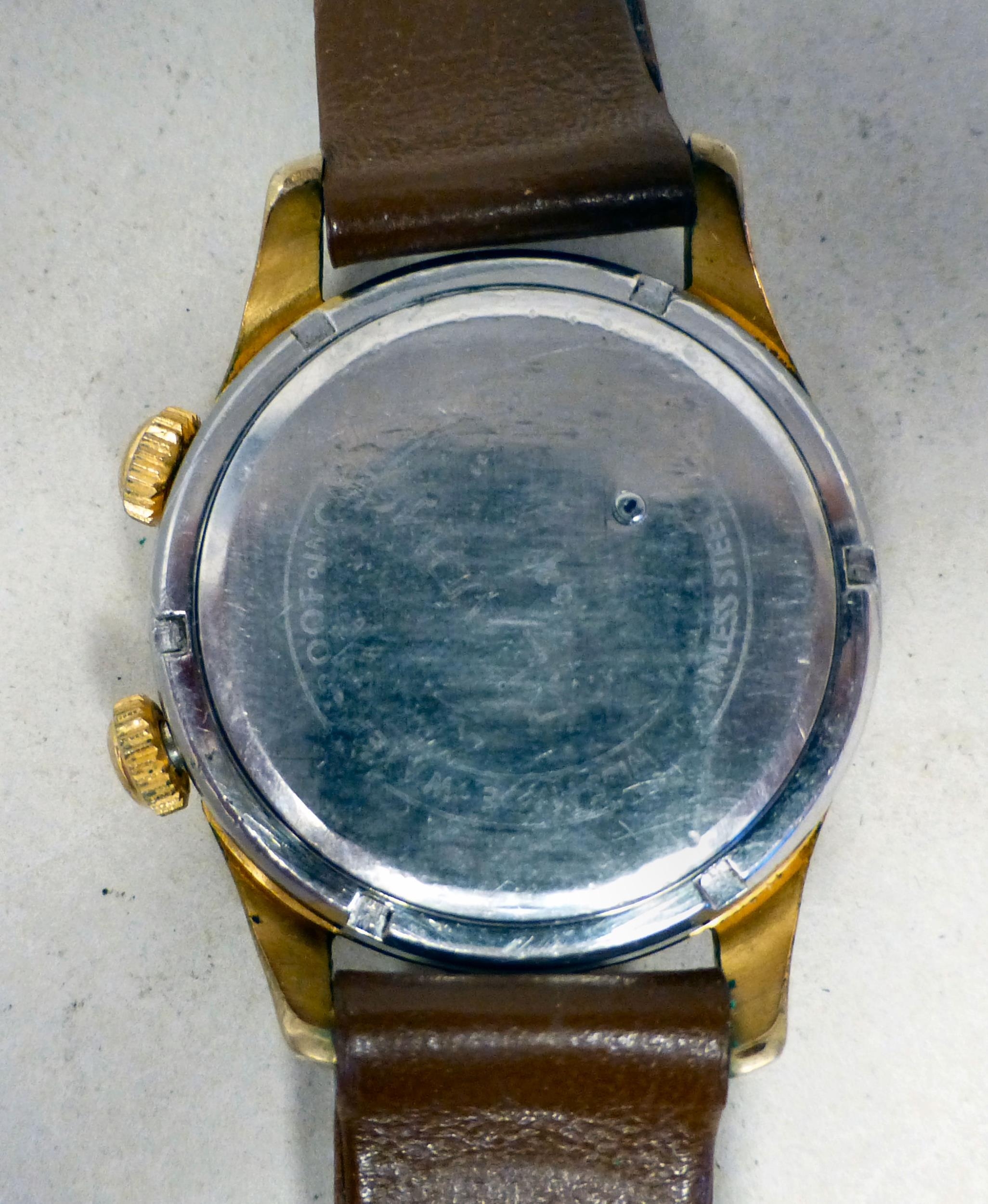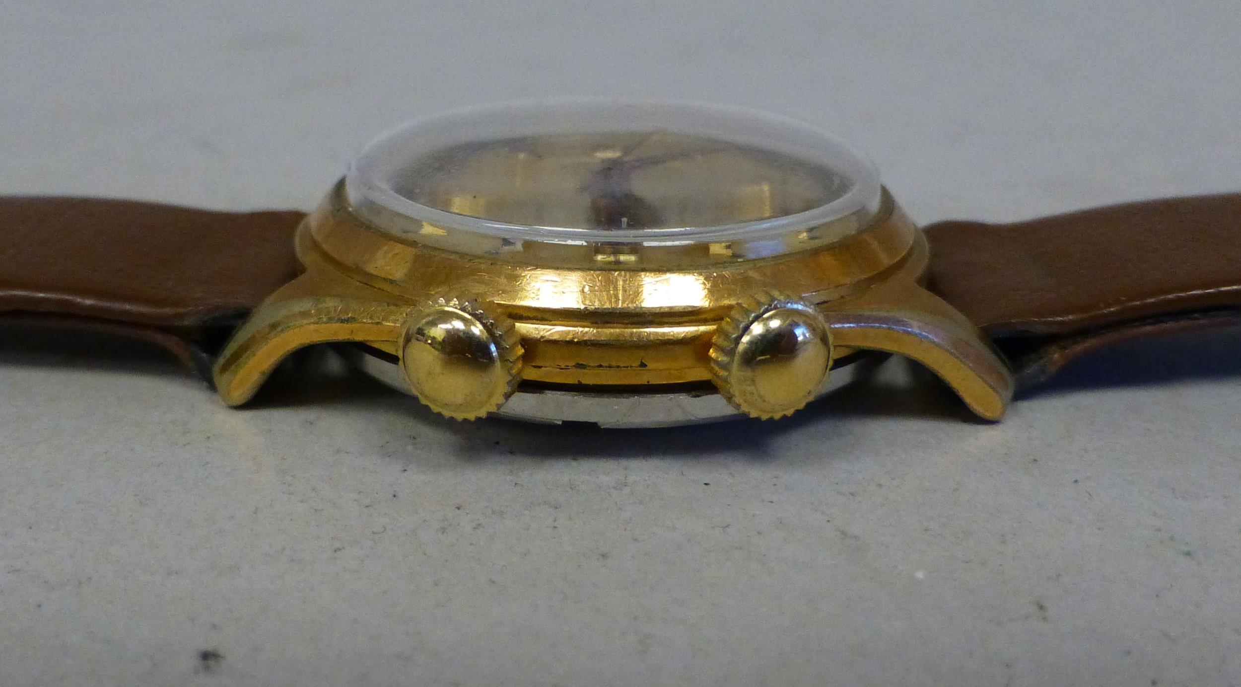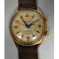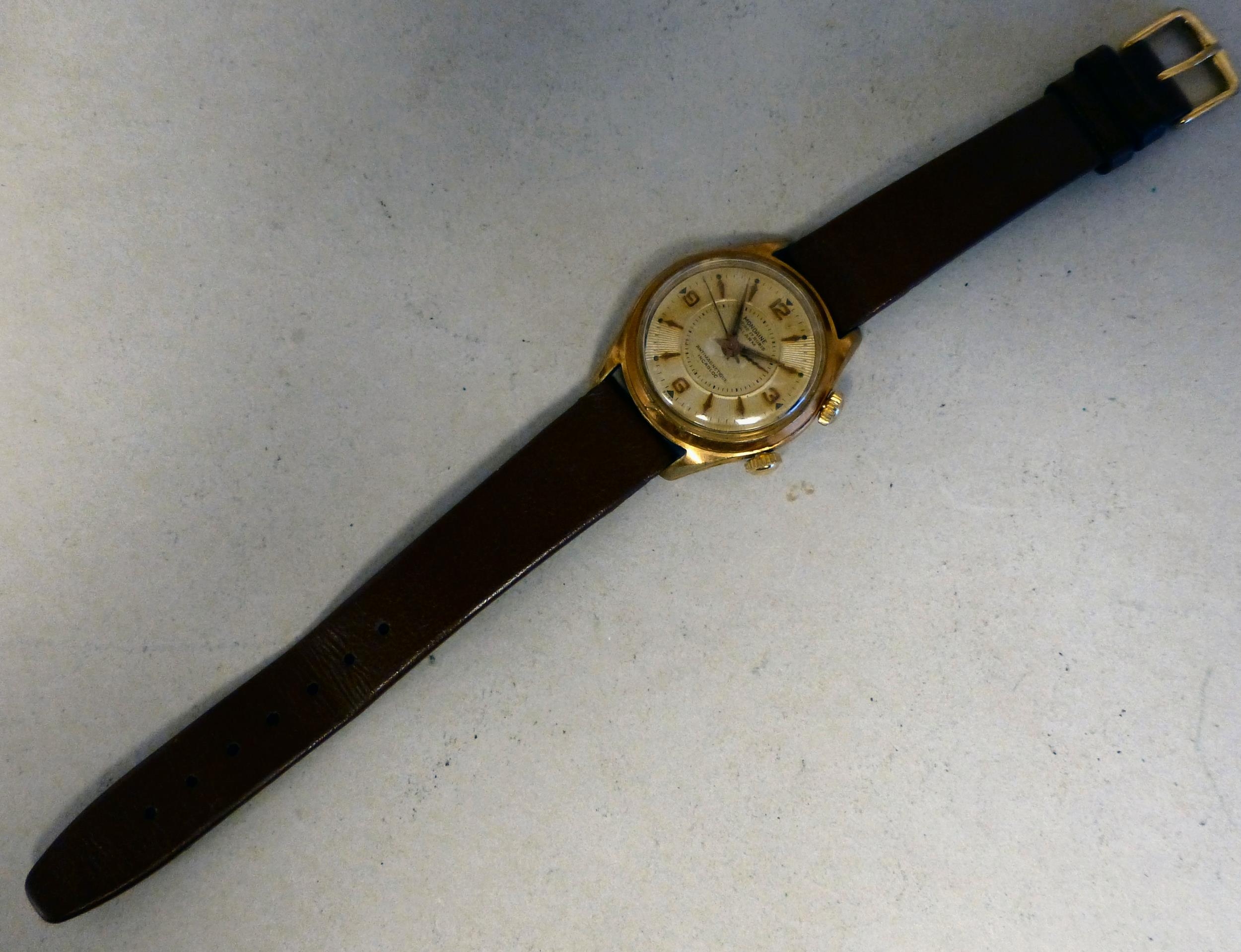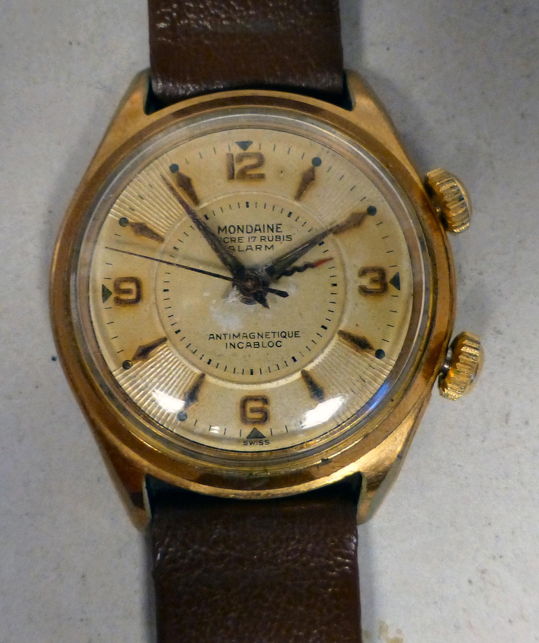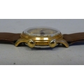 A Mondaine gold plated manual alarm watch, faced by a baton and Arabic dial