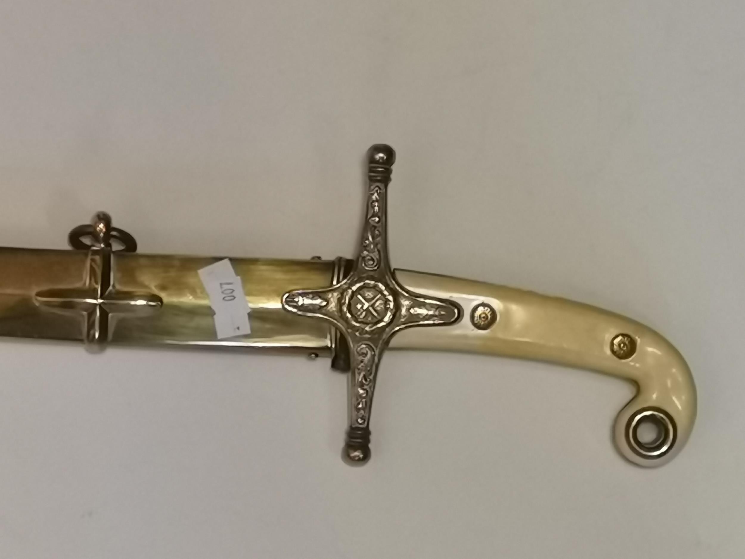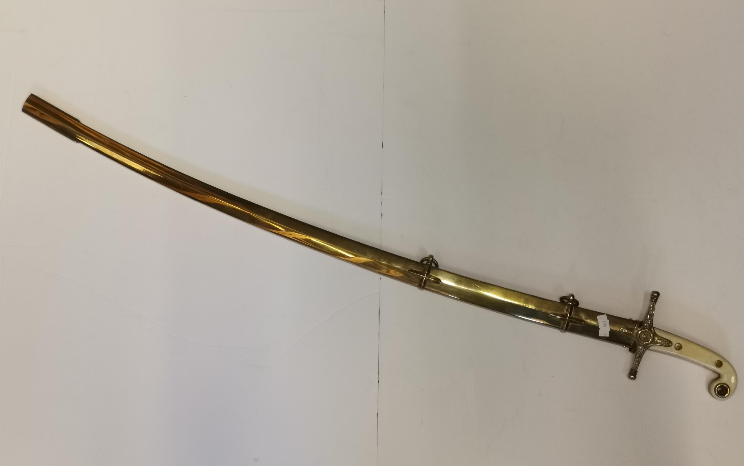 A Victorian 1831 pattern General Officer's mameluke-hilted sabre, the curved steel blade etched both sides with scrolling foliage, crowned cypher to the front, crossed baton and sword the reverse, marked MANTON & CO ENGLAND, the brass-mounted hilt with two-piece ivory grips joined by two floral-head studs, the brass cross-guard with crossed baton and sword within a wreath each side, in brass scabbard with suspension rings. 99cm long overall
