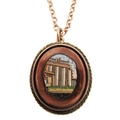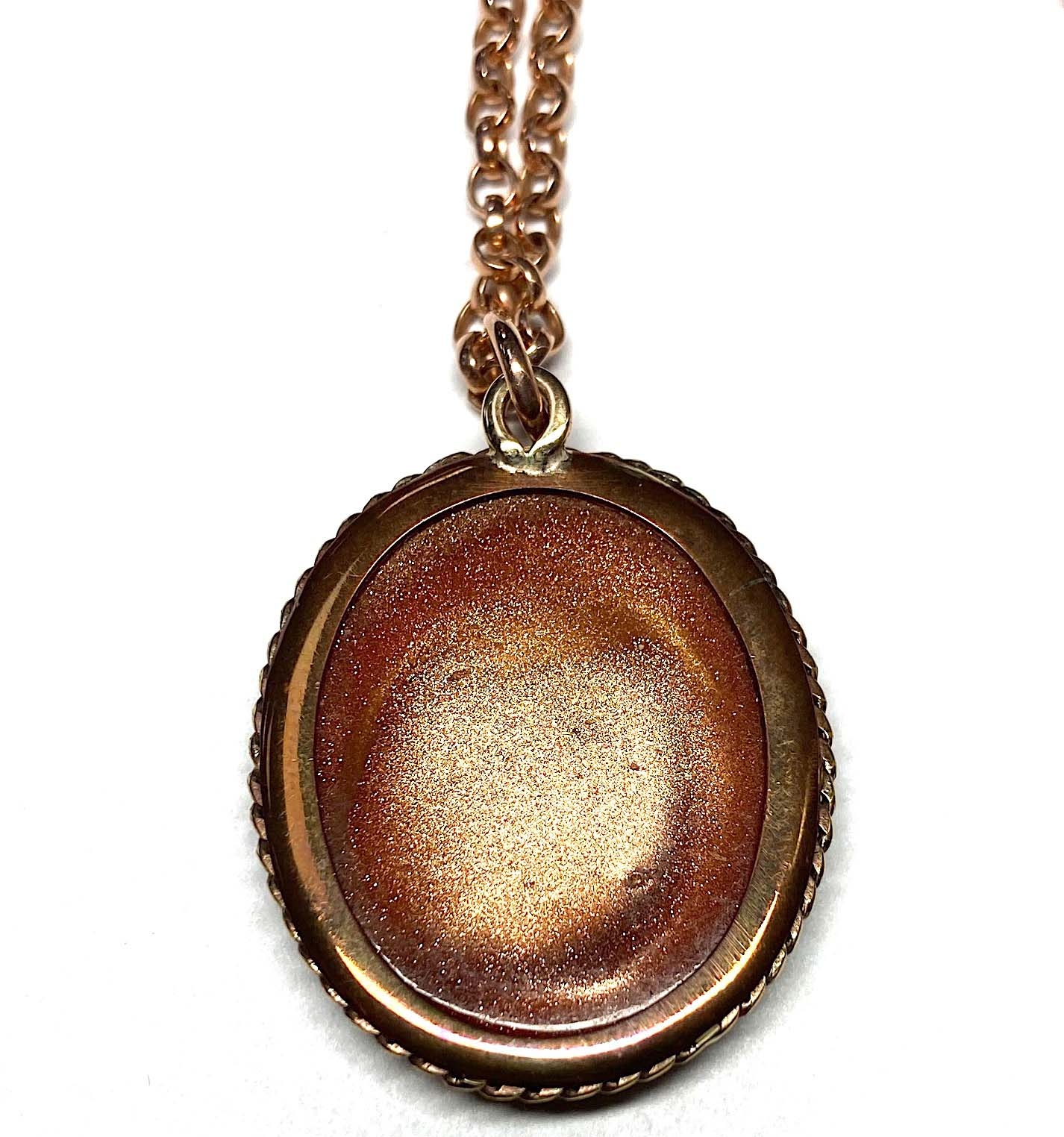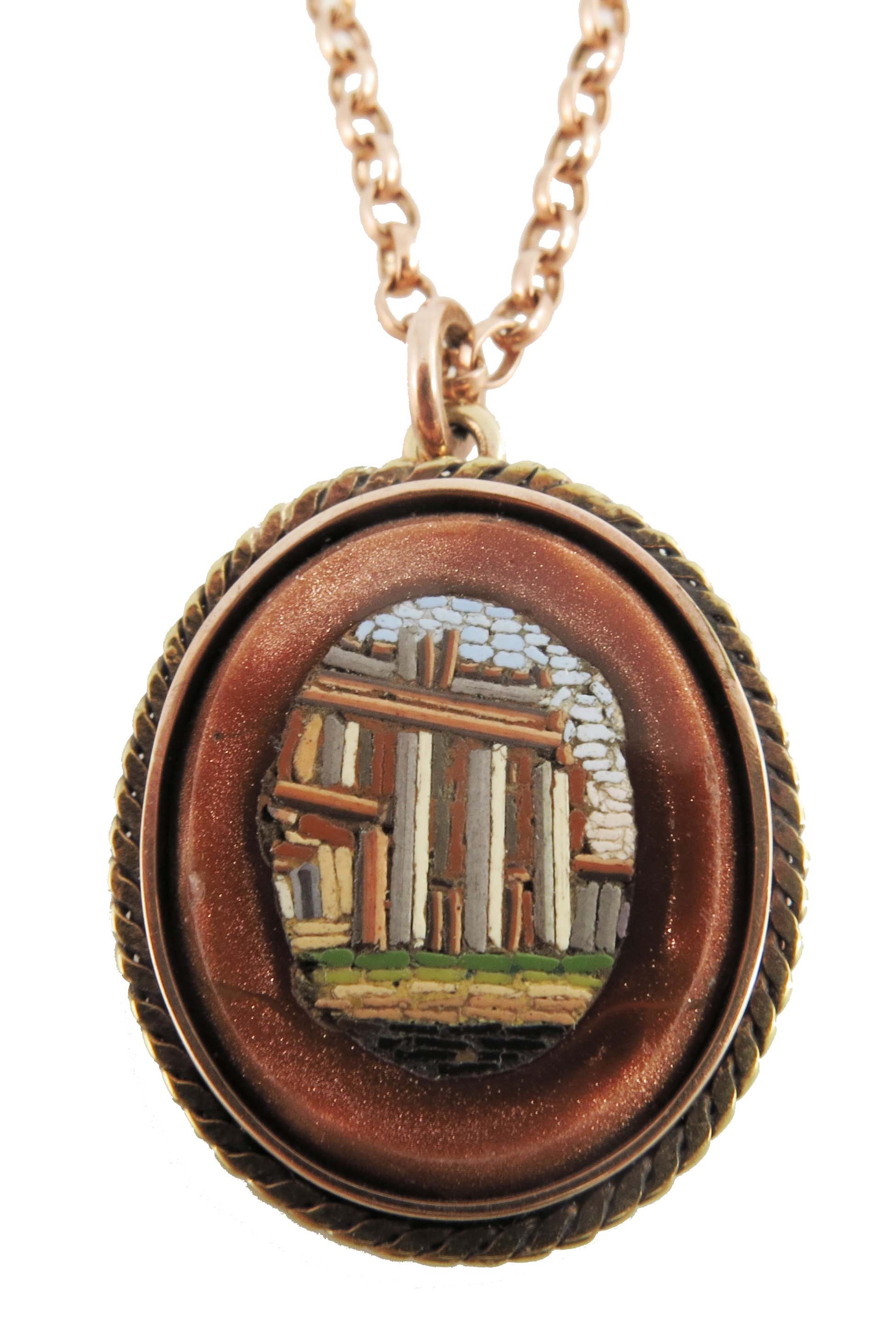 An early 20th century micromosaic pendant, with sunstone surround, suspended from a 9ct gold chain, length of pendant 3cm, length of chain 41cm, 10.9g