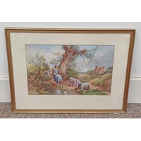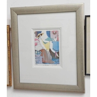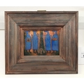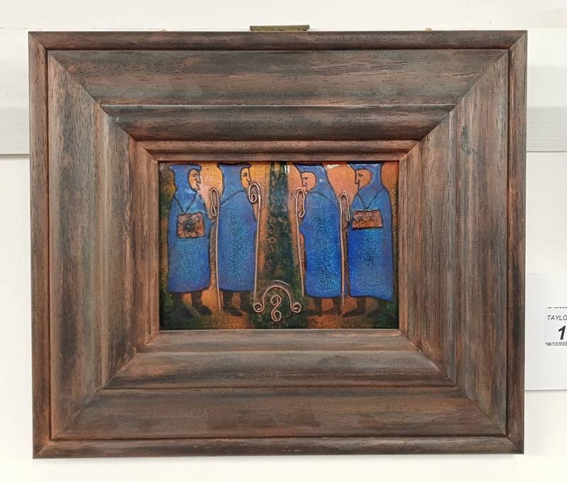 JOYCE KELLY ''PICTISH CLERICS'' LABEL TO REVERSE FRAMED ENAMEL ON COPPER 9CM X 12.5 CM