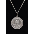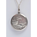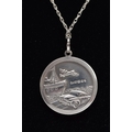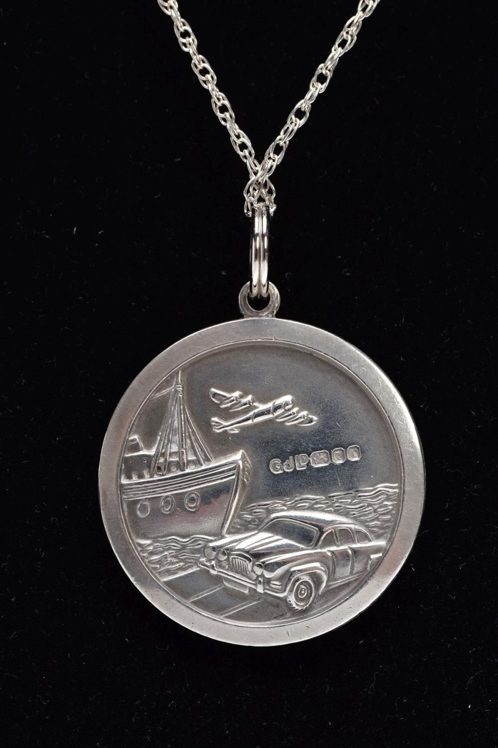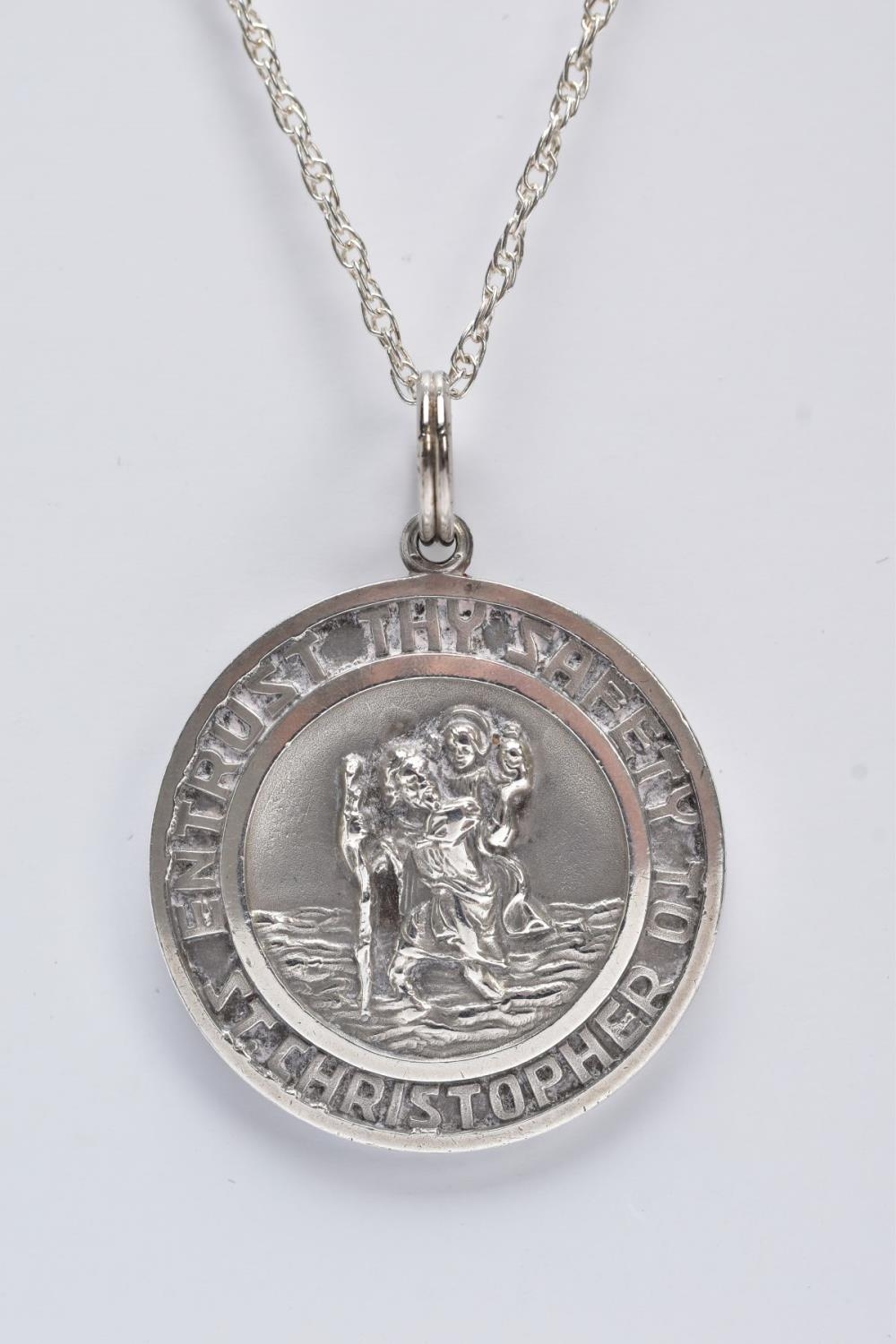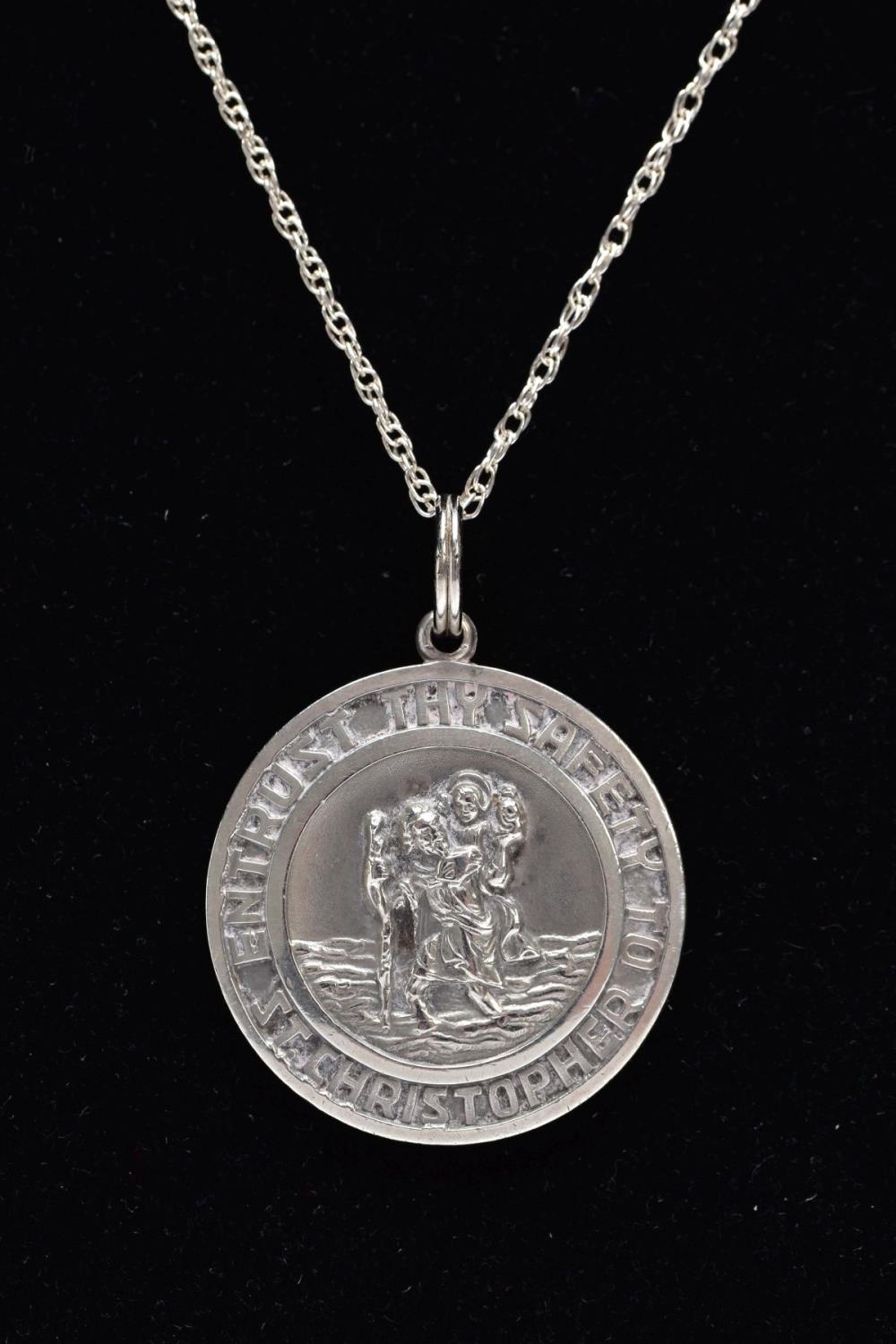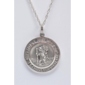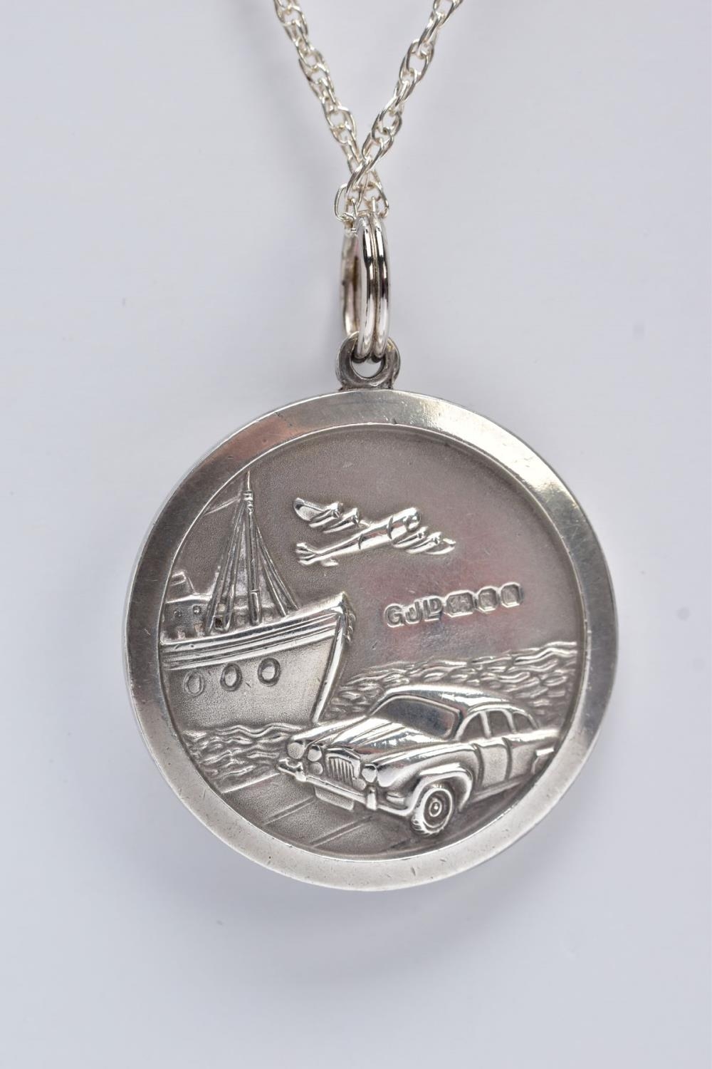 A GEORG JENSEN ST. CHRISTOPHER PENDANT NECKLACE, of a circular form with one side depicting St. Christopher inscribed 'Entrust thy safety to St Christopher' with the reverse depicting a boat, car and aeroplane, signed 'GJ Ld' hallmarked London 1972, approximate width 31.0mm, approximate gross weight 19.2 grams, suspending from a white metal Prince of Wales chain fitted with a spring clasp stamped '925', length 500mm (condition Report:- overall condition good, general light wear)