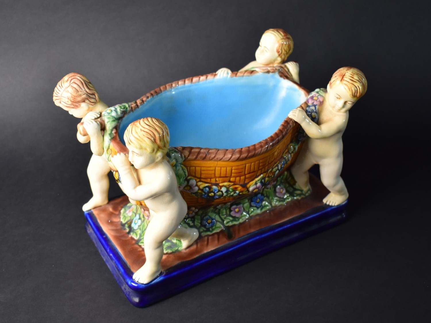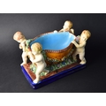 A Reproduction Majolica Glazed Table Centre in the Form of Four Cherubs Carrying Basket, 29cms Long