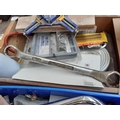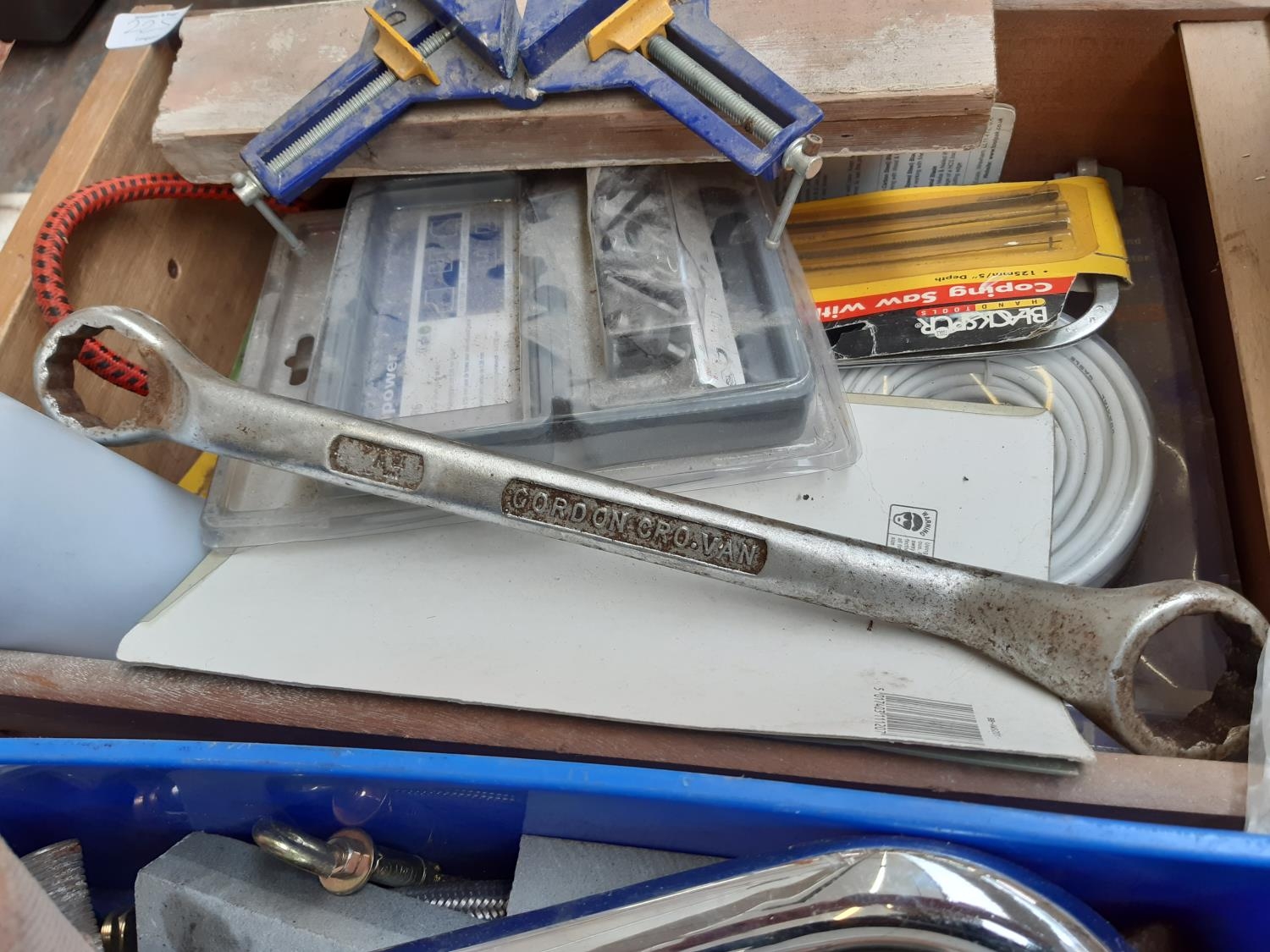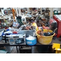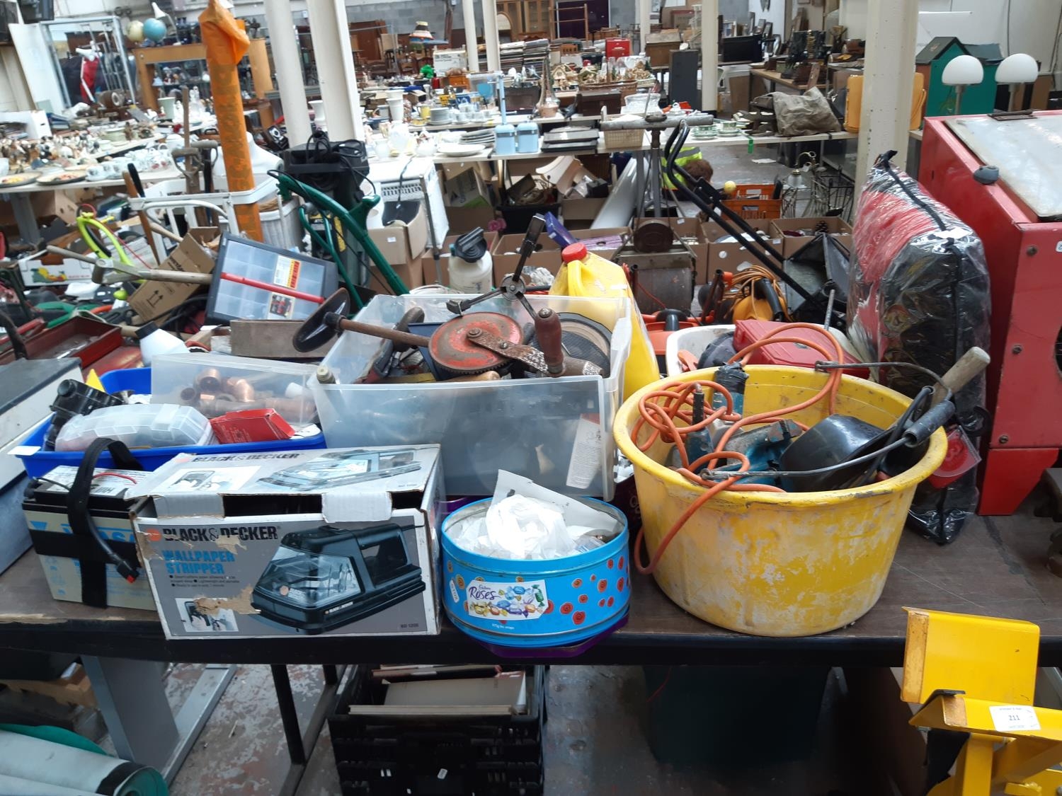 A LARGE MIXED LOT OF BOXES AND BUCKETS CONTAINING HAND DRILL, COPPER PIPE FITTINGS, GORDON SPANNER, ENGINE HONING TOOL, BLACK & DECKER DRILL ETC.
