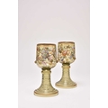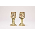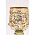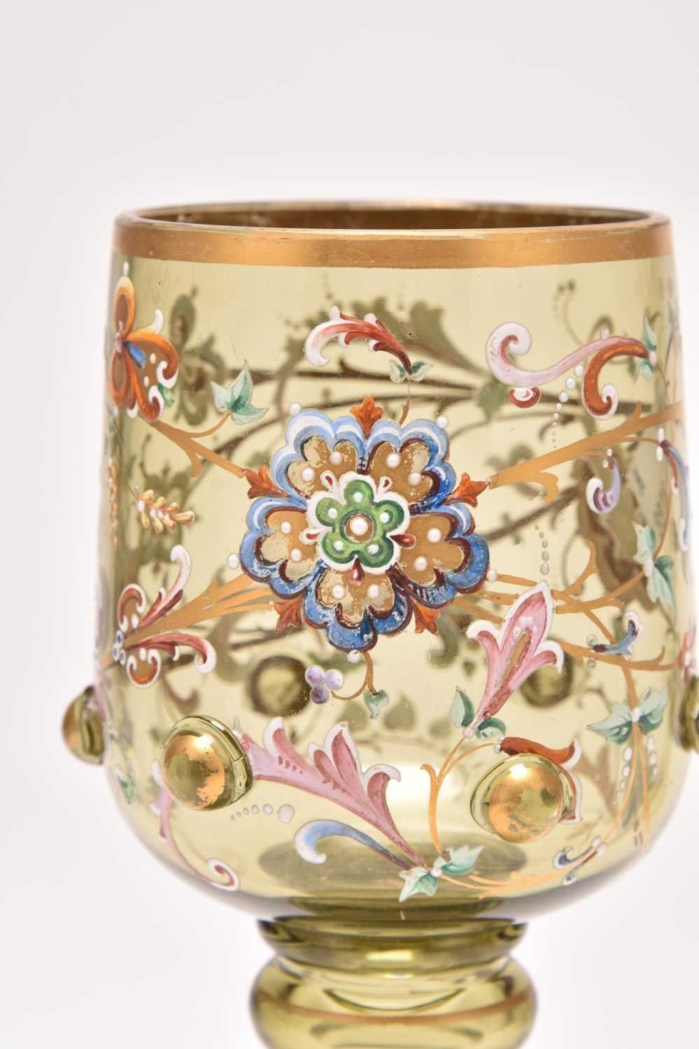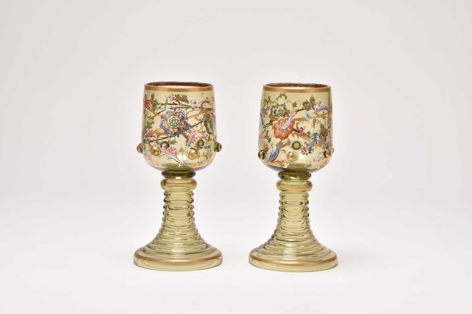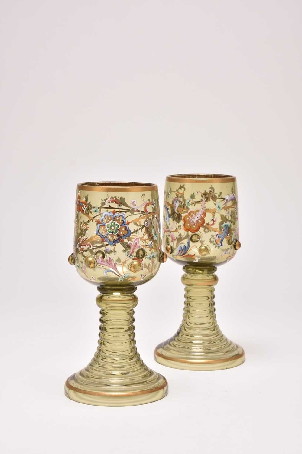 A pair of Bohemian green glass roemers, late 19th century, of oversized form, the tall bowls detailed with scrolling floral enamels, the lower body of the bowl with applied gilded prunts, set on ribbed circular stem and foot, 21.2cm high (2)
