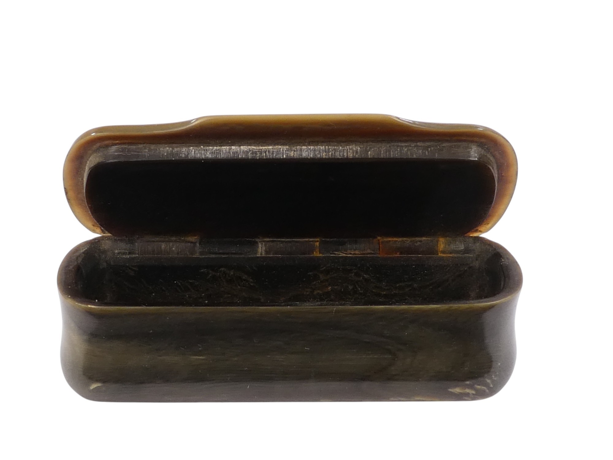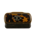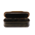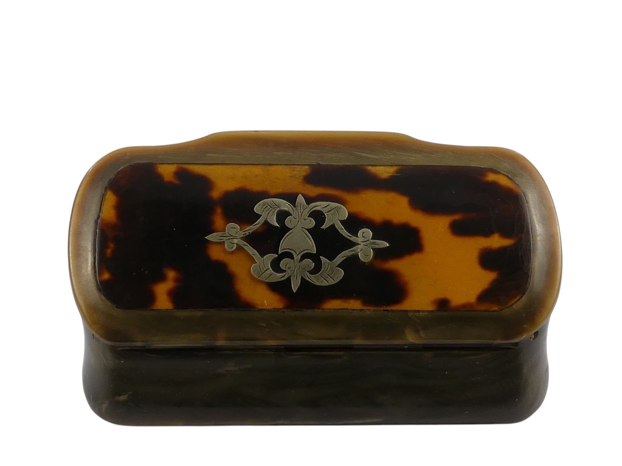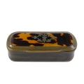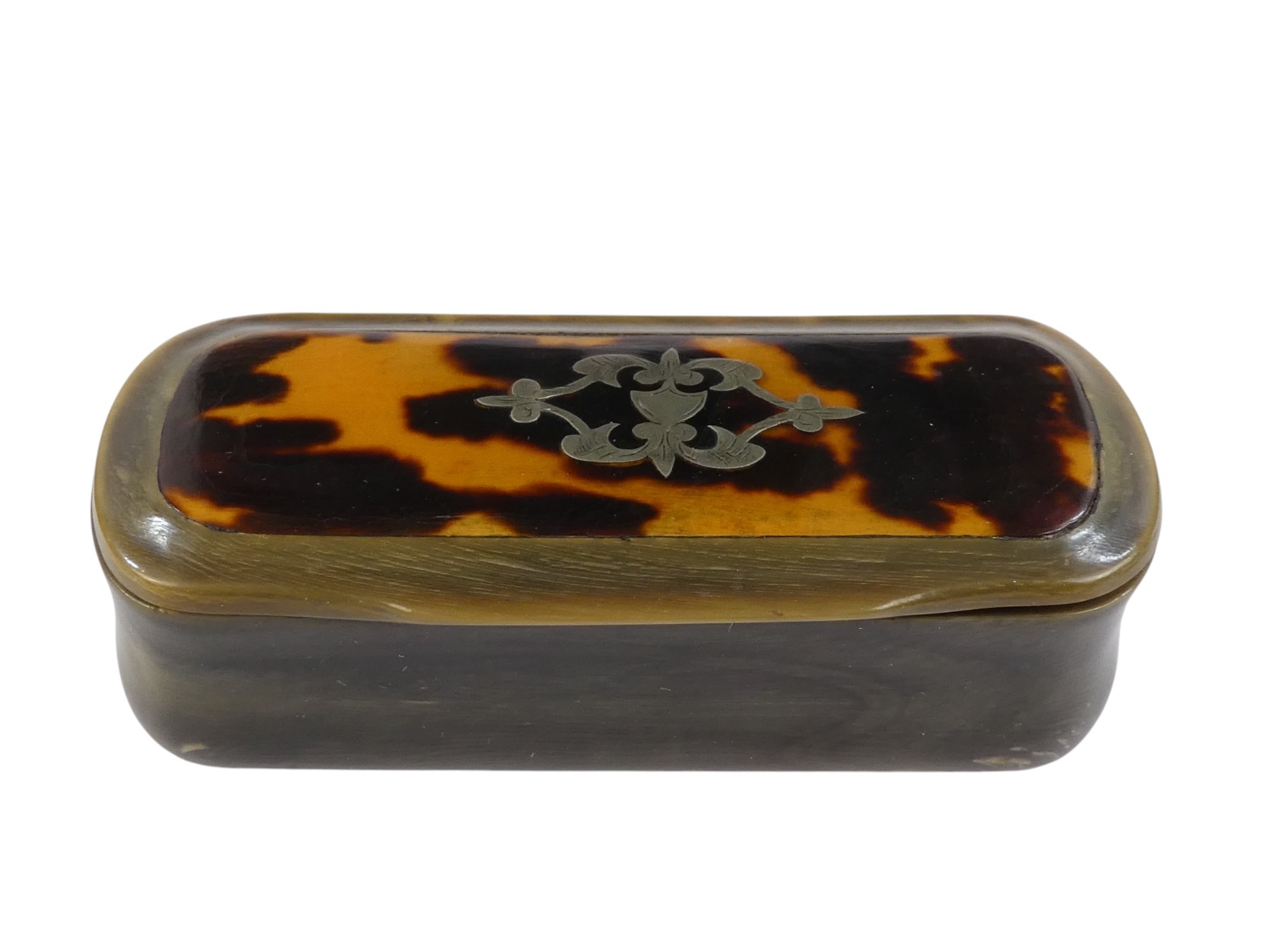 A 19th century horn and tortoiseshell snuff box - the rectangular cover set with a white metal foliate panel, 8cm wide.