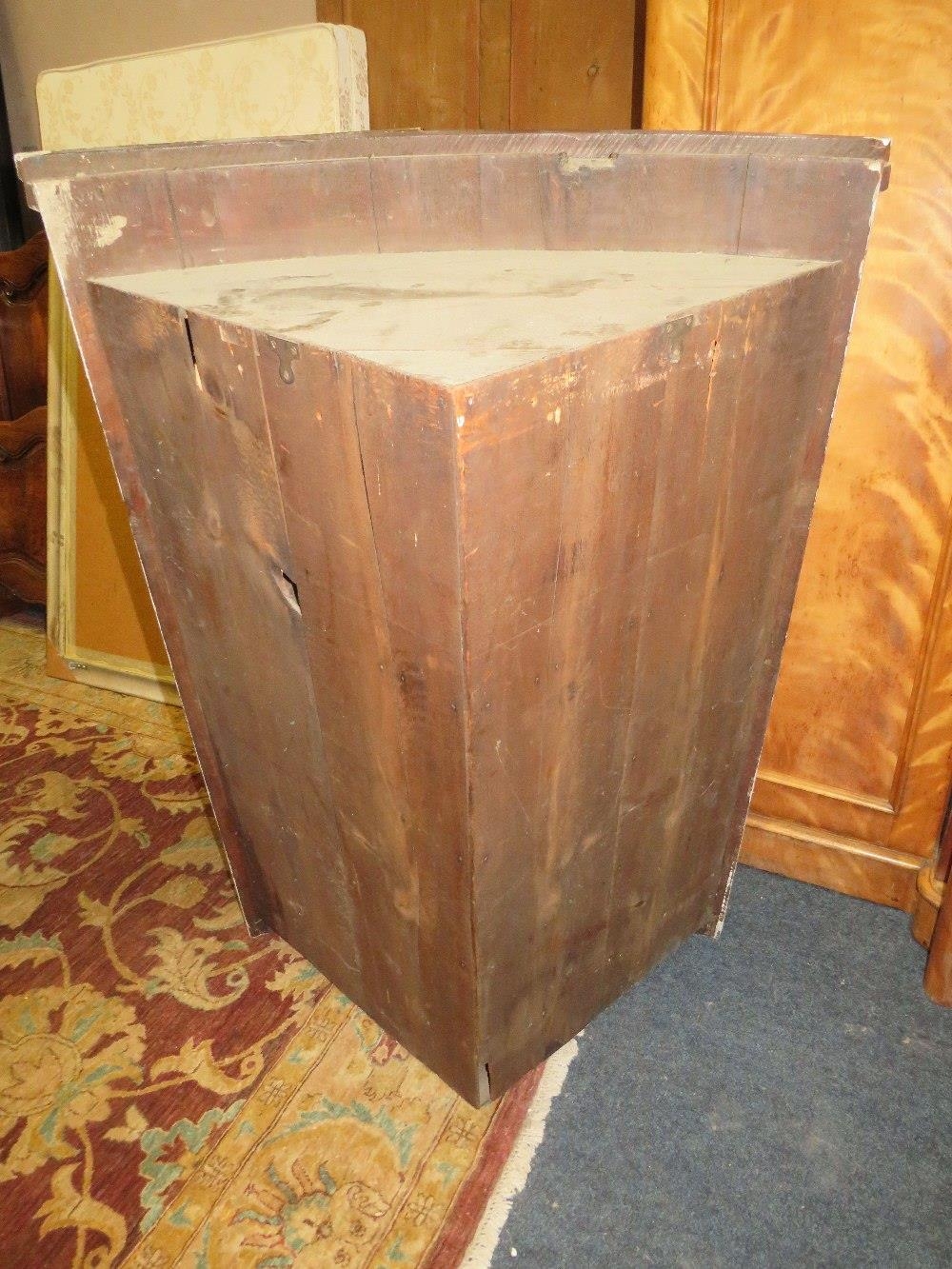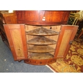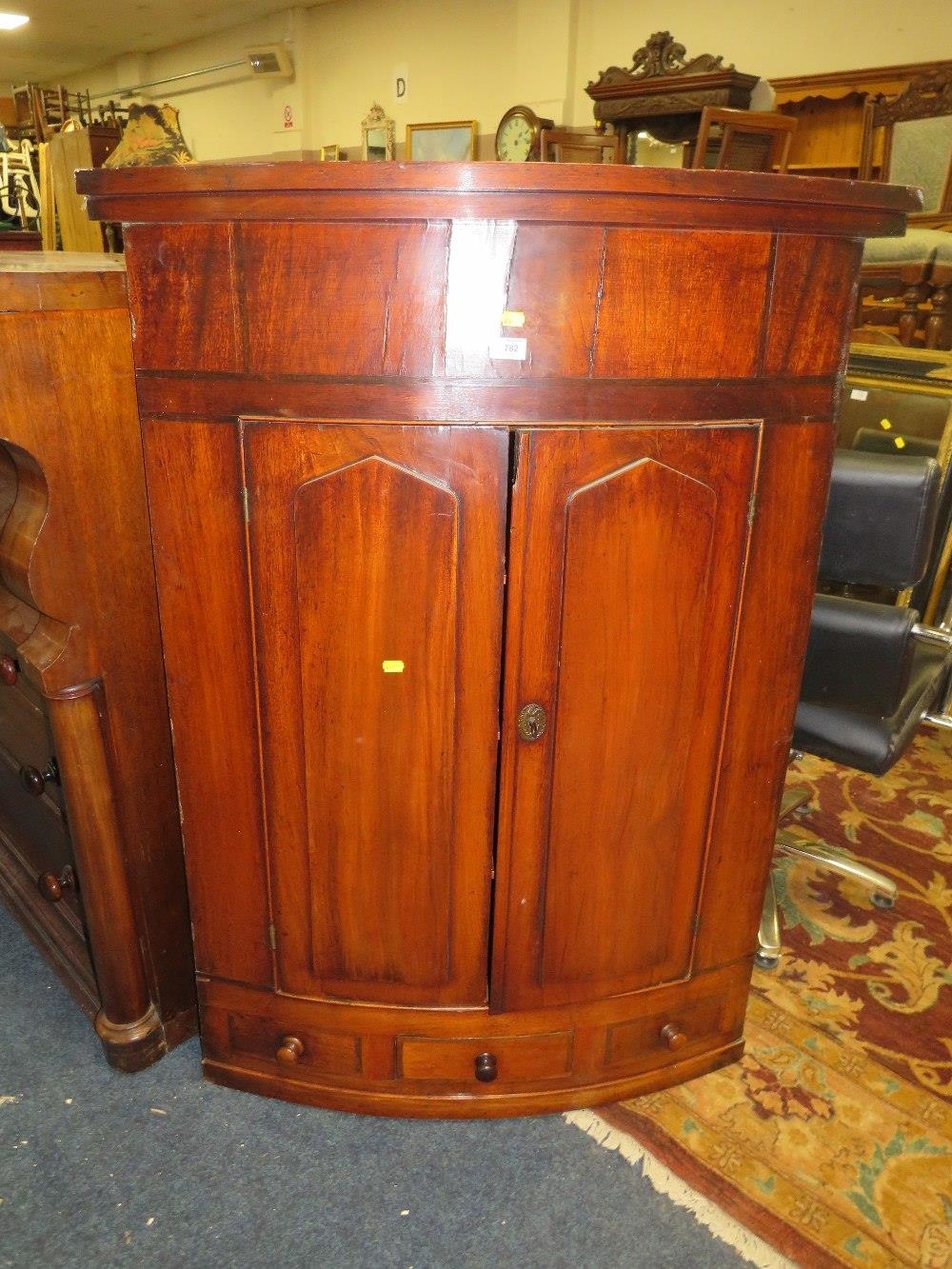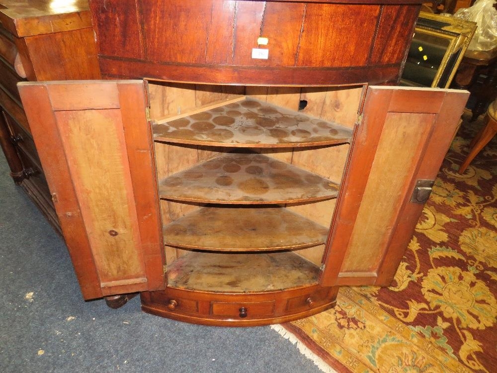 AN ANTIQUE MAHOGANY BOW FRONTED HANGING CORNER CUPBOARD W-89 CM