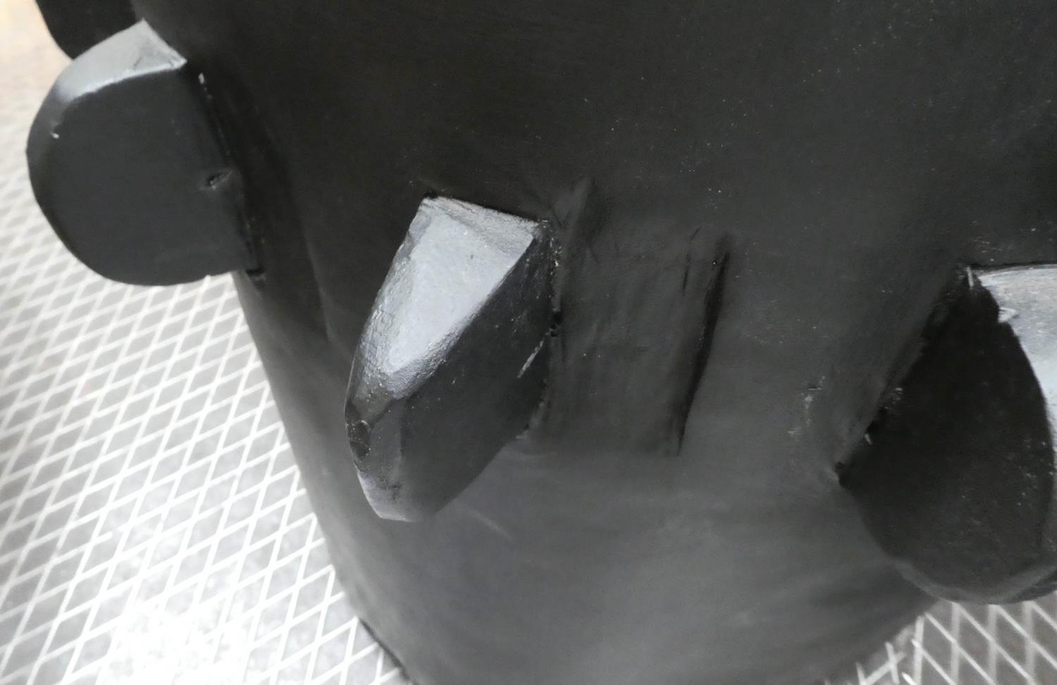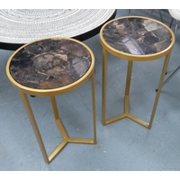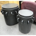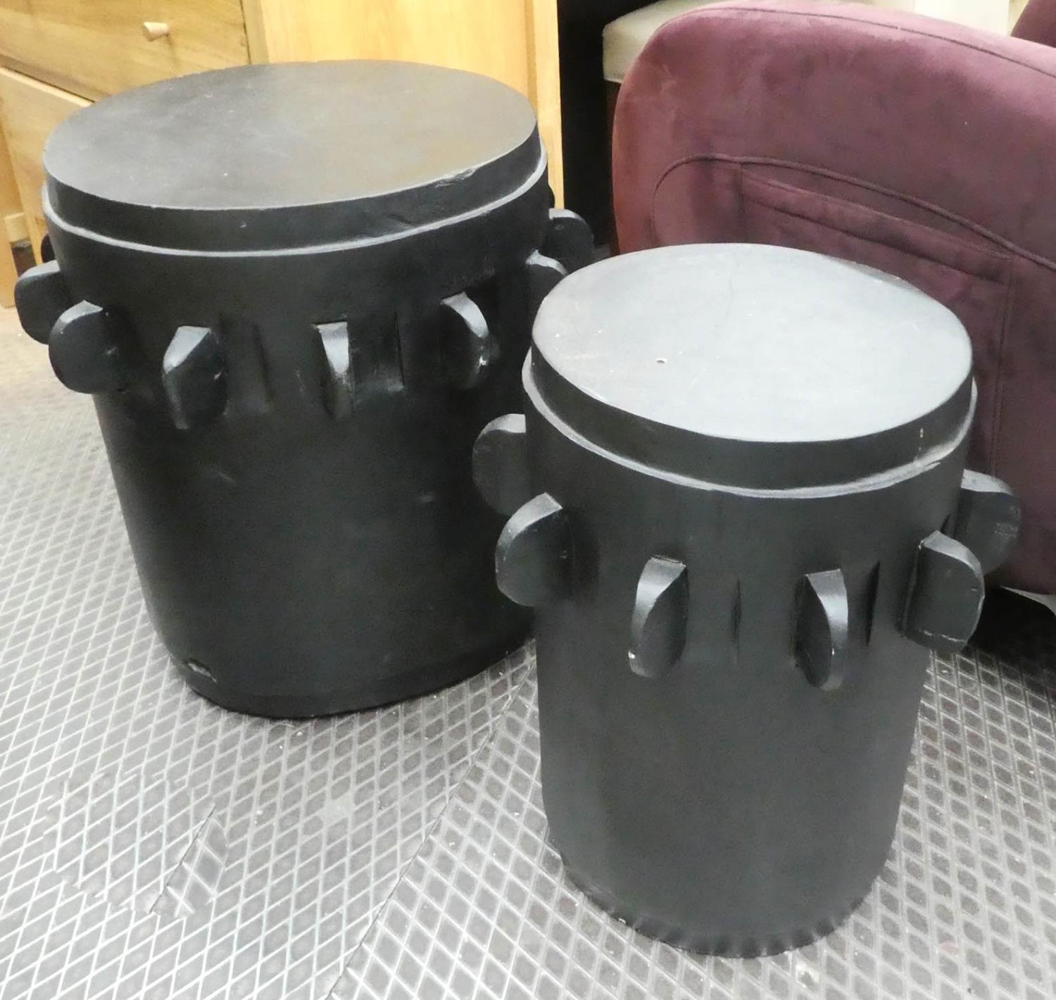 DRUM TABLES, a graduated pair, ebonised finish, 57cm H x 52cm diam.