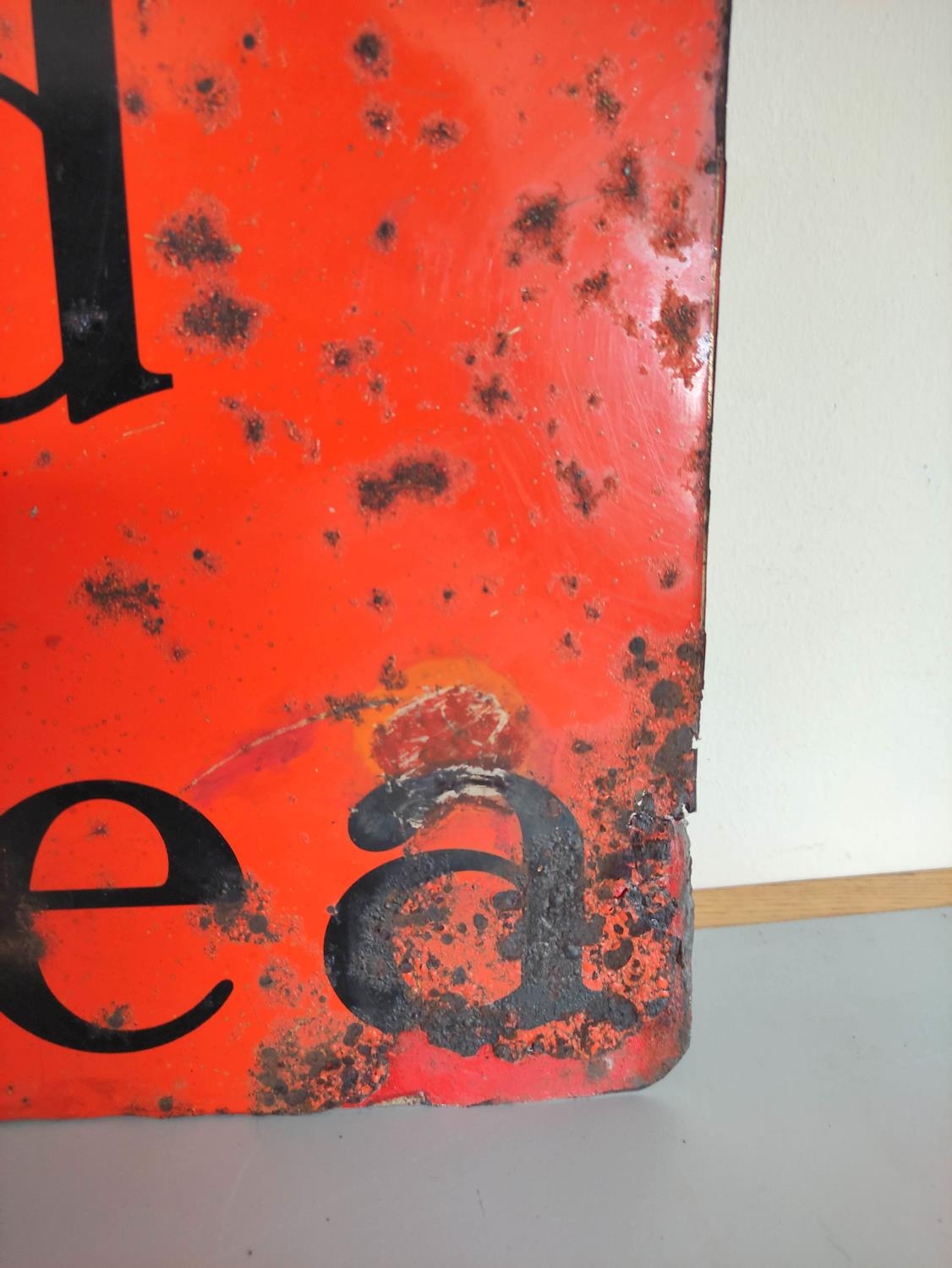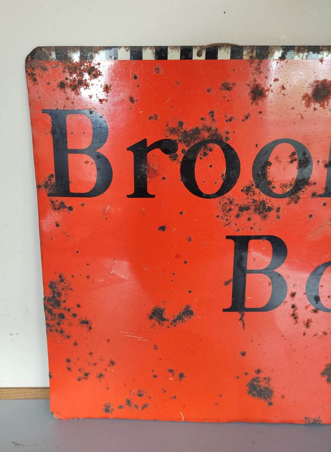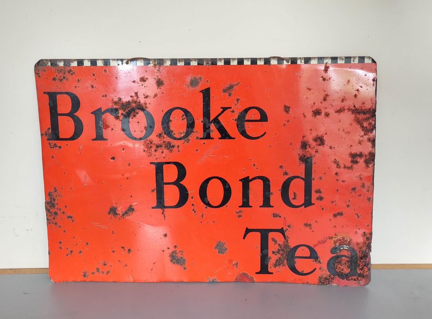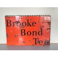 Vintage 1930s/40s Brooke Bond Tea enamel advertising sign. Featuring company text against an orange field with chequered top border. 45.5cm x 65cm.