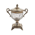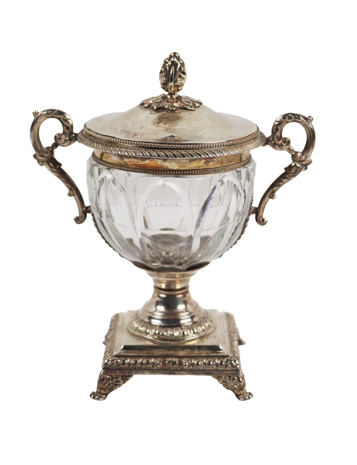 A rare 19th Century French Candy two handled Dish and Cover, the removable lid with floral finial, gadroon edge, scroll handle, creuset cut crystal center on square base with paw feet, approx. 20cms (8") high, hallmarked Paris, by Louis Dupre, approx. 19 ounces (all together). (1)