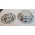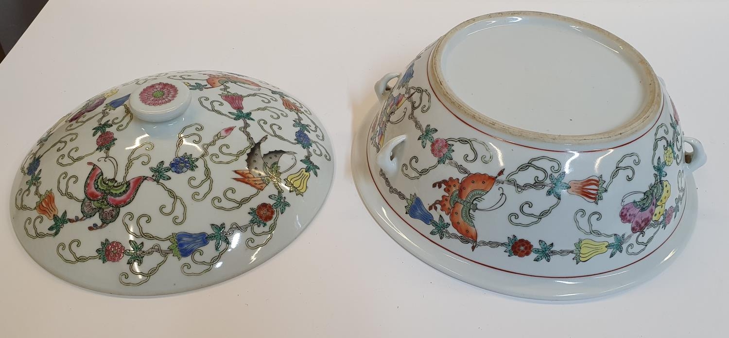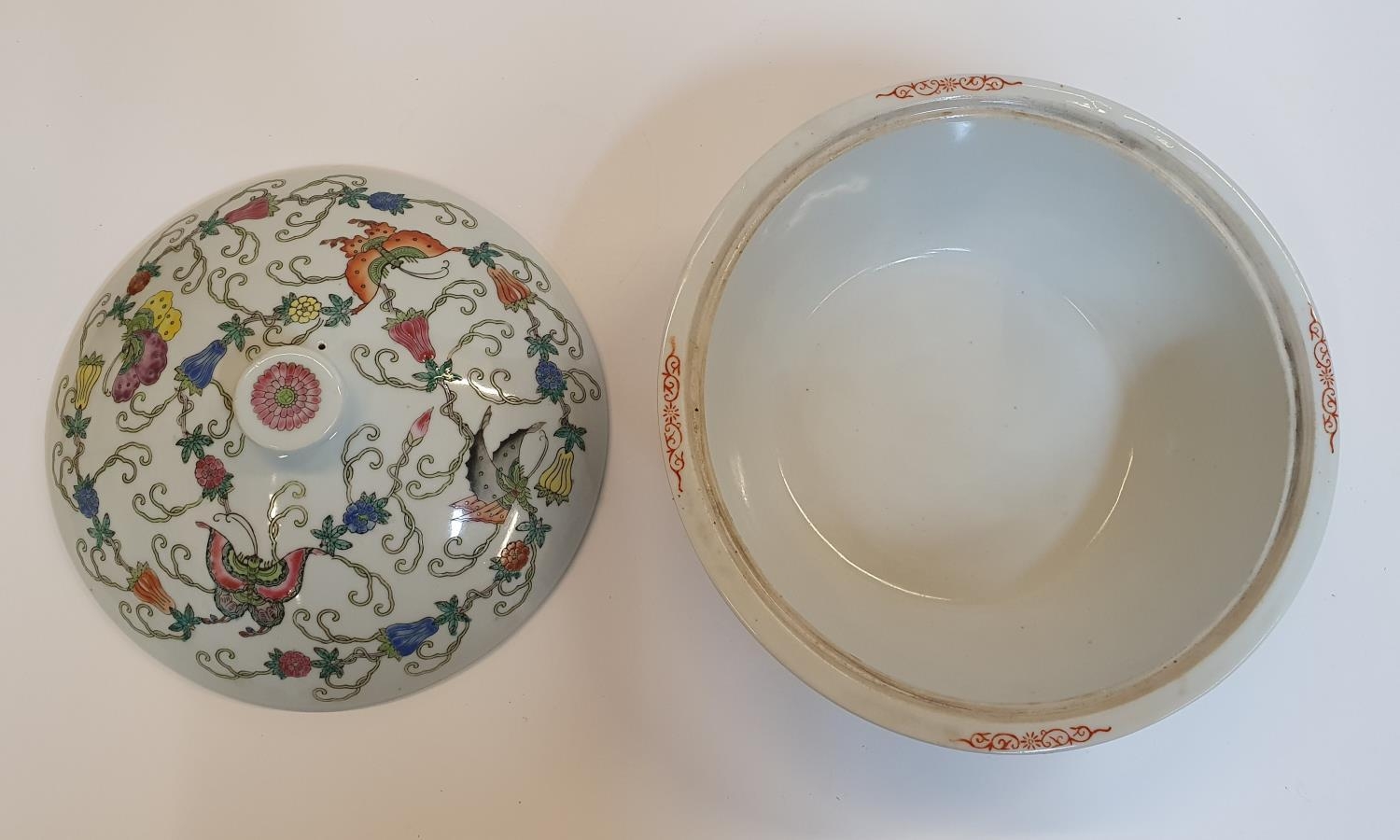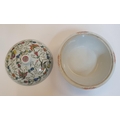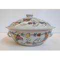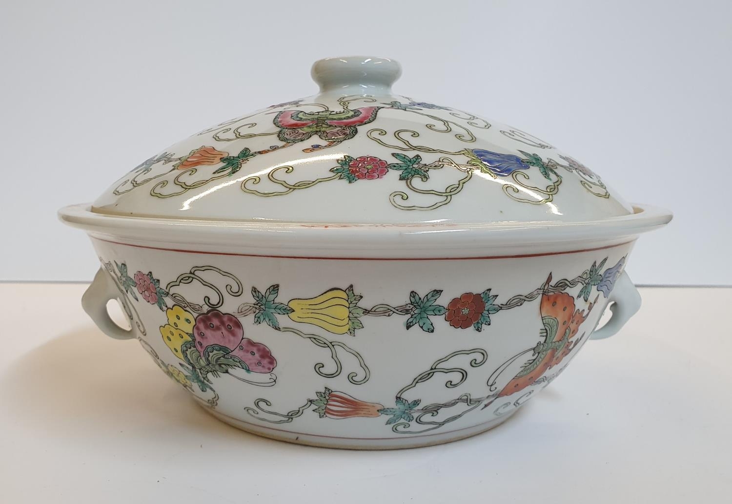 Good quality, unmarked, circular serving pot with lid, the pot decorated with butterflies & flowers