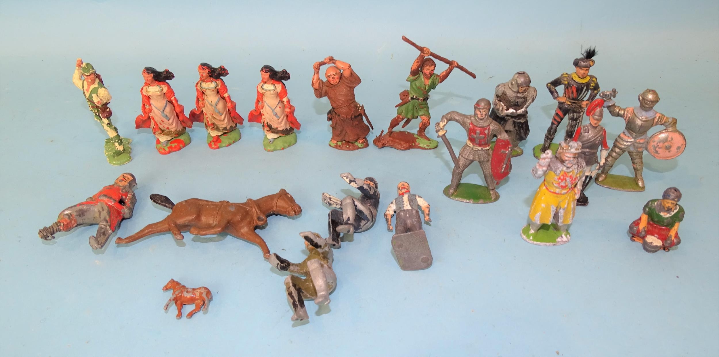 Herald plastic figures: Robin Hood, Maid Marion (x3), Little John (a/f) and Friar Tuck, (x6), six lead medieval knights and other lead figures.