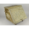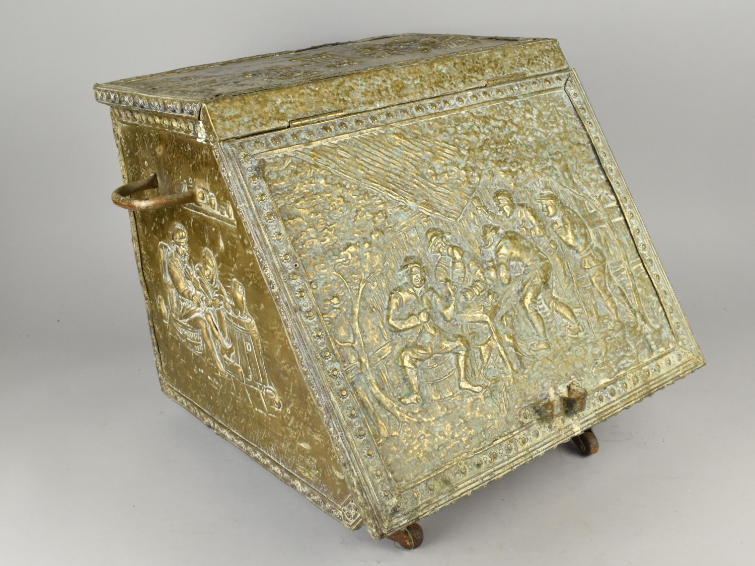 An Early 20th Century Brass Coal Scuttle, The Panelled Decorated in Relief with Tavern Scenes, Metal Liner, Two Carrying Handles, 41cms Wide