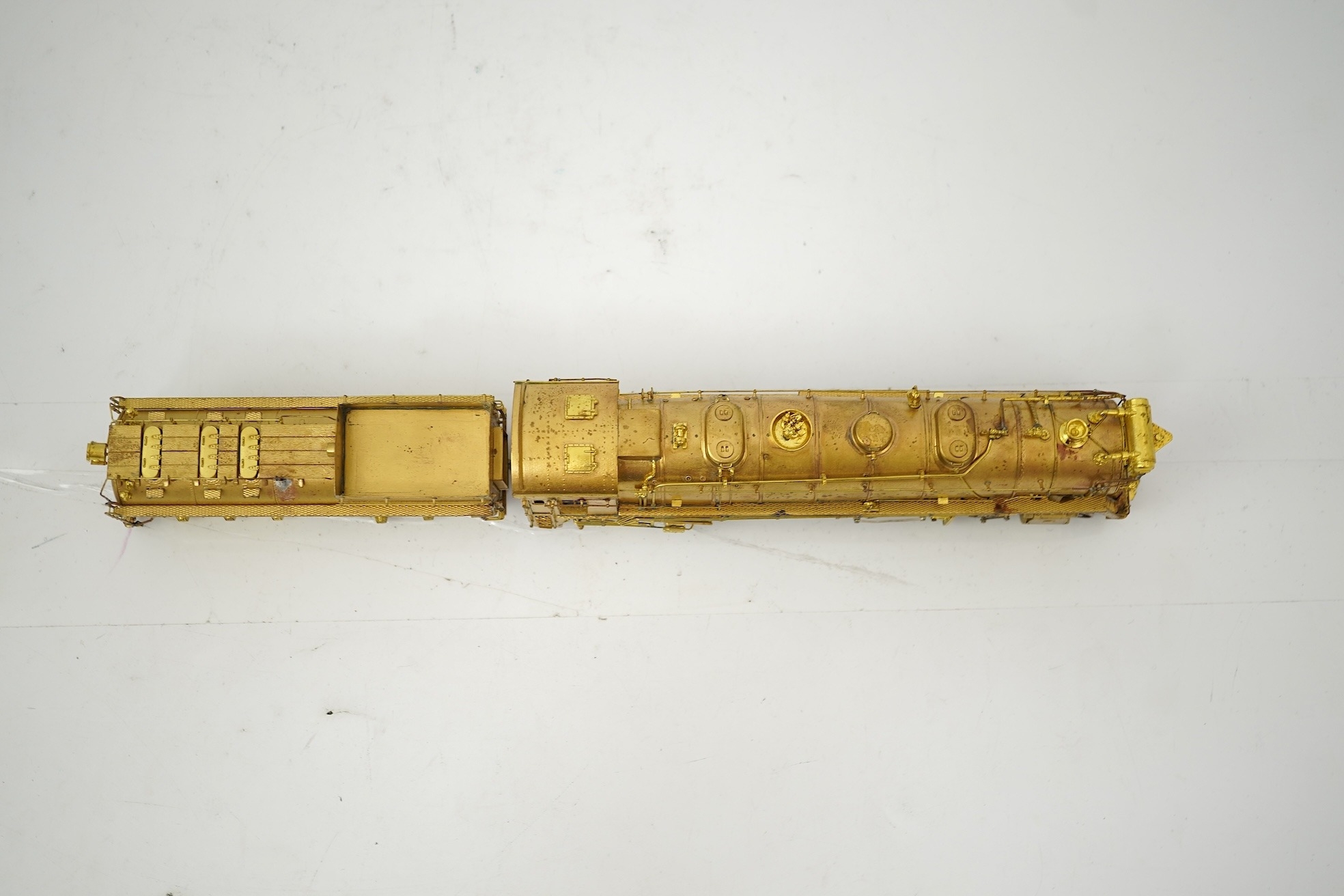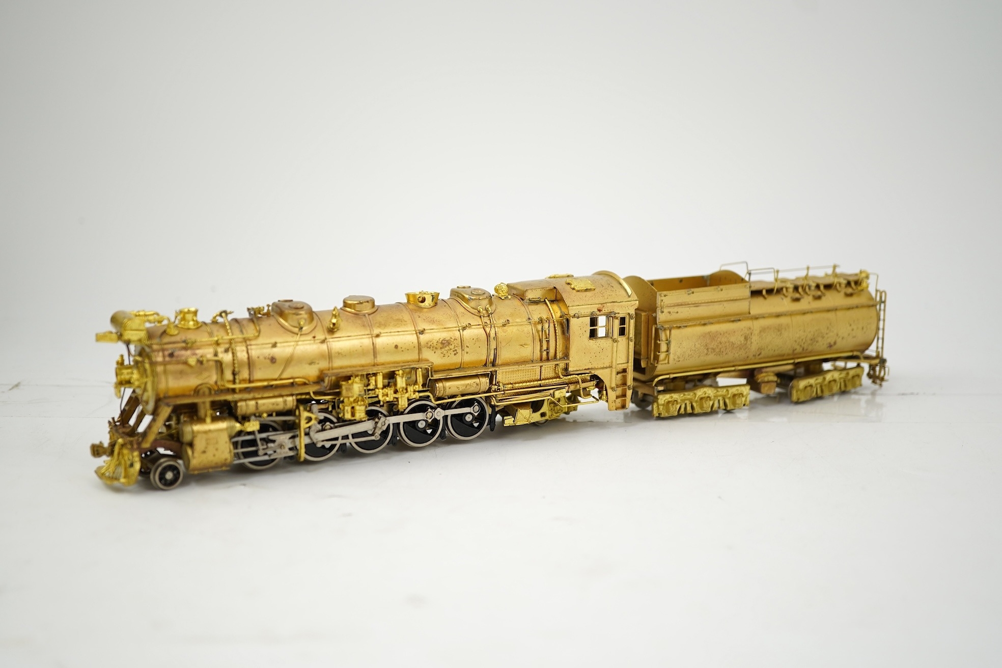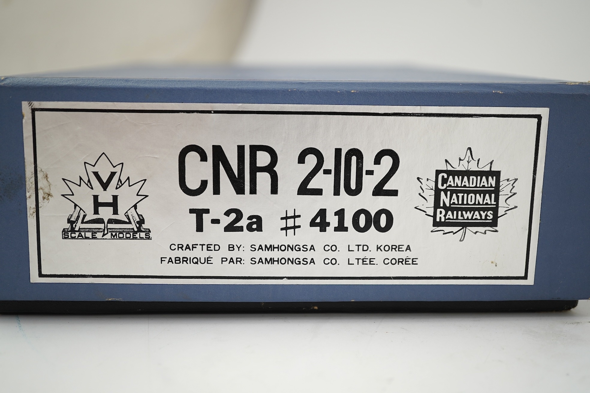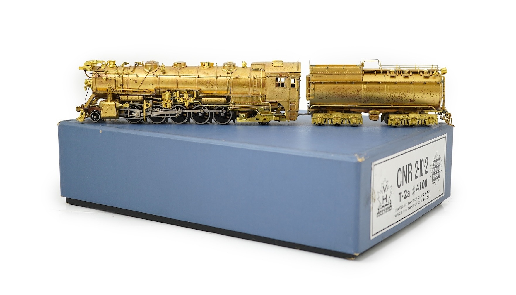 A boxed HO gauge VH Scale Models unpainted brass model of Canadian National Railways T-2a, 4100, 2-10-2 locomotive with bogie tender, powered for two rail operation.