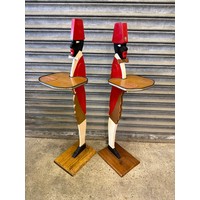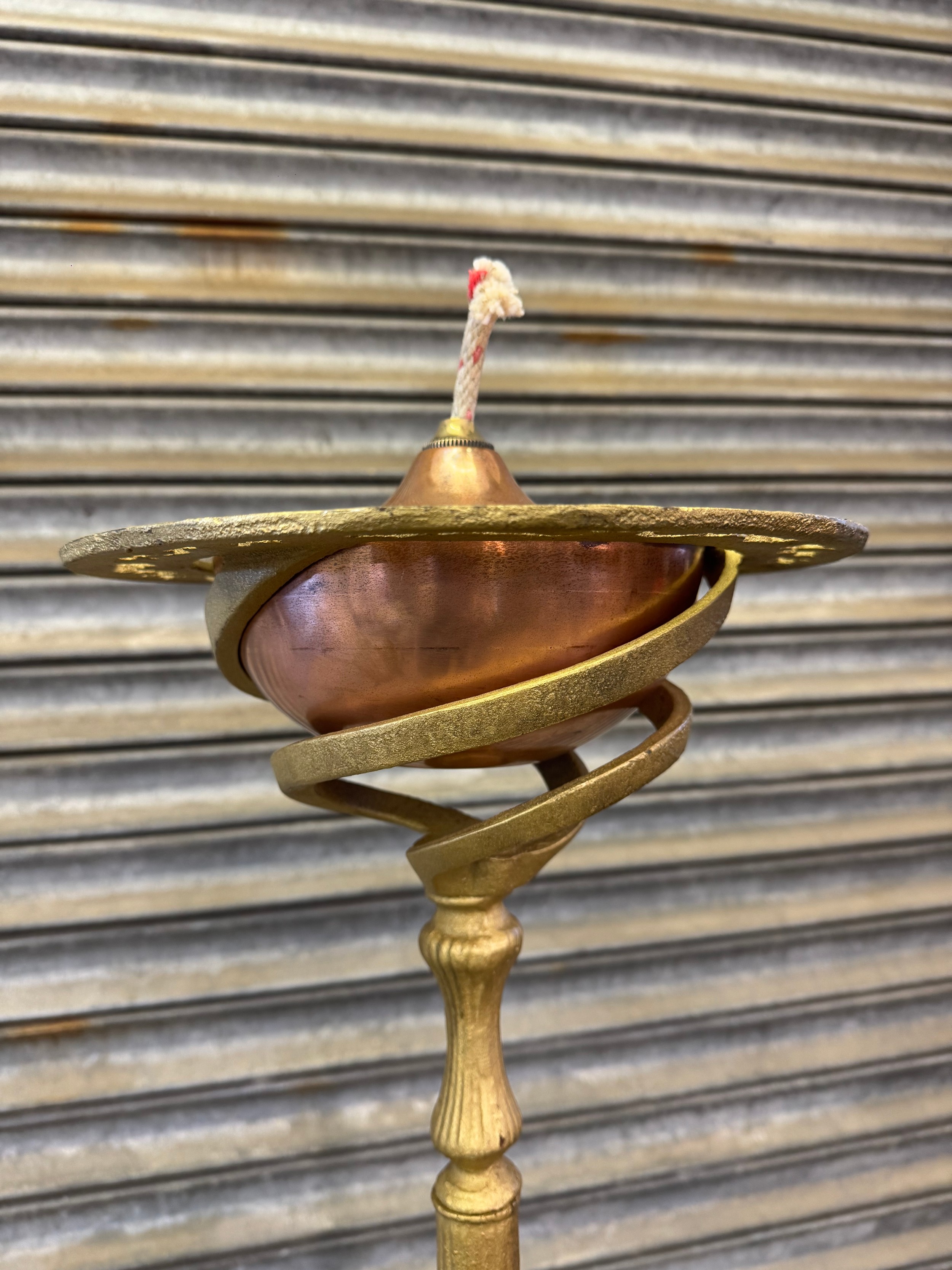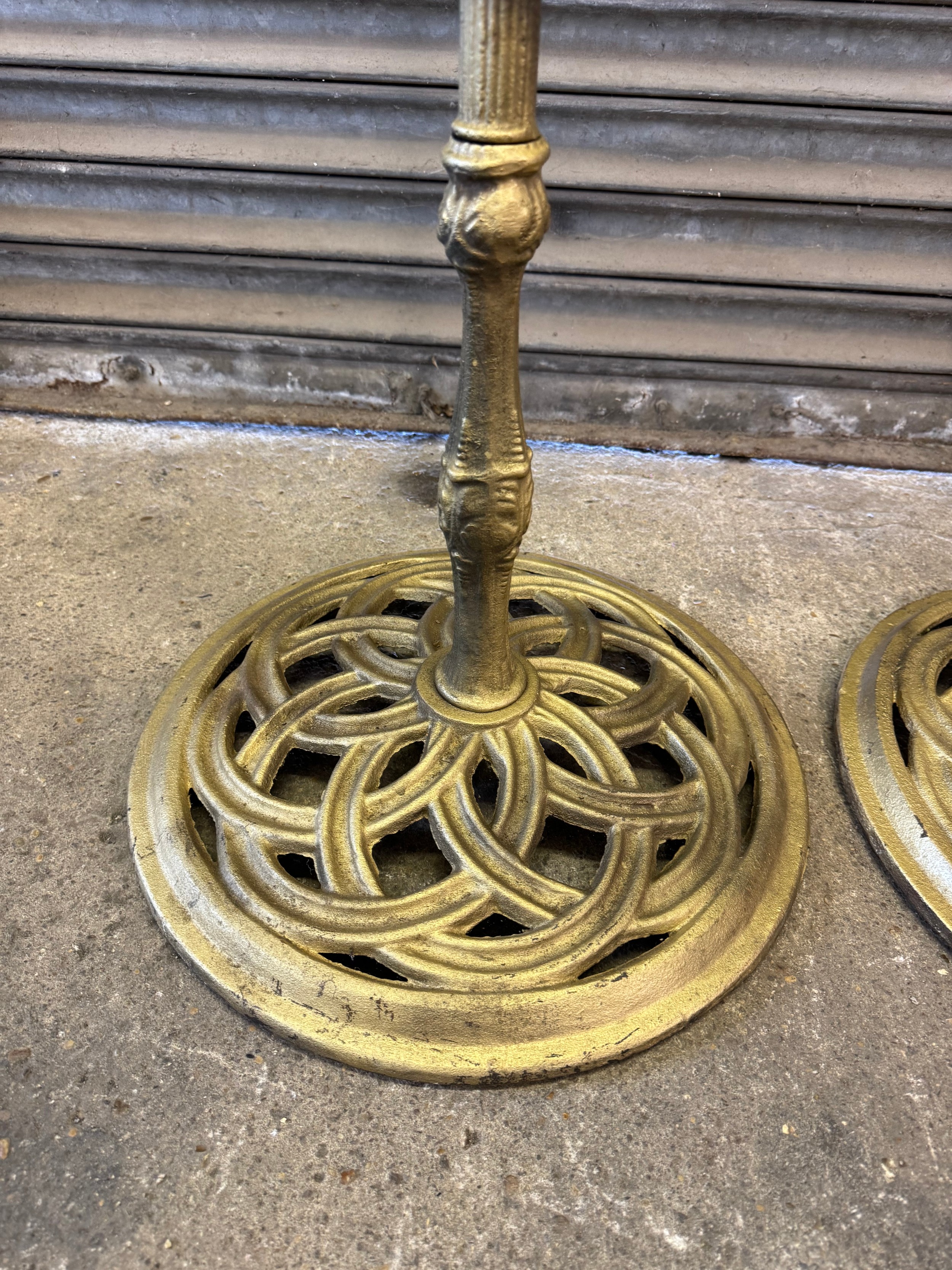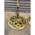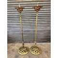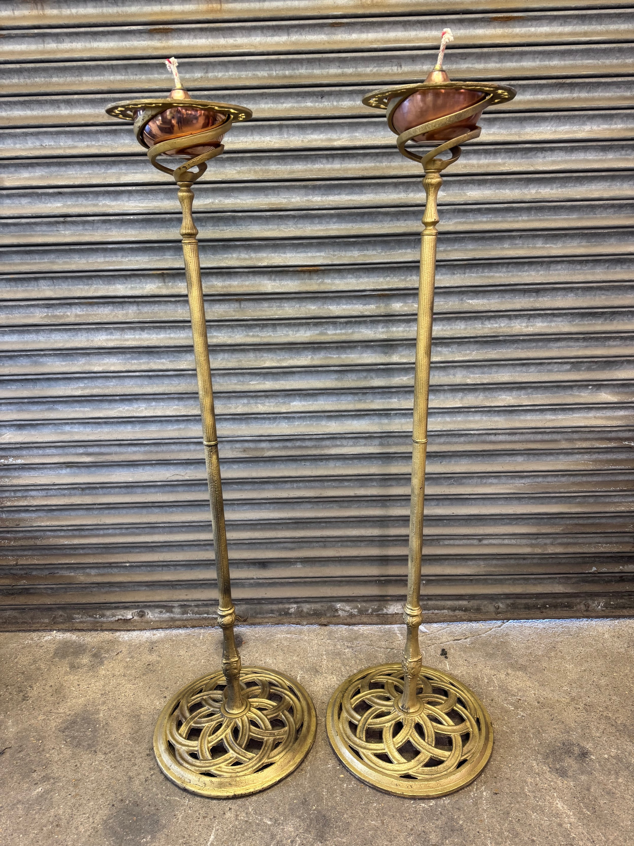 A pair of cast iron oil lamp stands, each with a copper burner - stands painted a gold colour.