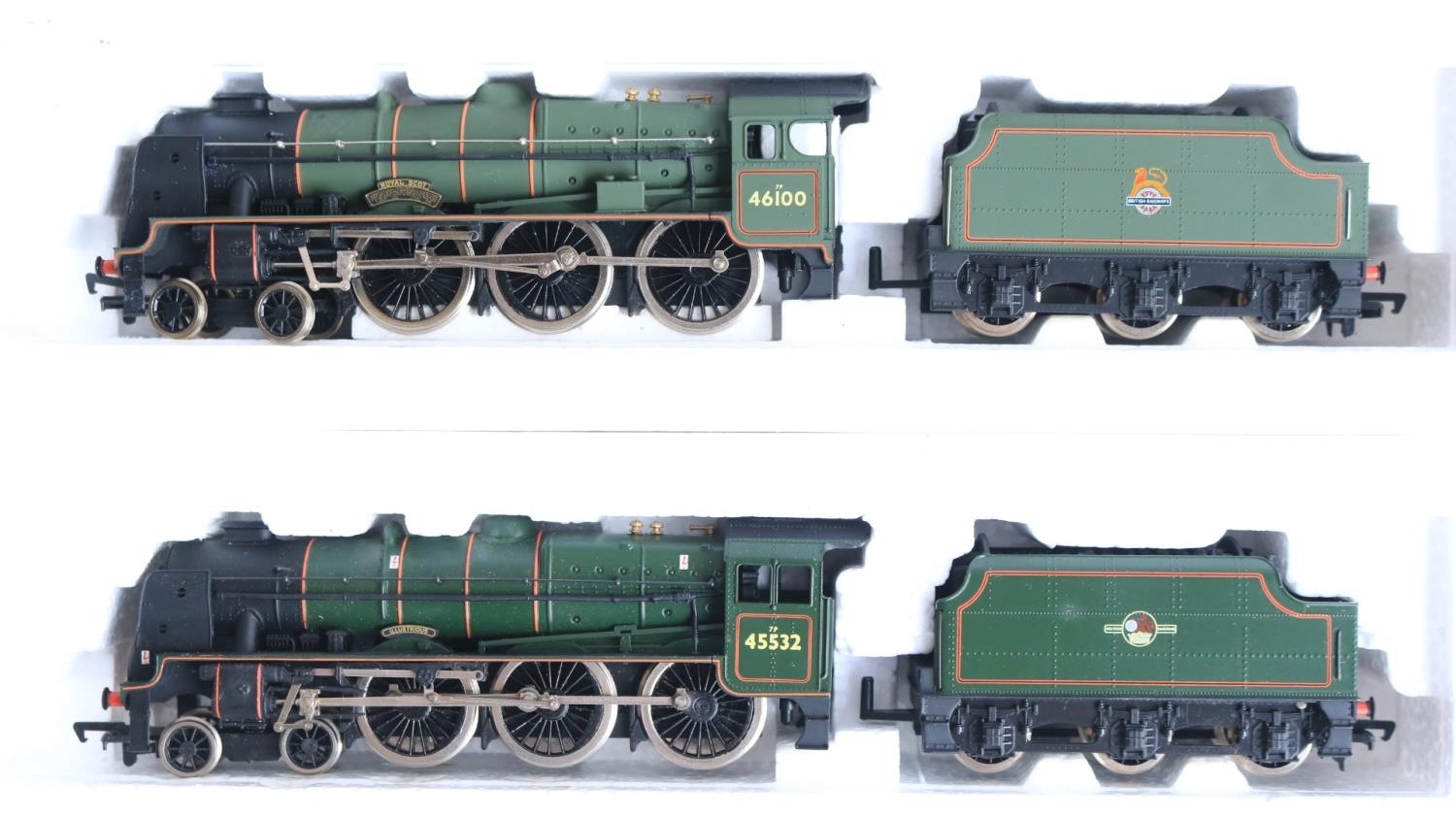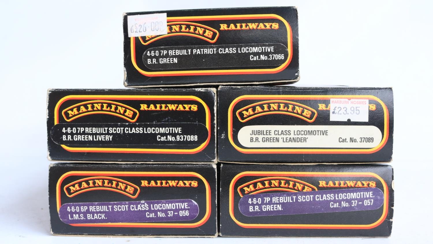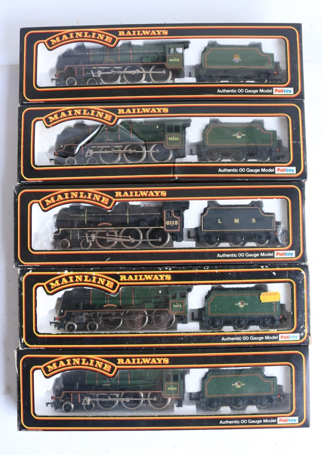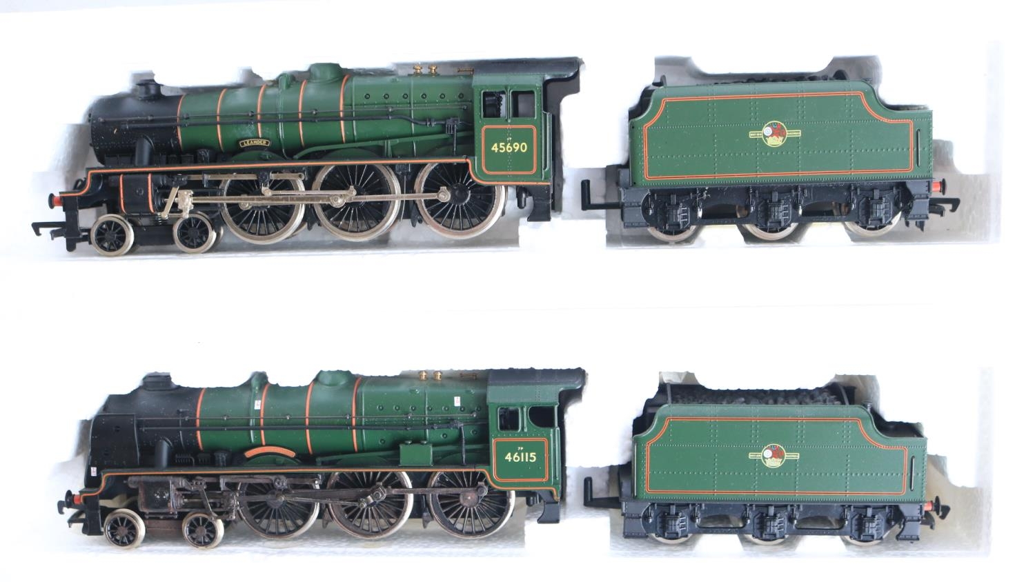 Five boxed OO gauge electric steam locomotive models from Mainline to include Jubilee Class 45690 'Leander' (some marks to right rear side boiler area, see photos, likely from extended storage in polystyrene tray, possibly removable) and 4x 4-6-0 7P Rebuilt Scots to include 46115 'Scots Guardsman' (appears to have home applied weathering to running gear), 45532 'Illustrious' (damage to box clear viewing panel), 46100 'Royal Scot' (in matt finish) and LMS black 6115 'Scots Guardsman' (similar issue to Leander, see above), all models completely removed from packaging and inspected and all in at least good overall condition with issues noted above, all with instructions, boxes generally good