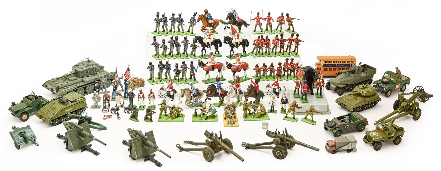 Vintage toys. Miscellaneous Dinky and Britains' diecast and other military vehicles, mid 20th c and later, and miscellaneous Britains Ltd Deetail soldiers, etc