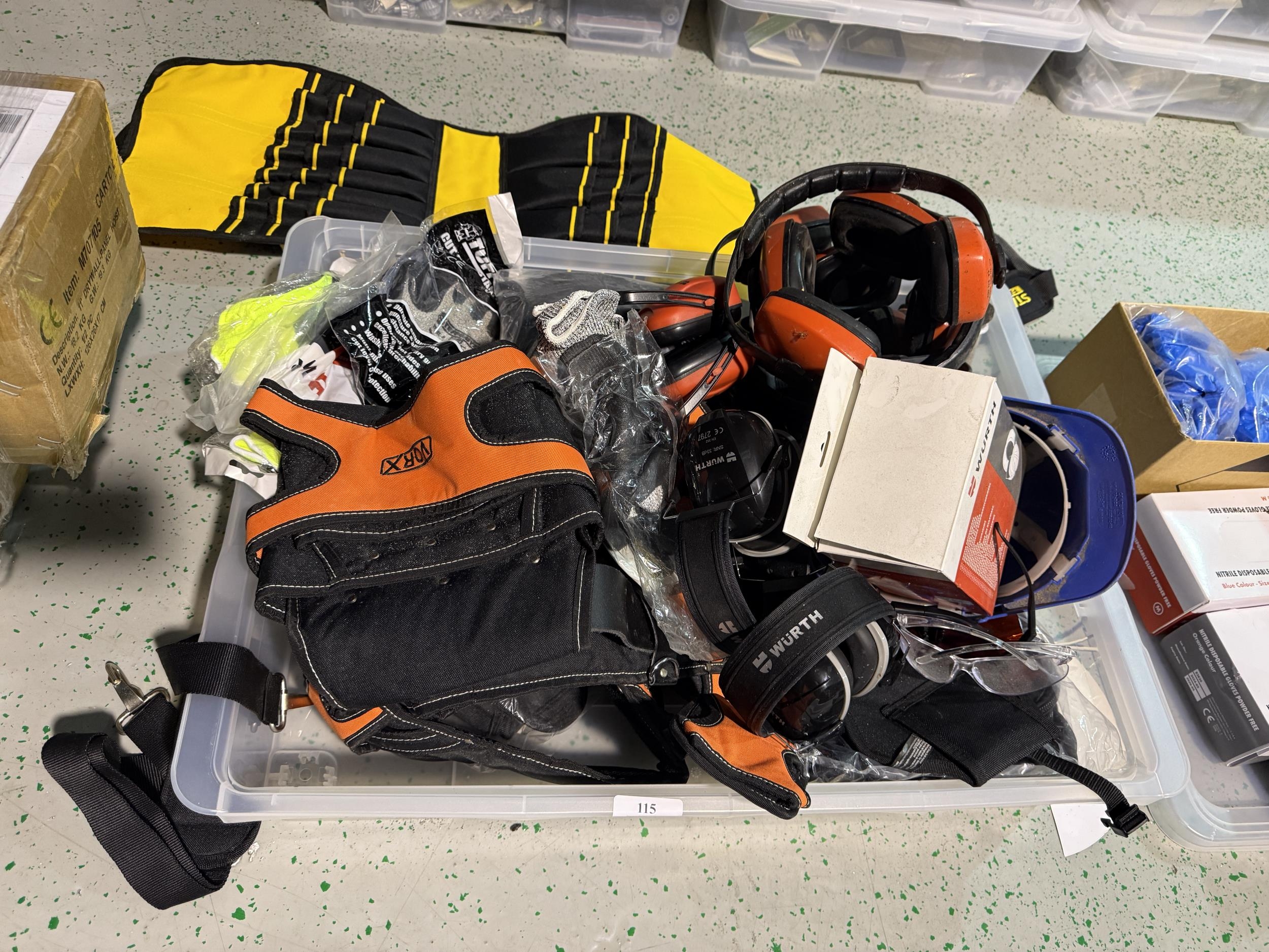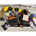 An assortment of tool belts and bags; personal protection equipment etc.