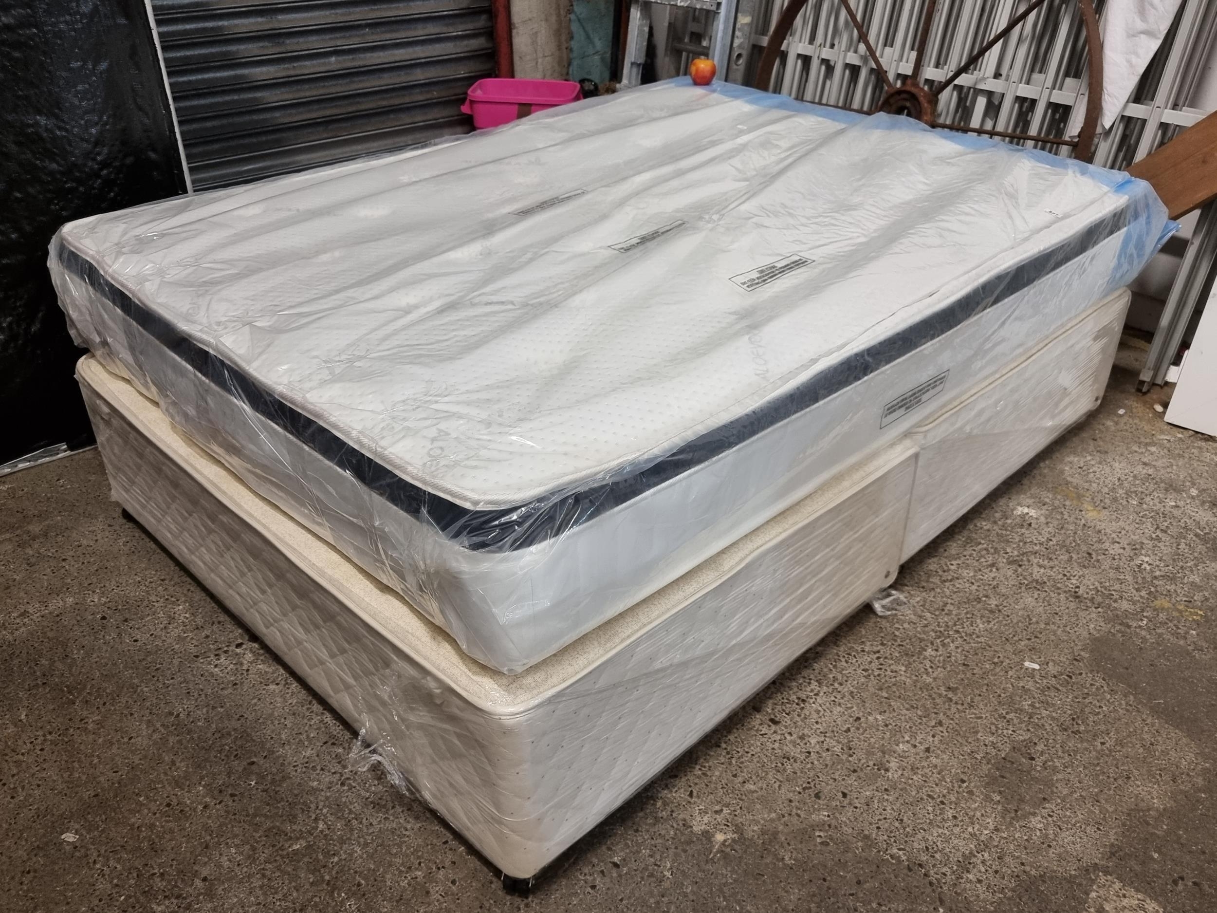 An AloeVera double mattress, accompanied by a split base, on castors. Measuring: 190 cm X 138 cm. Both unused and in original packaging.