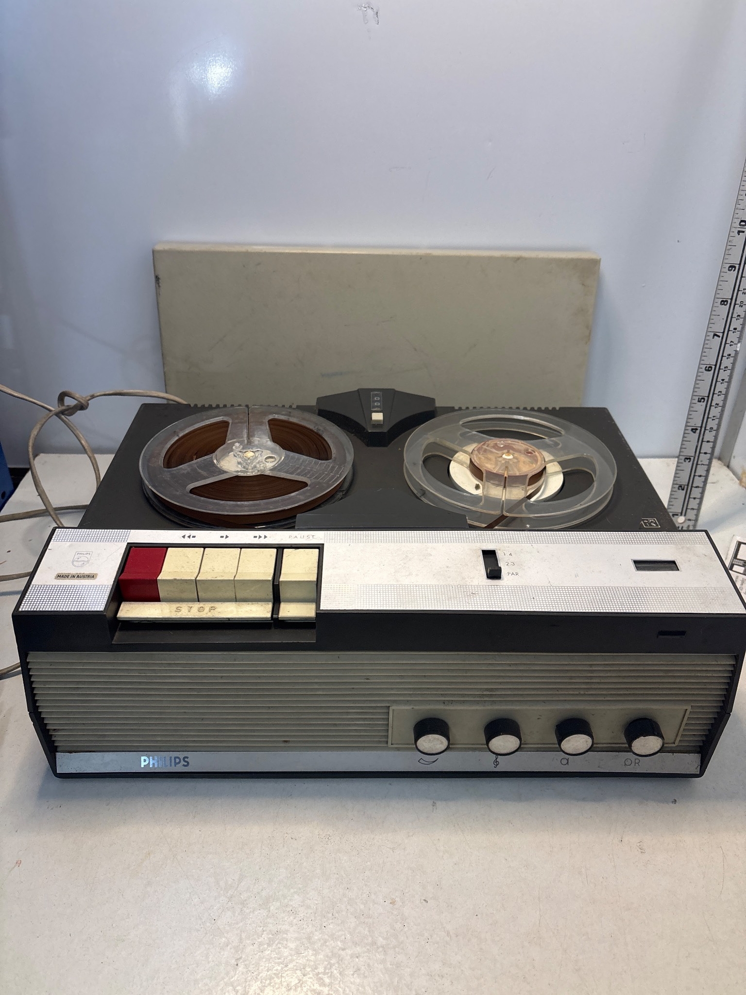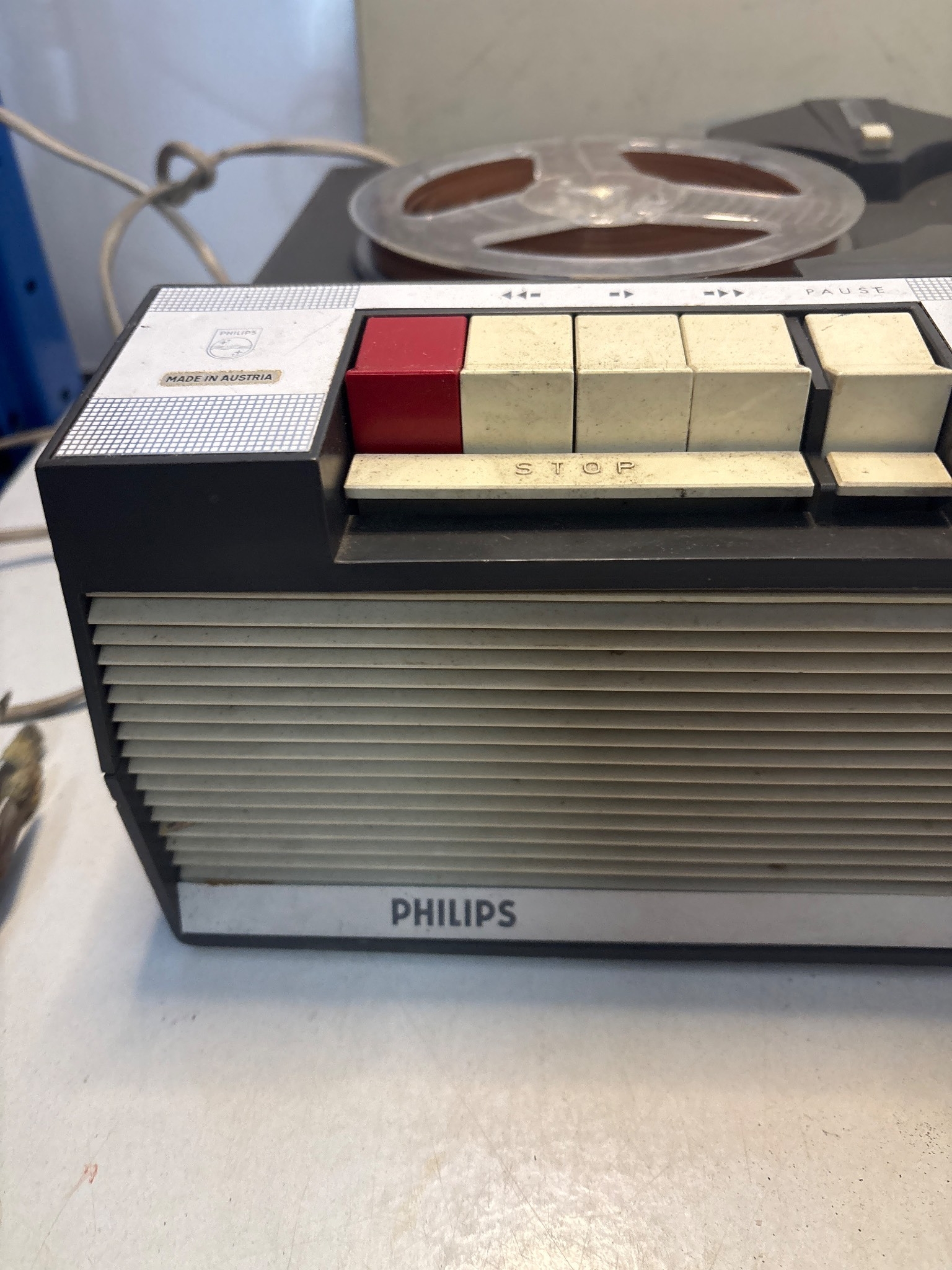 Philips reel-to-reel tape recorder featuring control buttons. Condition suggests it may require service or restoration work.