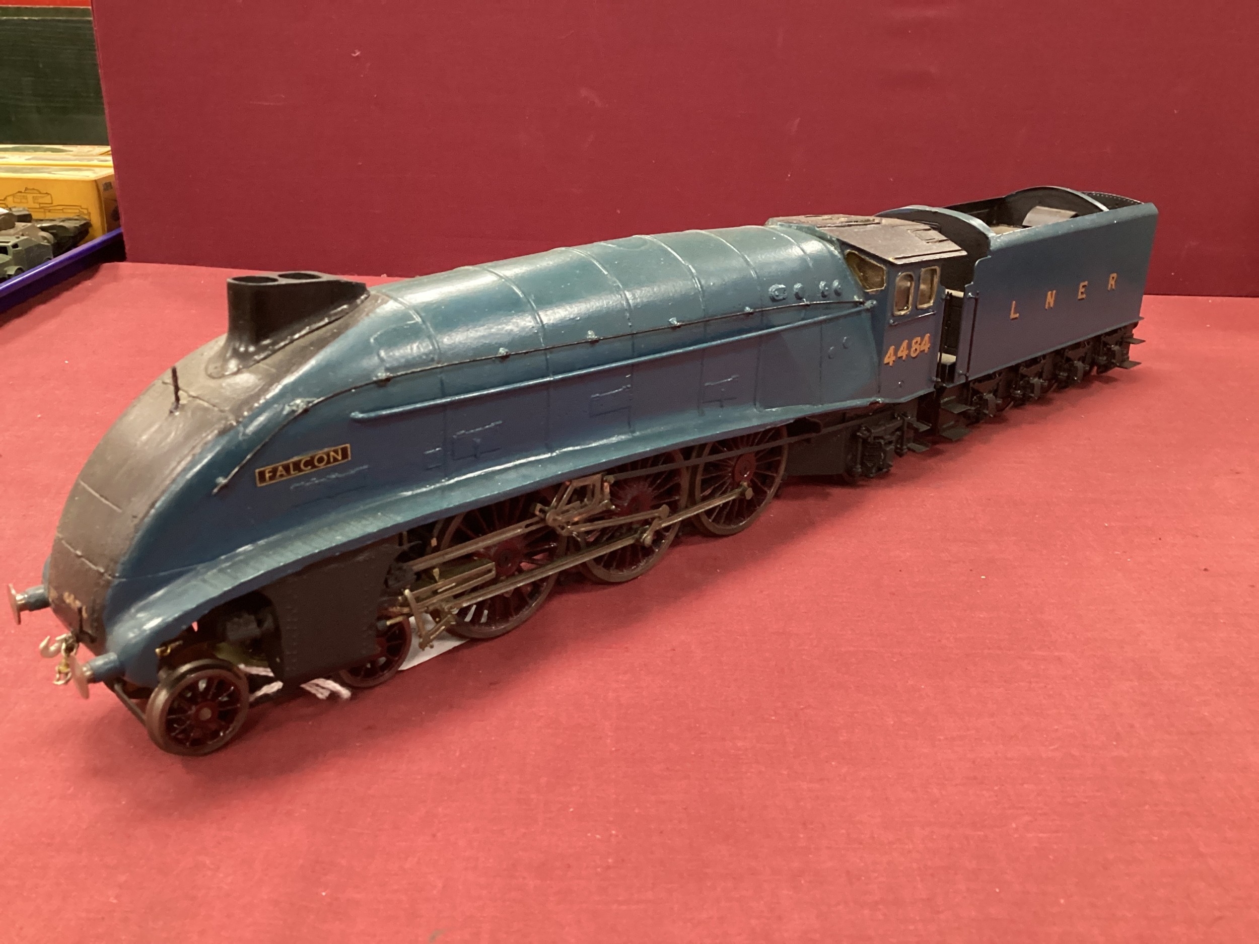 A 'O' Gauge/7mm Kit Built Class A4 4-6-2 Steam Tender Locomotive, L.N.E.R blue "Falcon" R/No 4484: built/painted to a fair standard (drawbar damage), untested, unboxed.