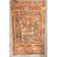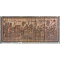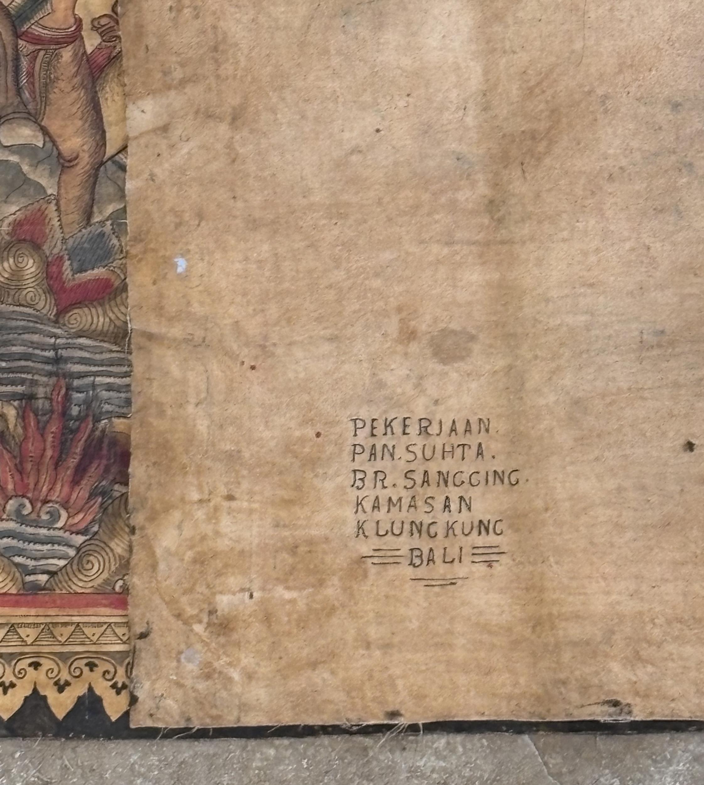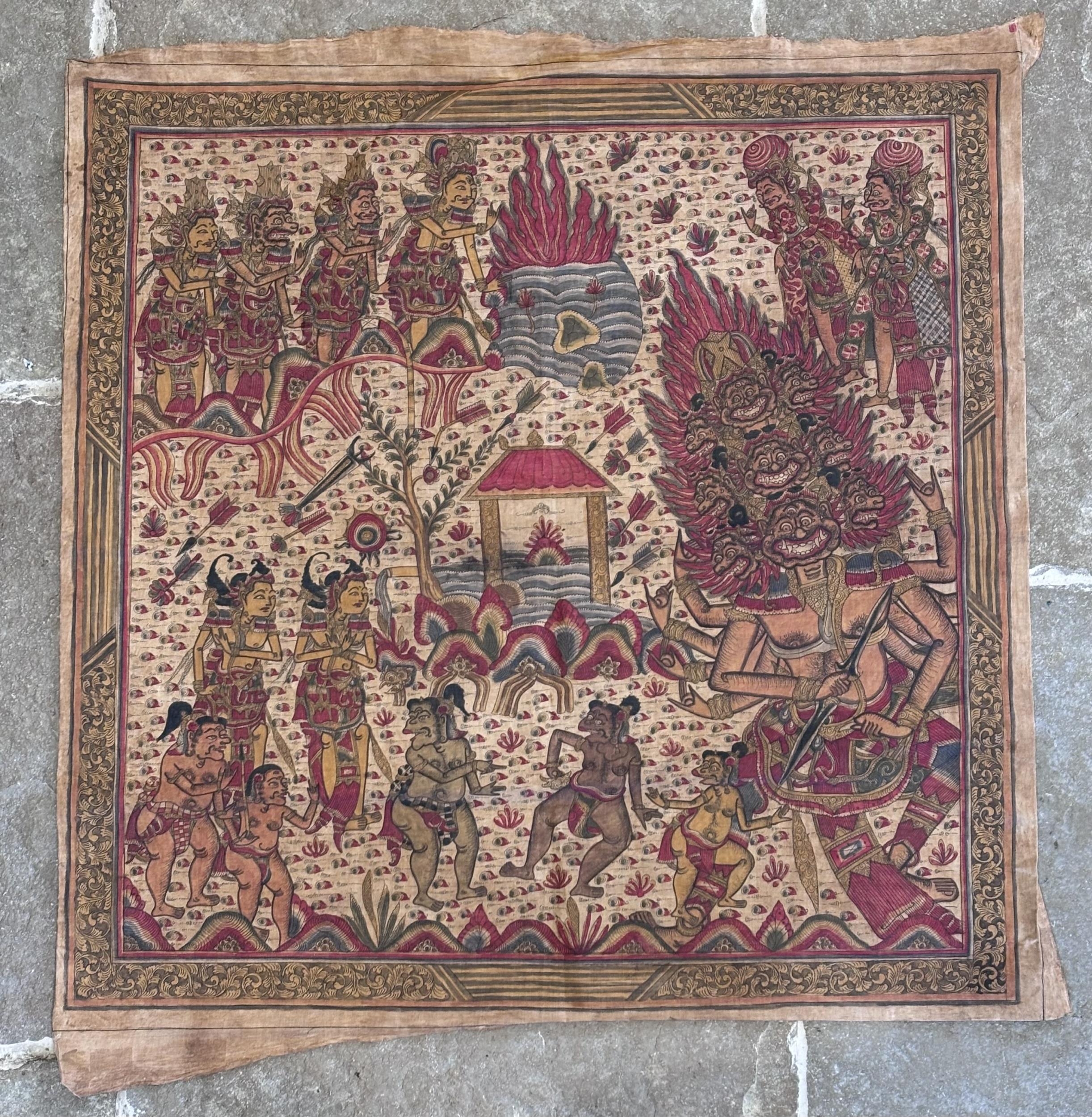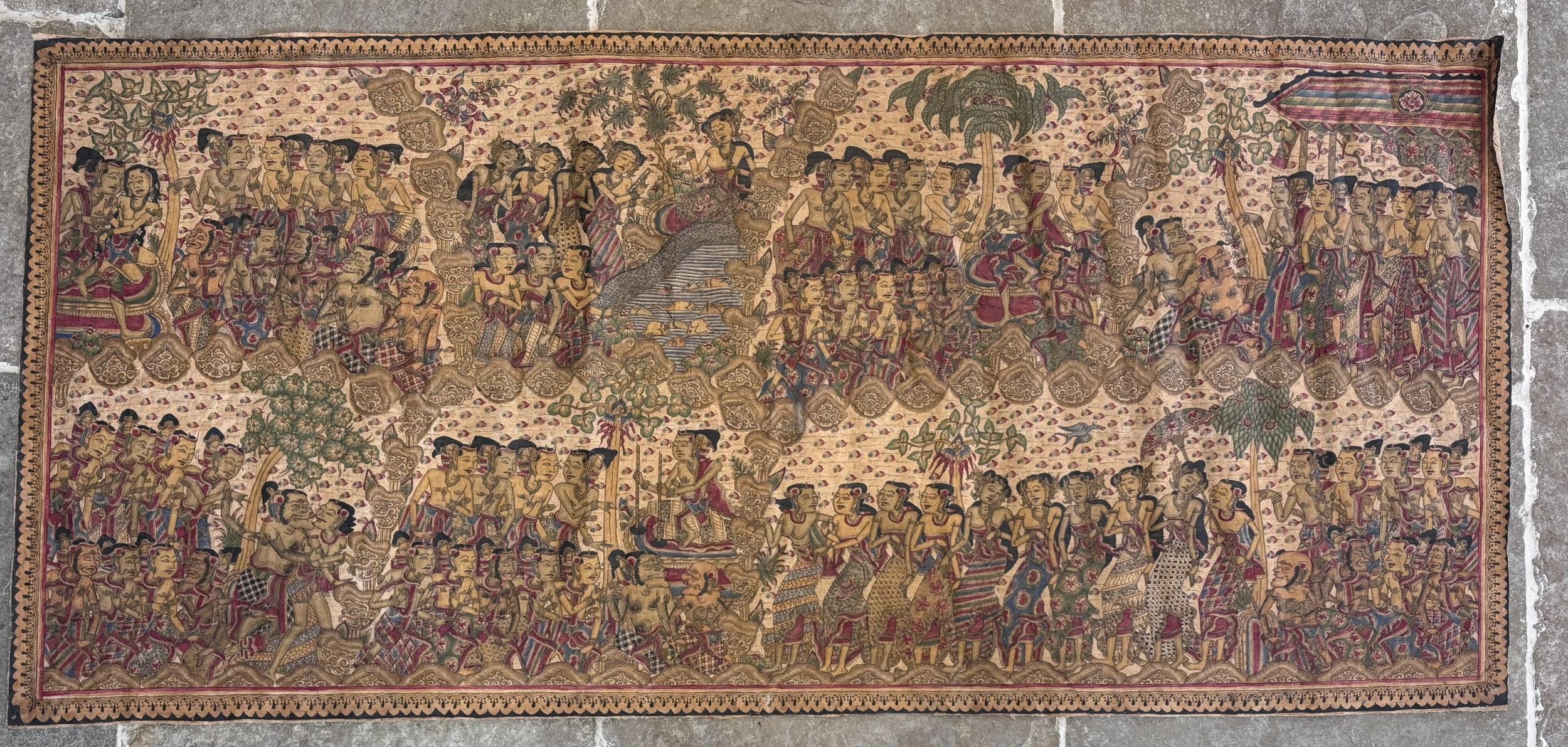 Three Balinese Kamasan painted panels, 20th century, each typically decorated with Mythological and processional parades featuring Gods, warriors and animals, largest 190cm x 89cm (3)