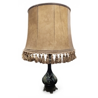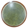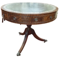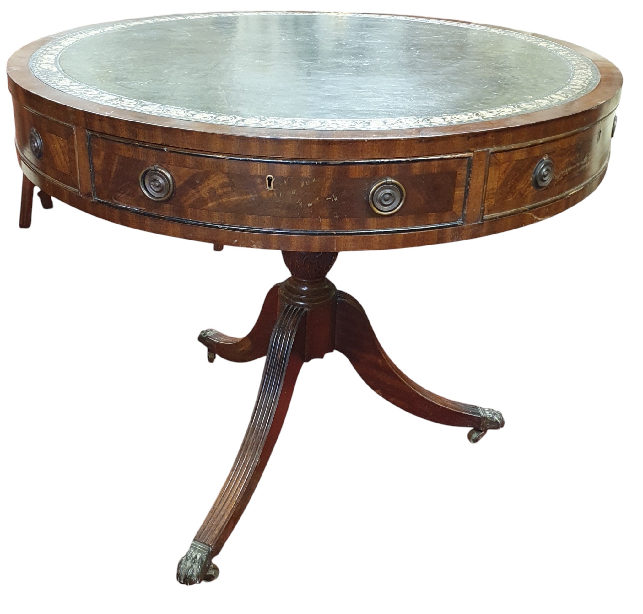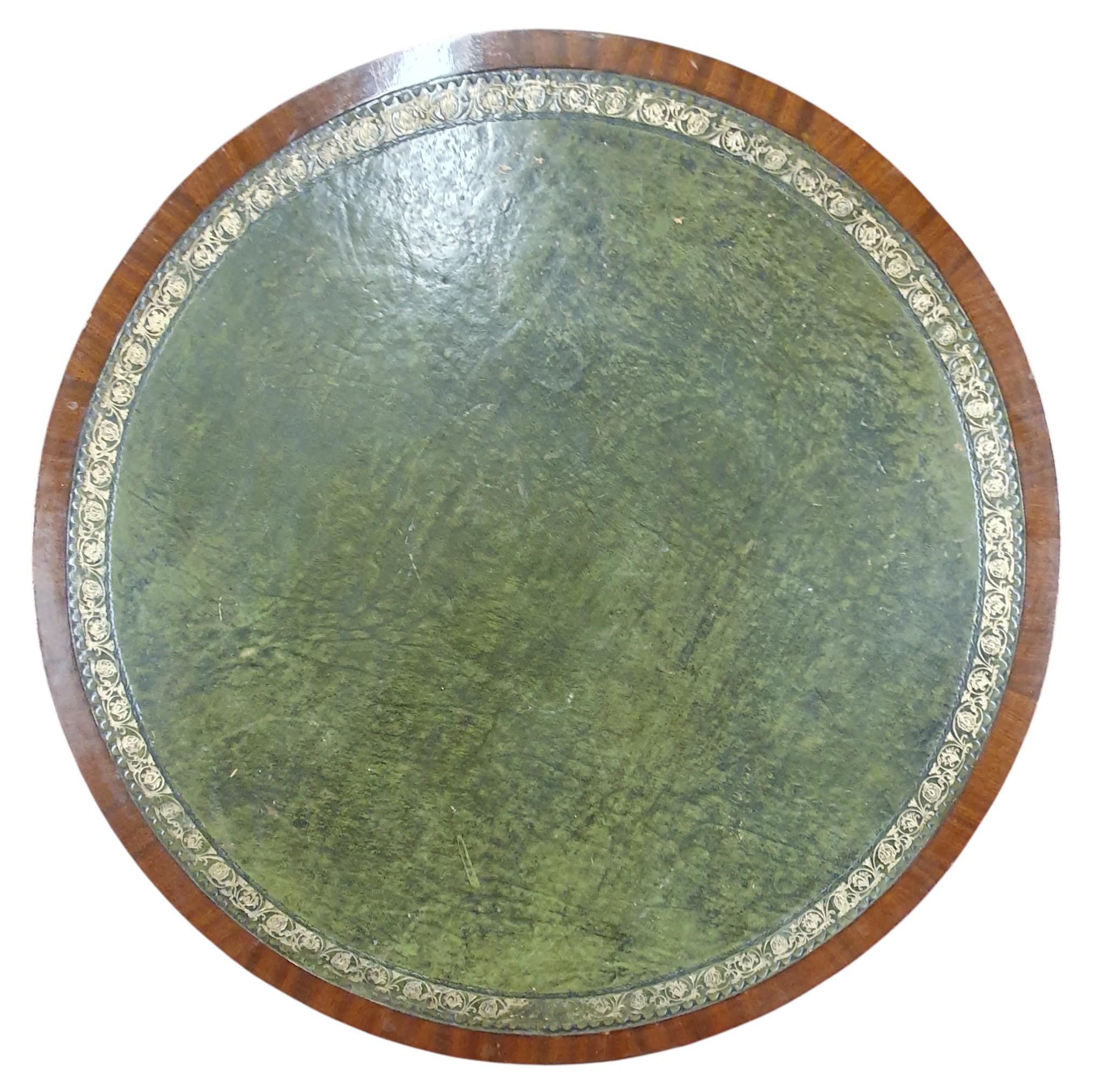 A good Mahogany and Veneered circular Drum Table with green leather tooled inserted top on a tripod support with brass castors. D 62 x H 81 cm approx.