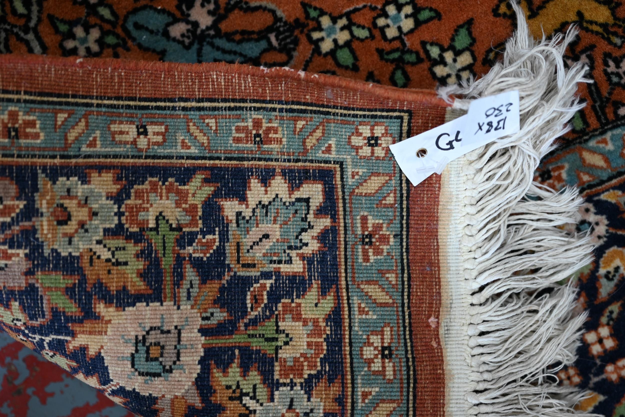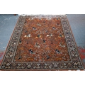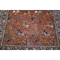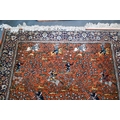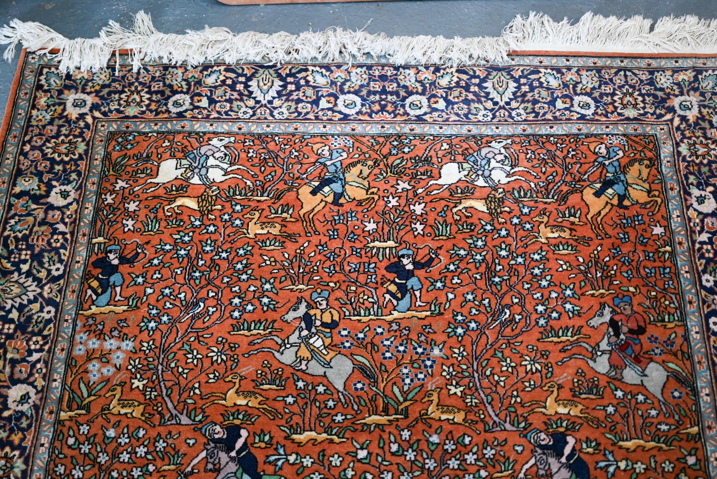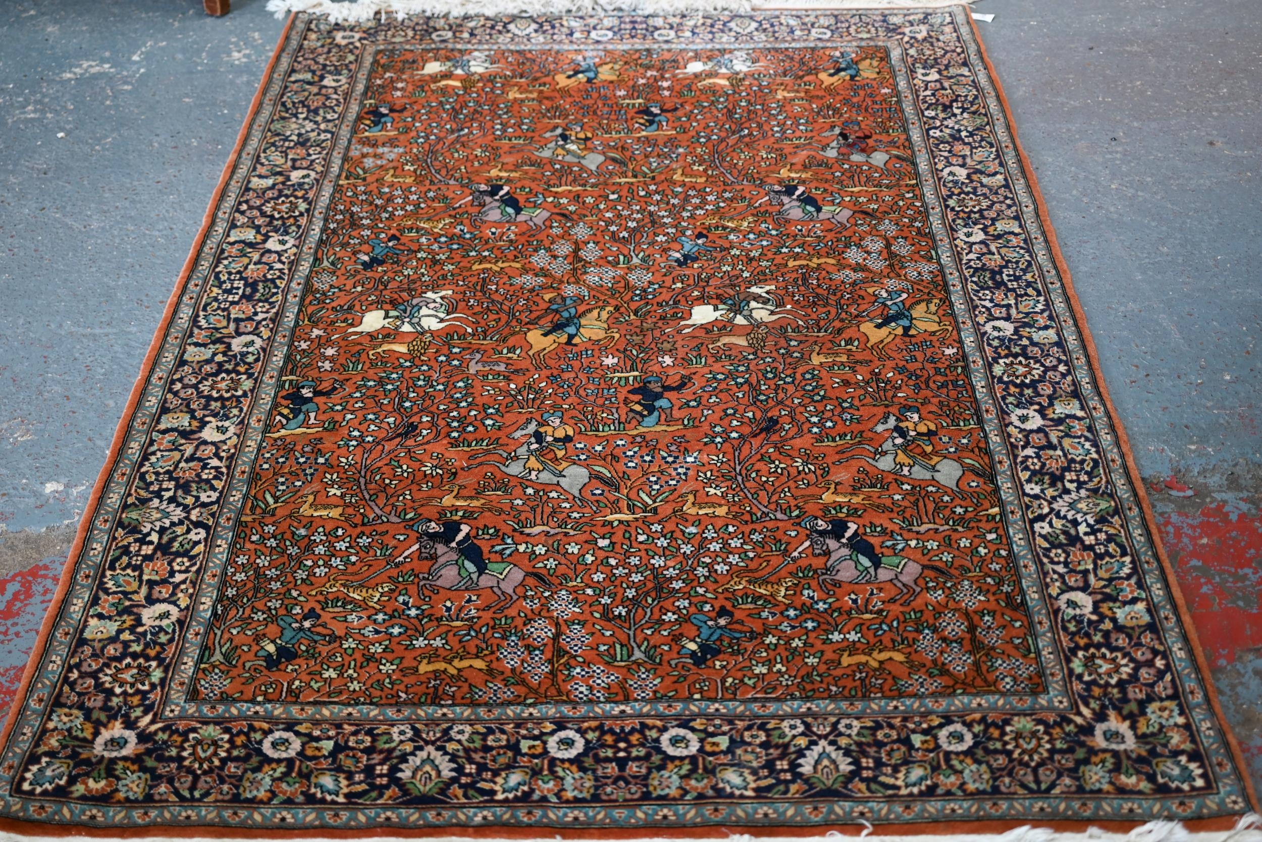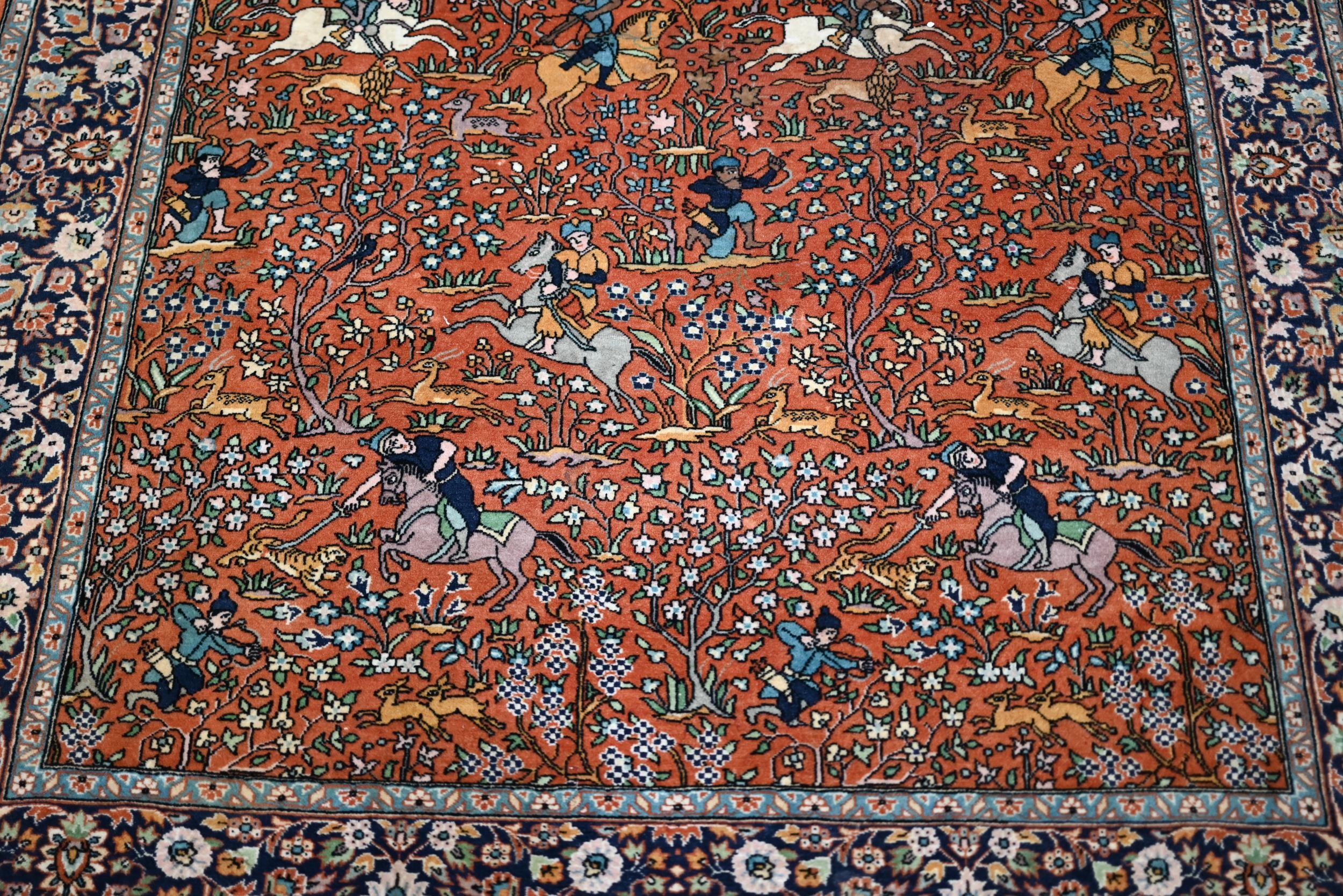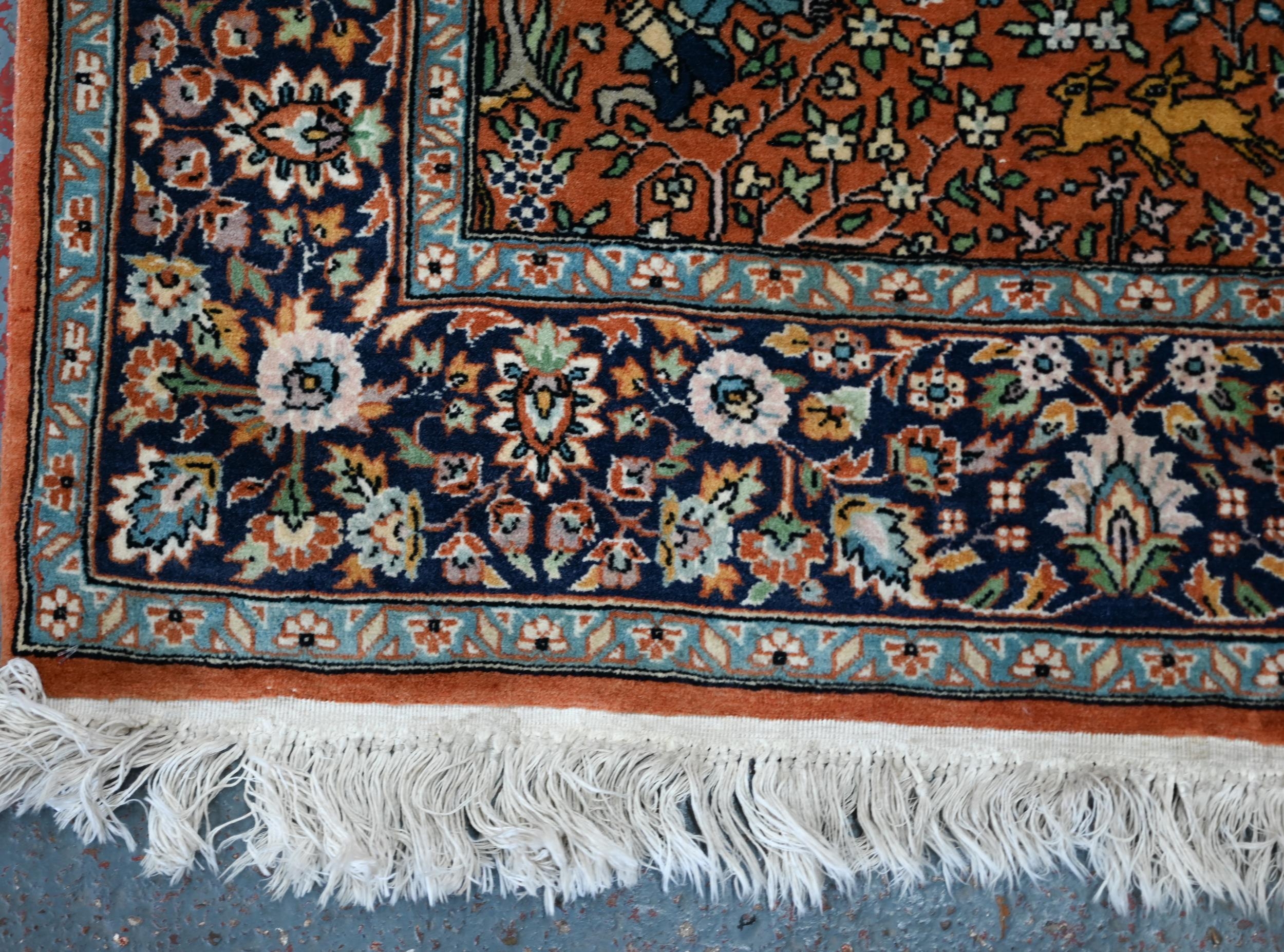 A Persian Quom rug, mid 20th century, the brown-gold ground with pictorial hunting scenes intertwined by flowering trees, 230 cm x 138 cm