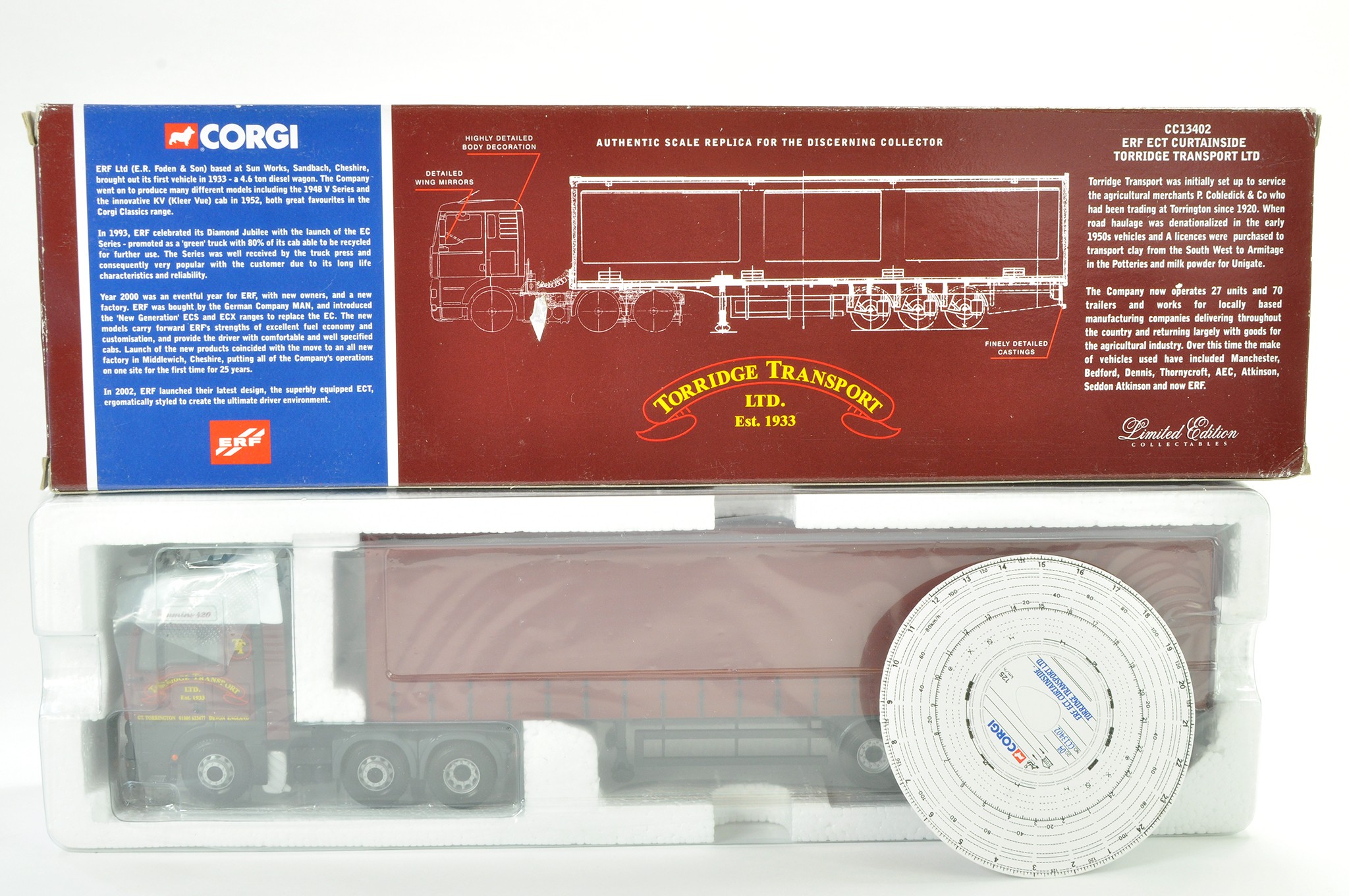 Corgi Diecast Model Truck issue comprising No. CC13402 ERF ECT Curtainside in the livery of Torridge. Appears good to very good, likely displayed at some stage so possibly some light cosmetic wear in places.