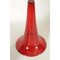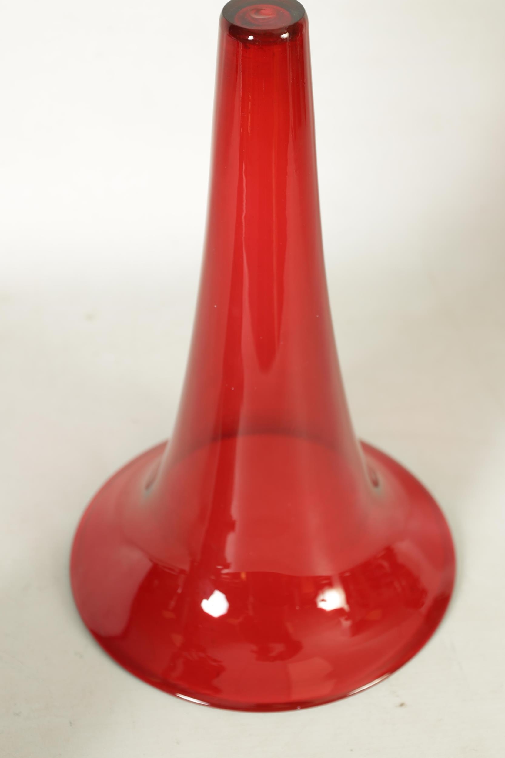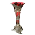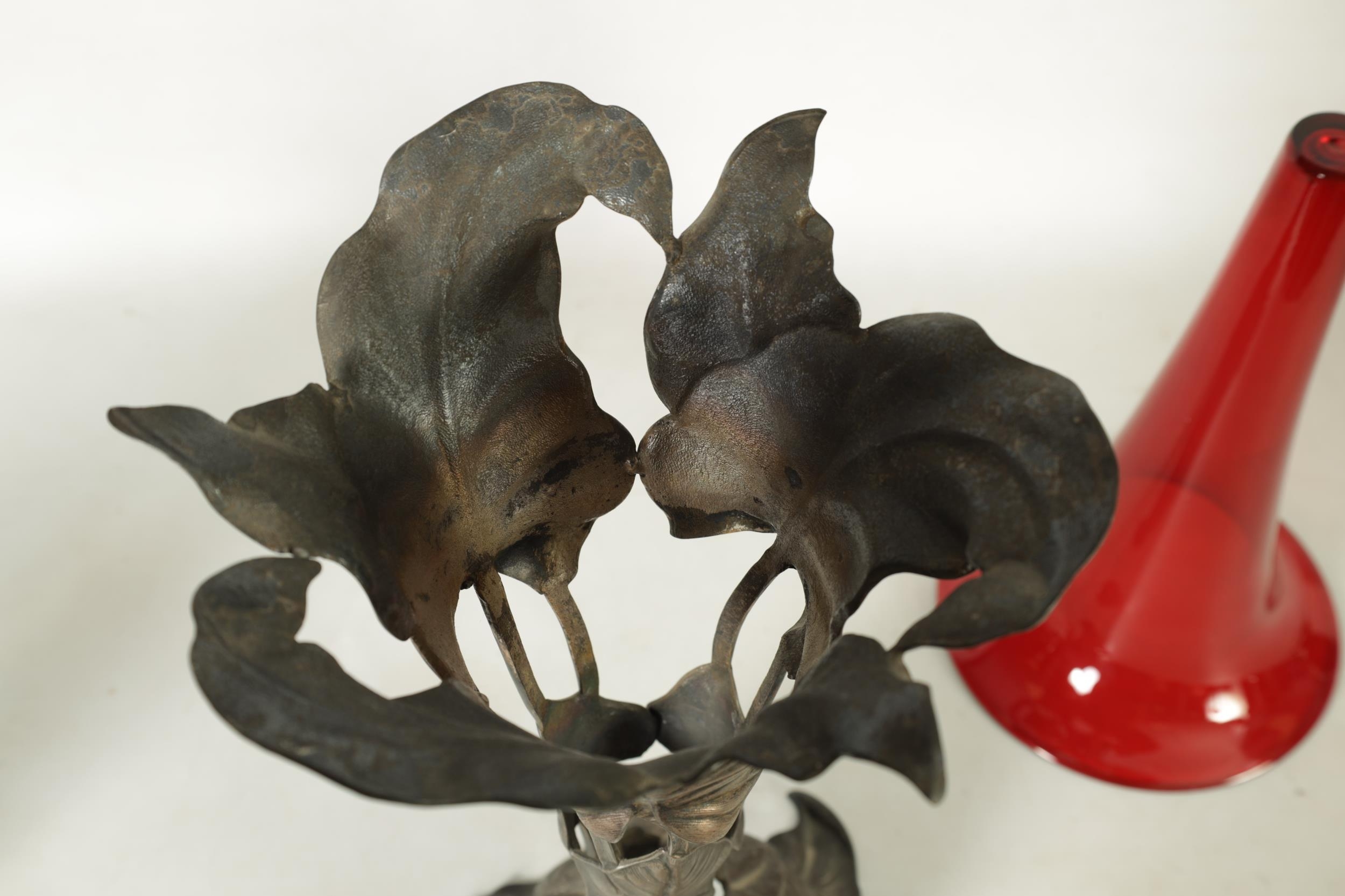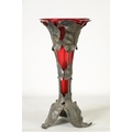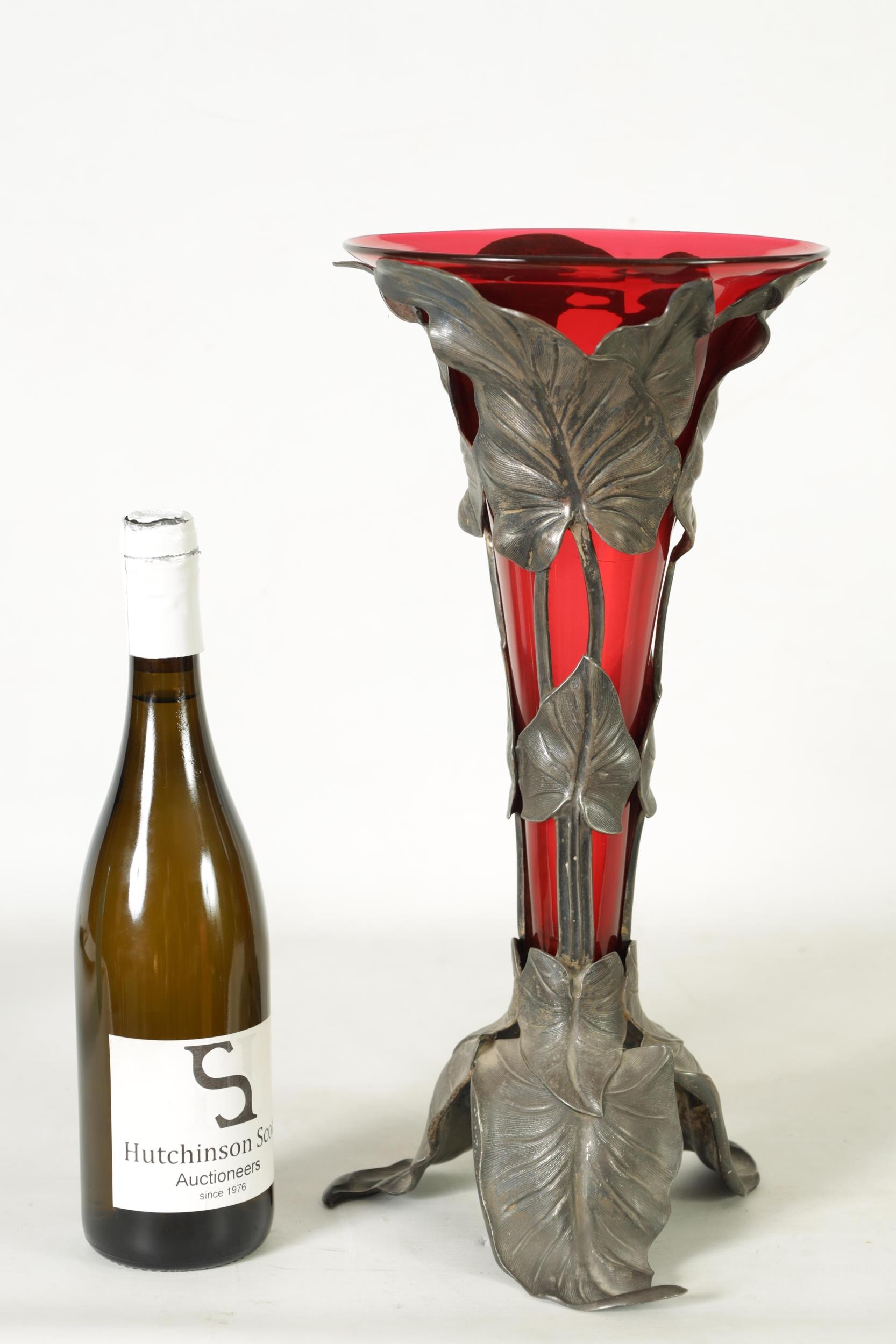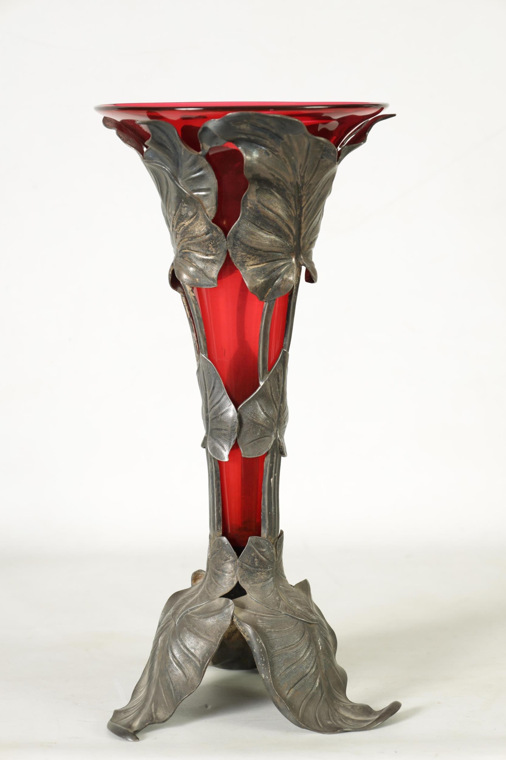 A STYLISH ART NOUVEAU PEWTER AND CRANBERRY GLASS ORCHID VASE the lift-out trumpet-shaped glass body in a stylised leaf work container on matching splay feet. (42cm high)