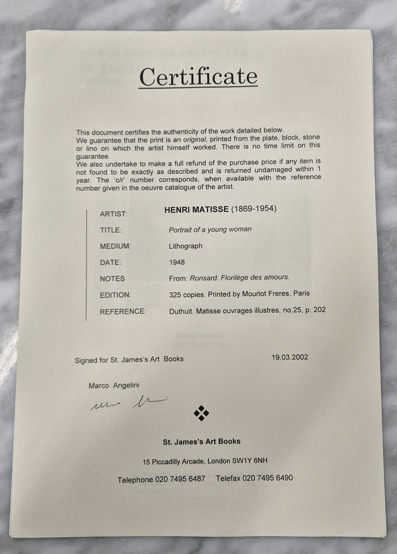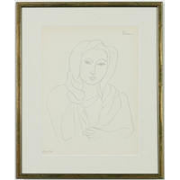HENRI MATISSE. PORTRAIT OF A YOUNG WOMAN. lithograph, 1948, From: Ronsard. Florilege des amours, printed by Mourlot Freres, Paris, 66cm x 55cm, framed.
