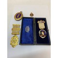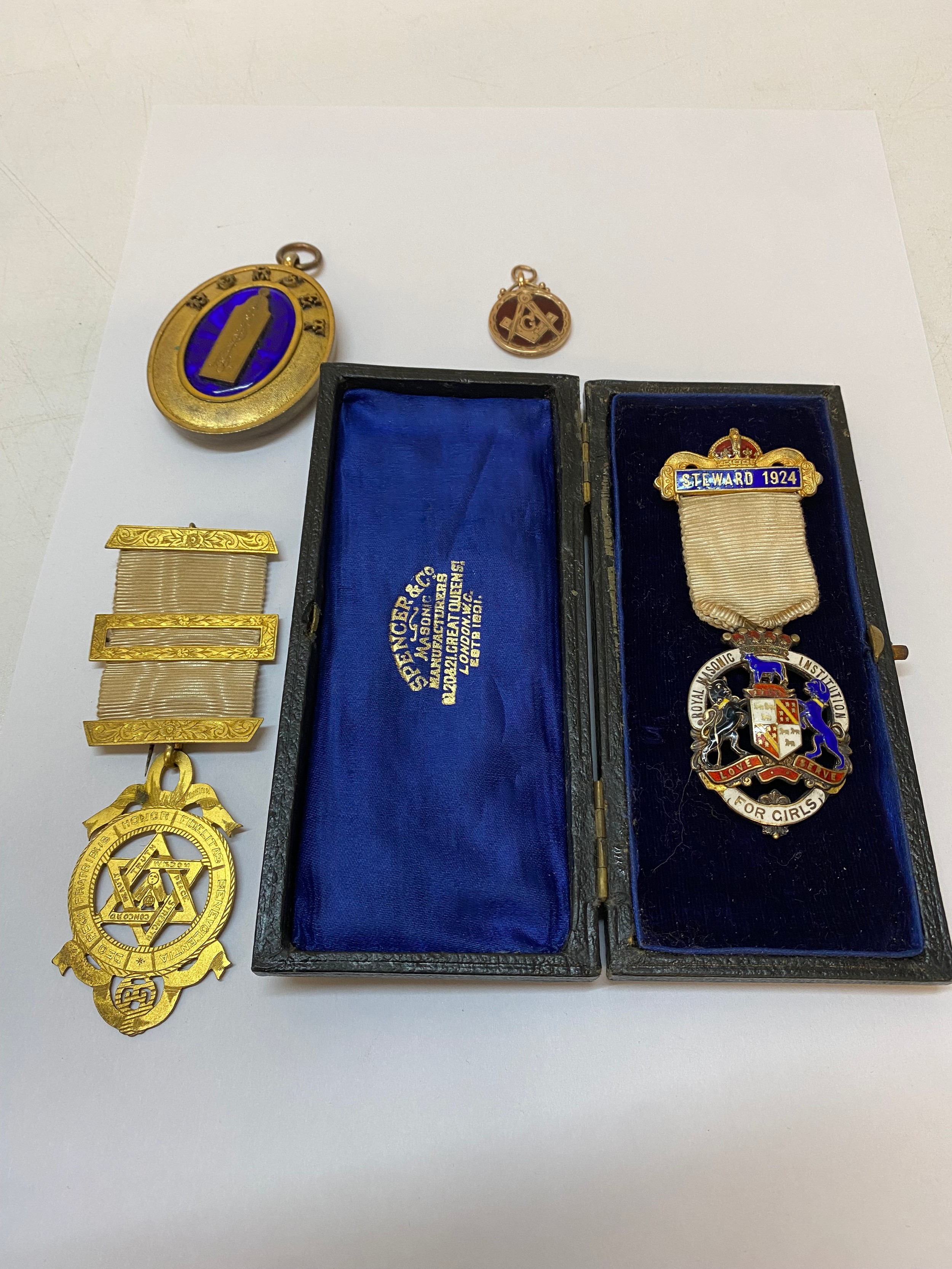 A 9ct. gold Masonic medal set carnelian, a Royal Masonic Institution For Girls silver gilt and enamel Masonic Stewards medal, boxed, a gilt metal Masonic medal and a Masonic Collar jewel