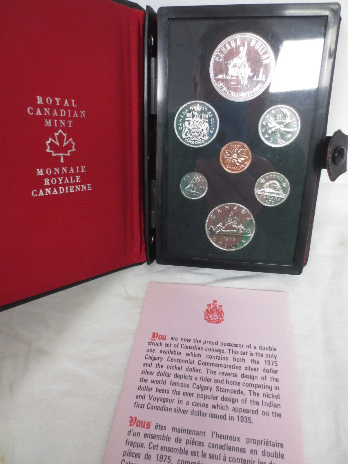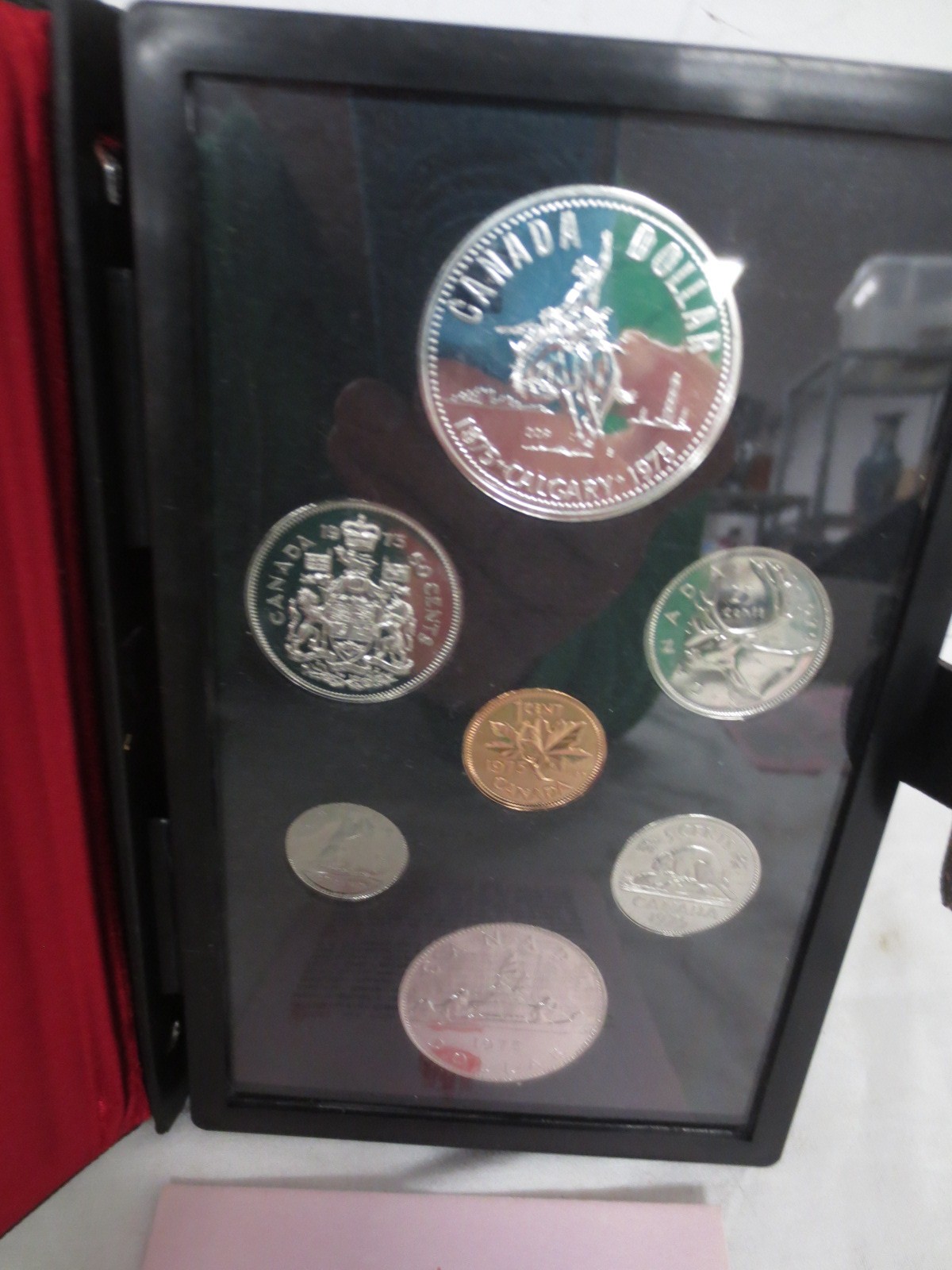 A 1975 Canadian Mint proof set of coinage including the 1975 Calgary Stampede silver dollar coin, in presentation folder in very nice condition