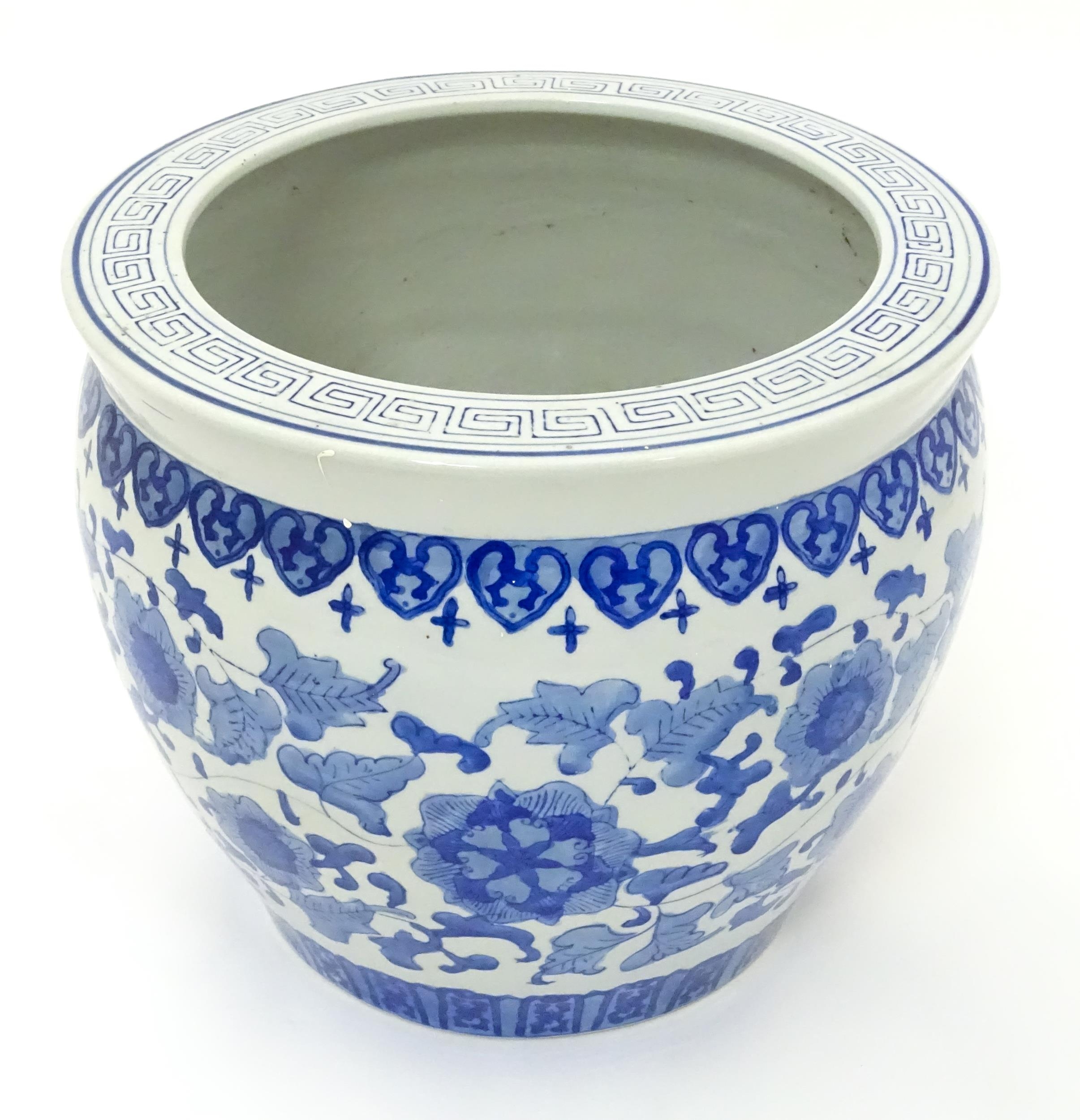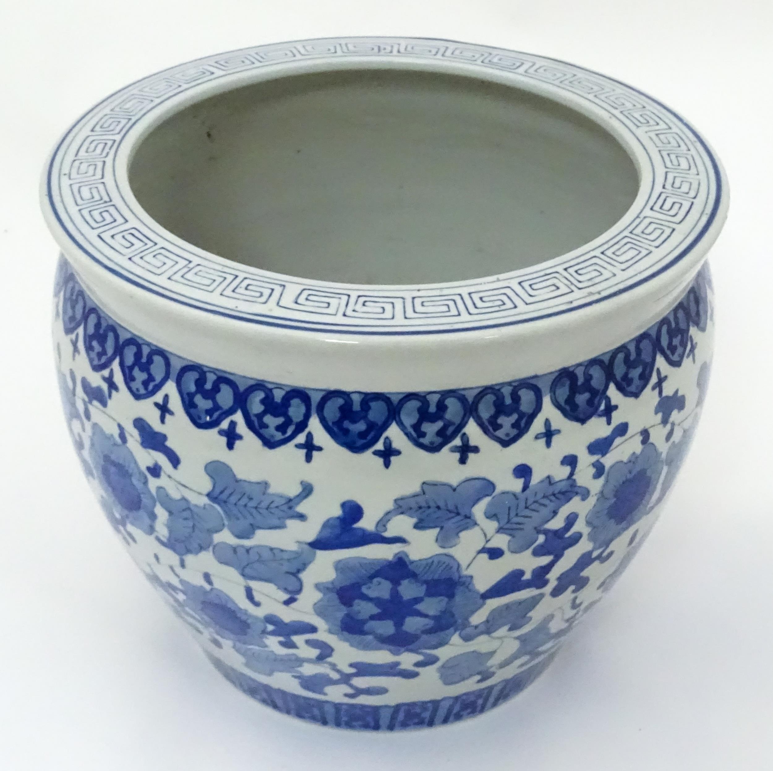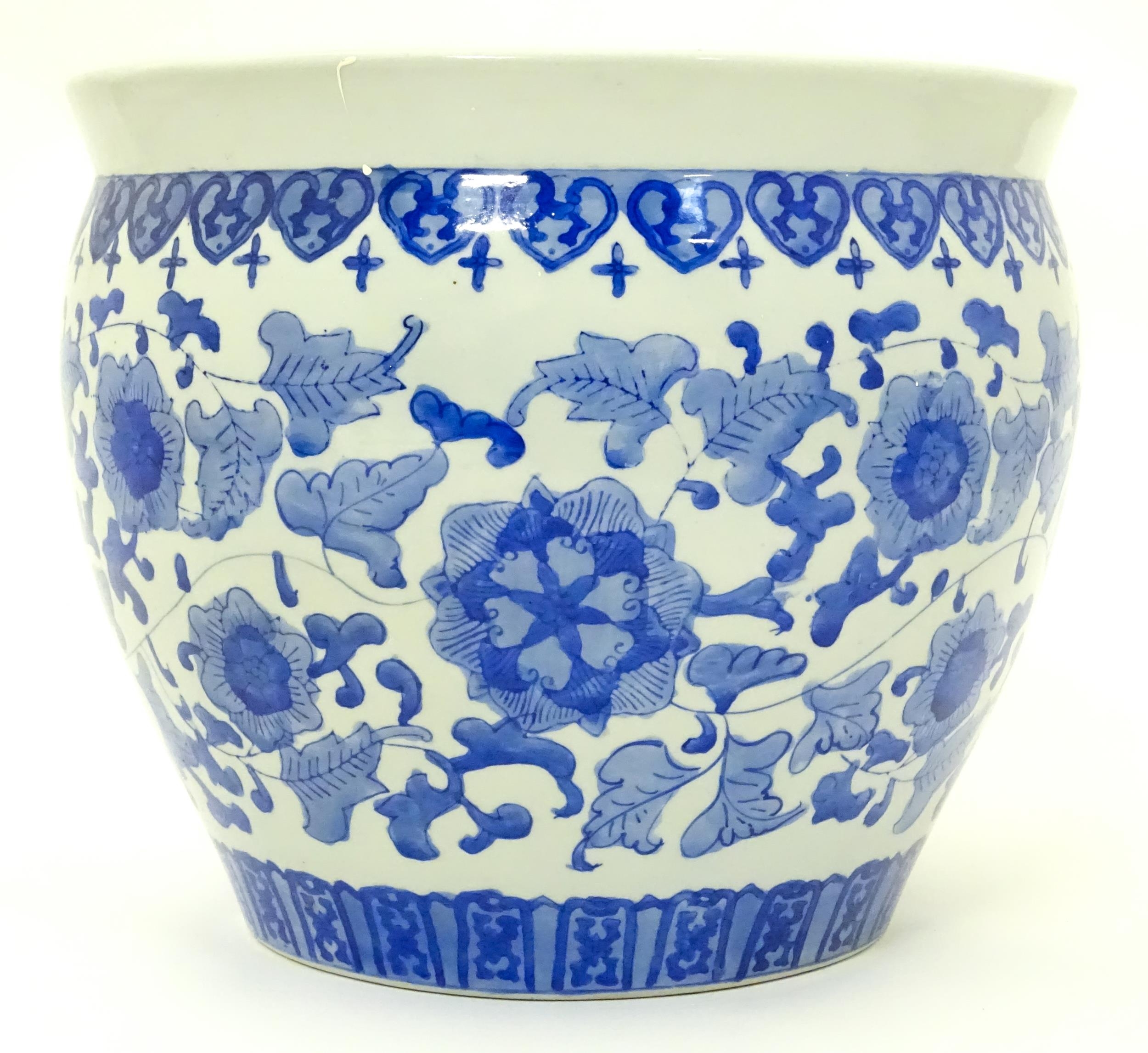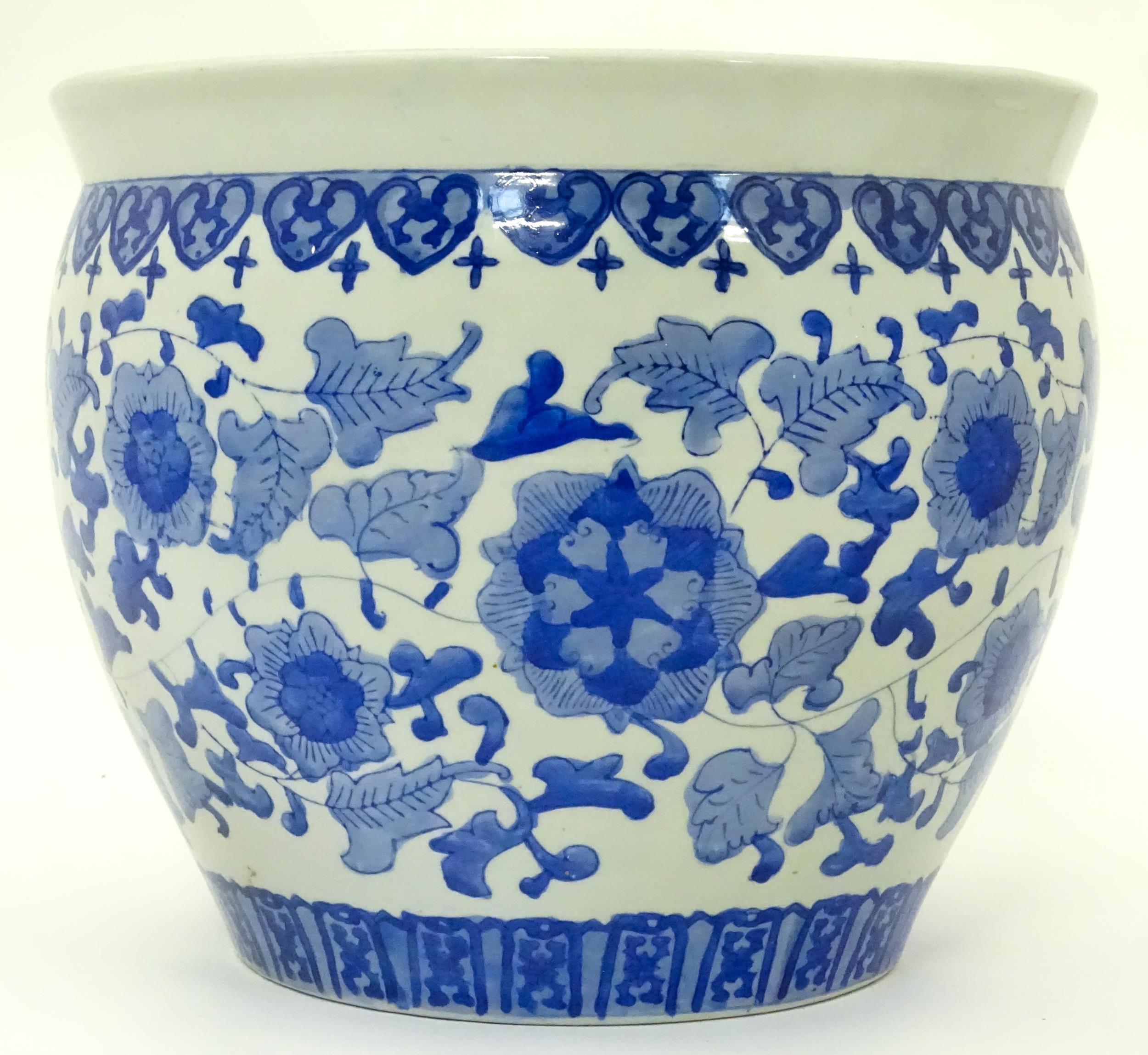 A Chinese blue and white planter decorated with flowers and foliage. Approx. 10 1/4" high