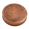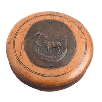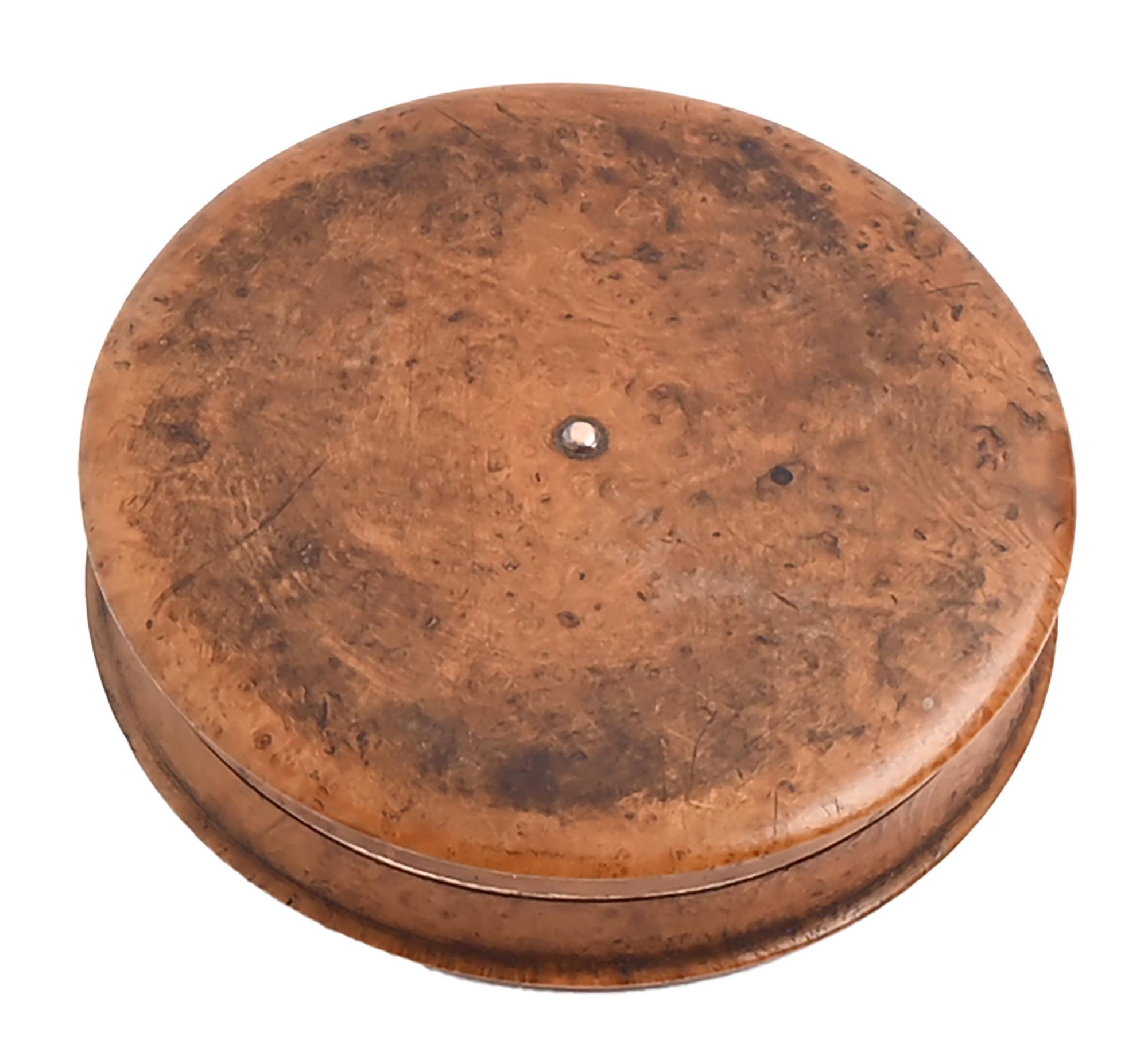 A French turned burr maple snuff box and cover, c1830, copper gilt lined, 85mm diam