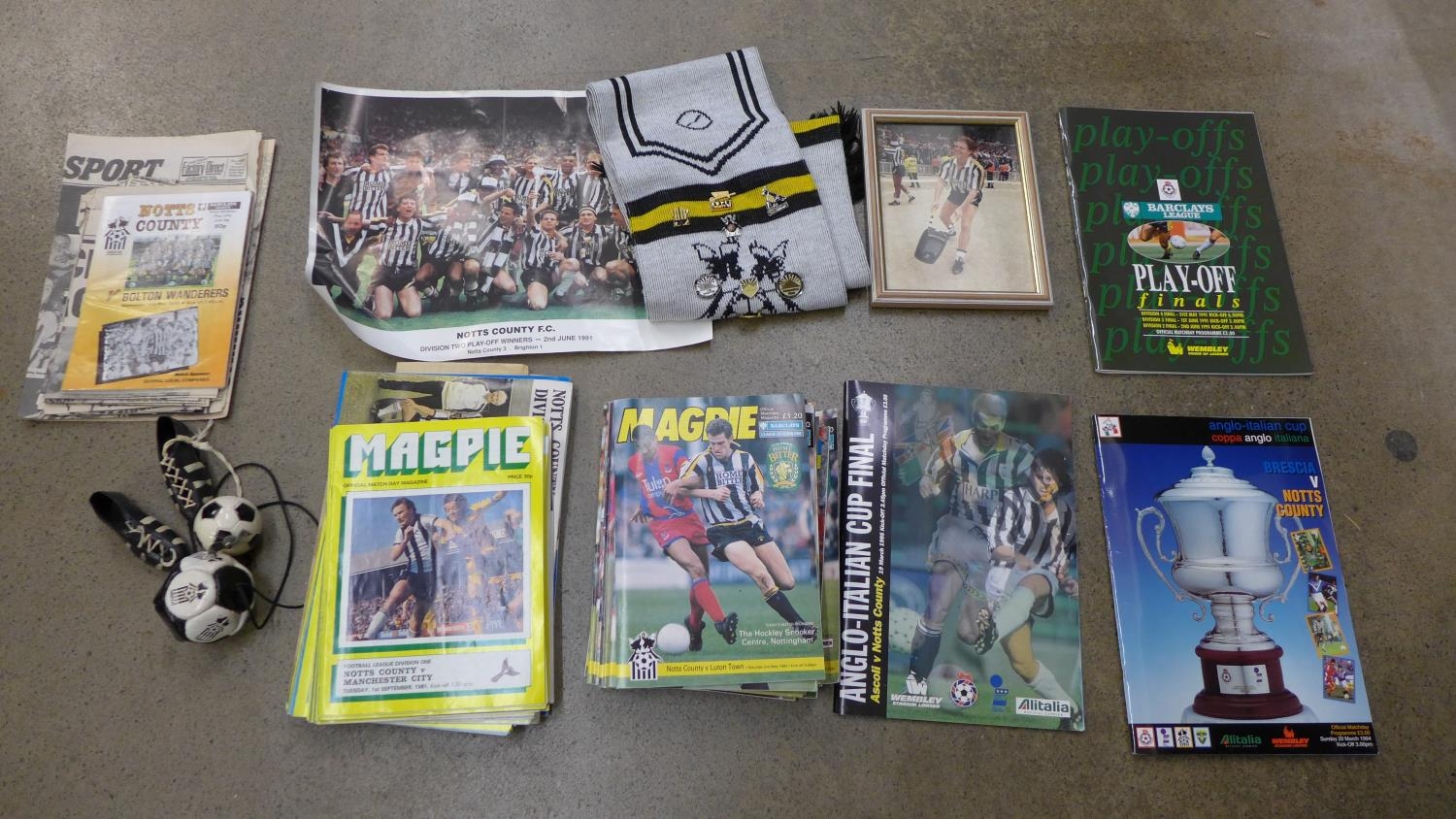 A collection of Notts County football ephemera and items including a scarf with pin badges, magazines, newspapers, etc.