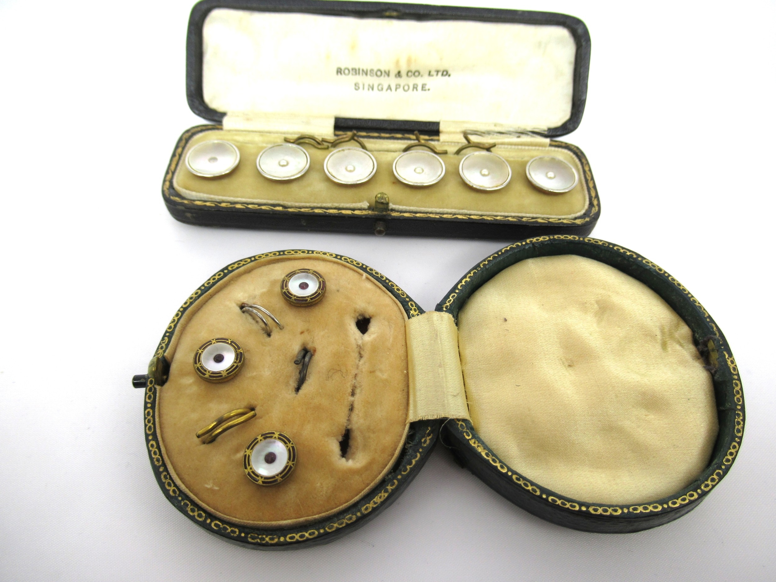 Cased set of six 15ct gold mother of pearl and split pearl studs, together with three other cased studs