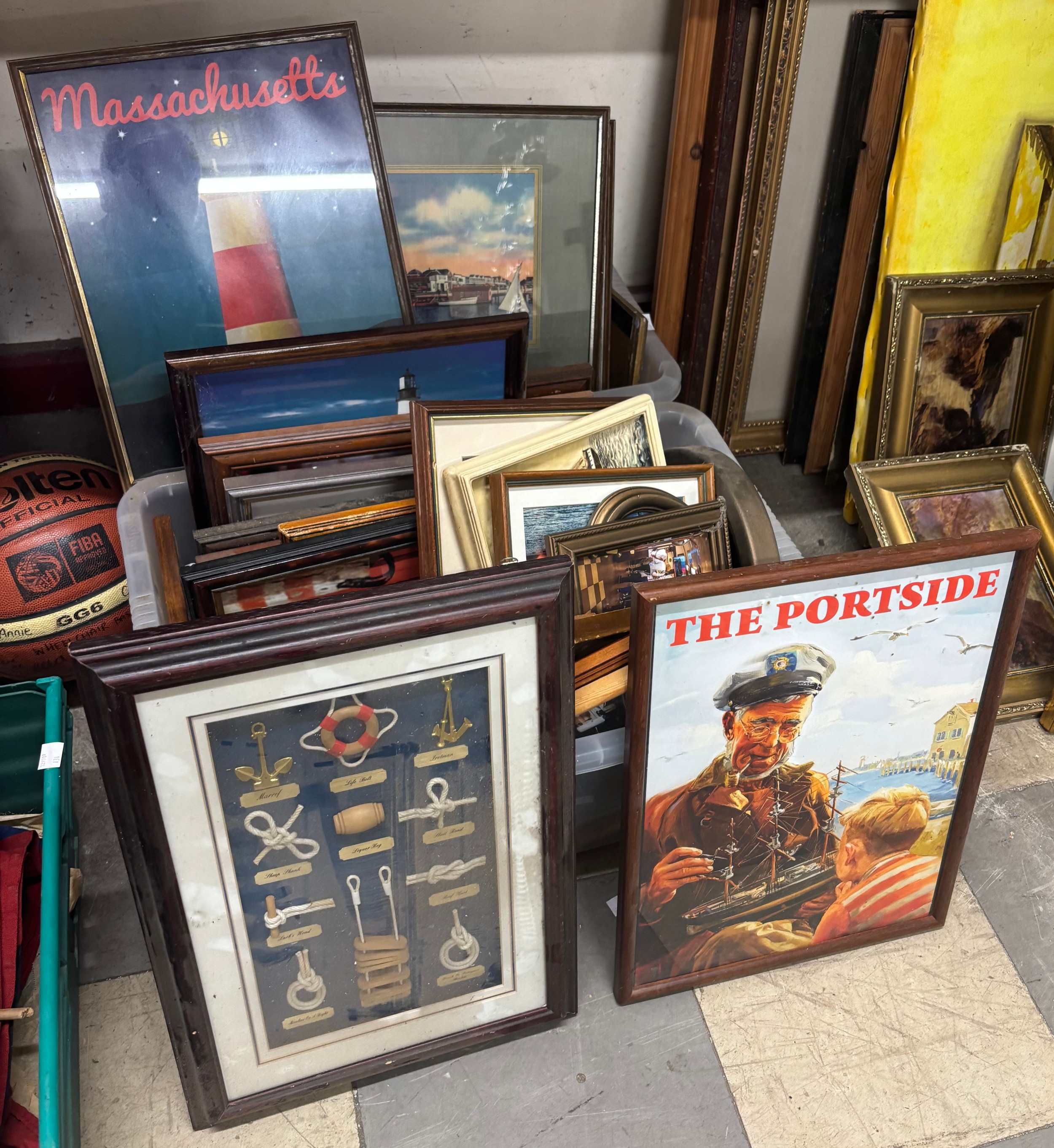 Two boxes of prints and pictures, mostly American nautical themed