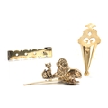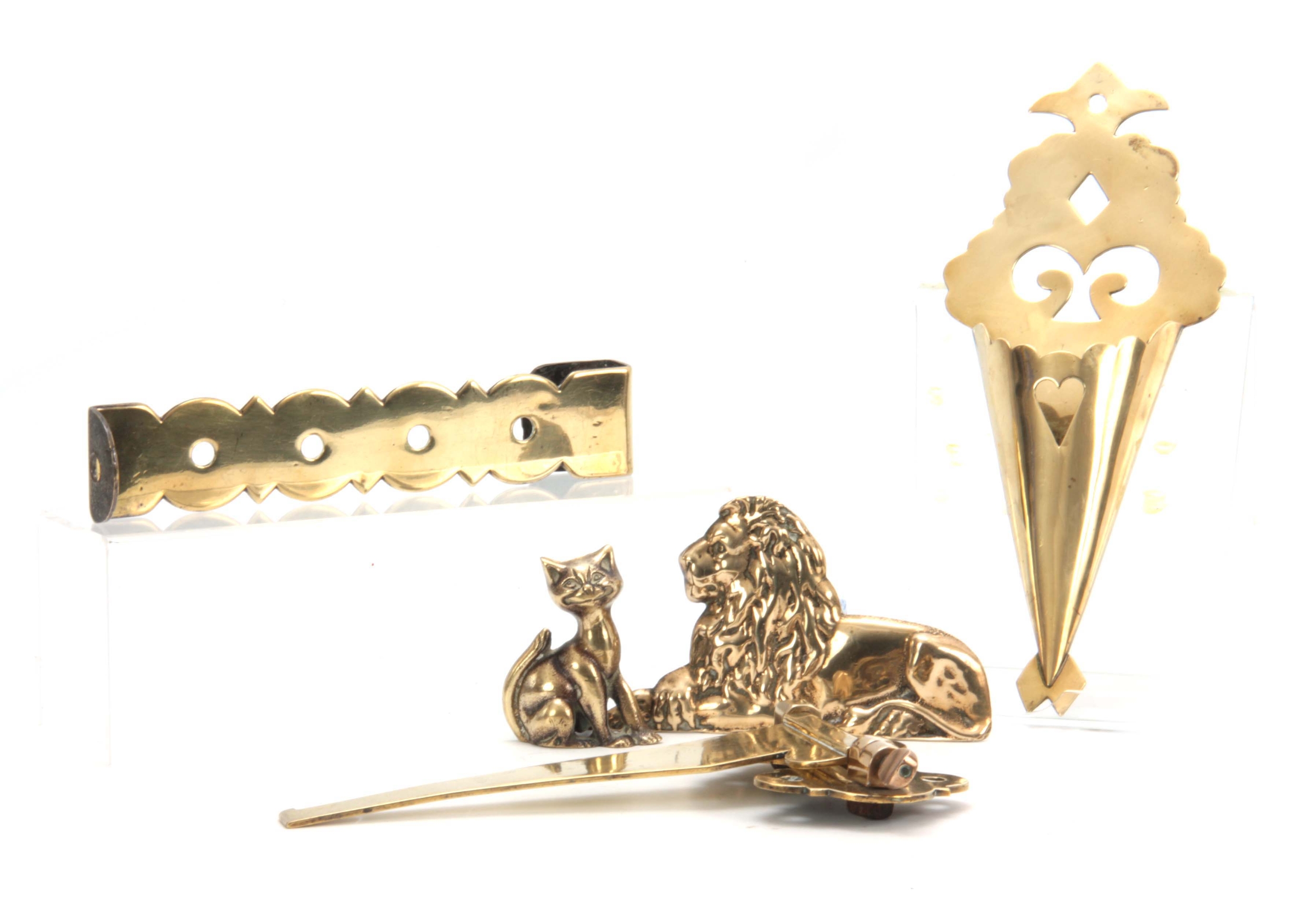 A 19TH CENTURY BRASS AND STEEL ADJUSTABLE HANGING HOOK, A SHAPED CUT-OUT BRASS SPILL HOLDER, A GEORGIAN BRASS SPIT ARM, A CAST LION HEARTH ORNAMENT and A BRASS CAT