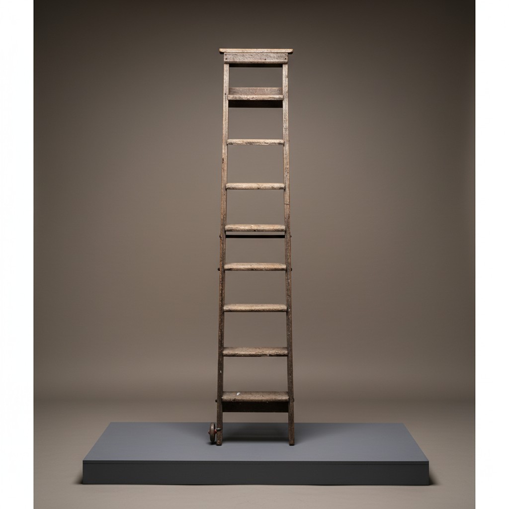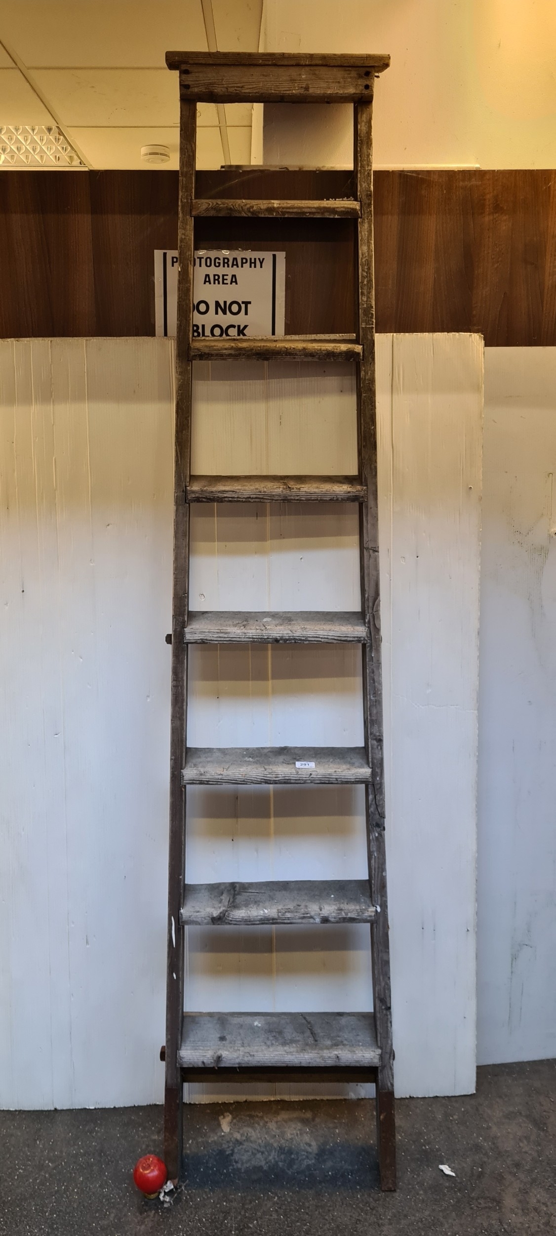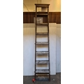 A tall softwood orchard ladder with seven broad rungs and rectangular side rails, circa early 20th century. These are very decorative in the right setting.