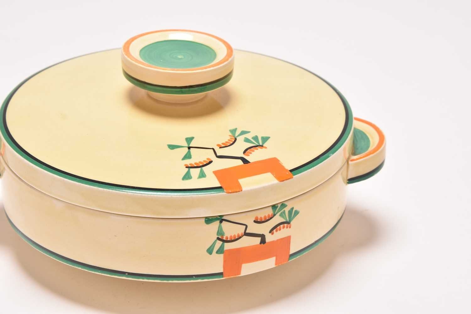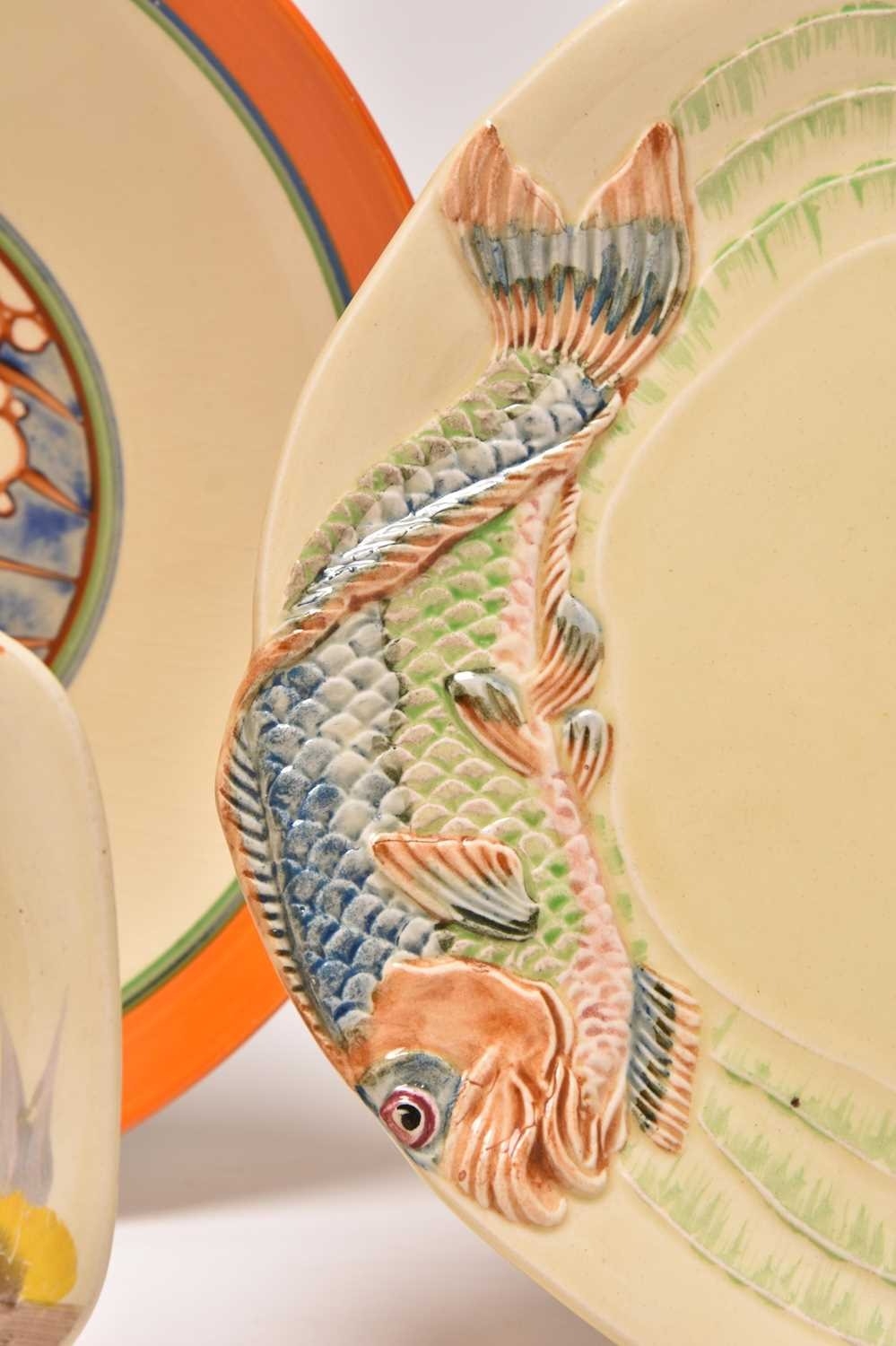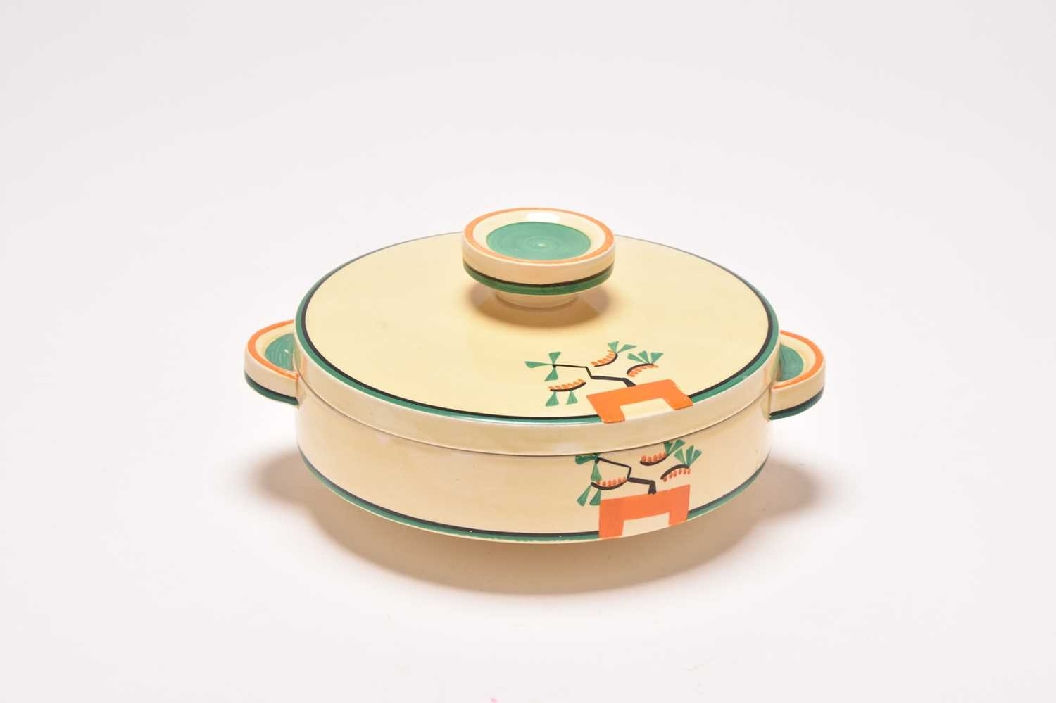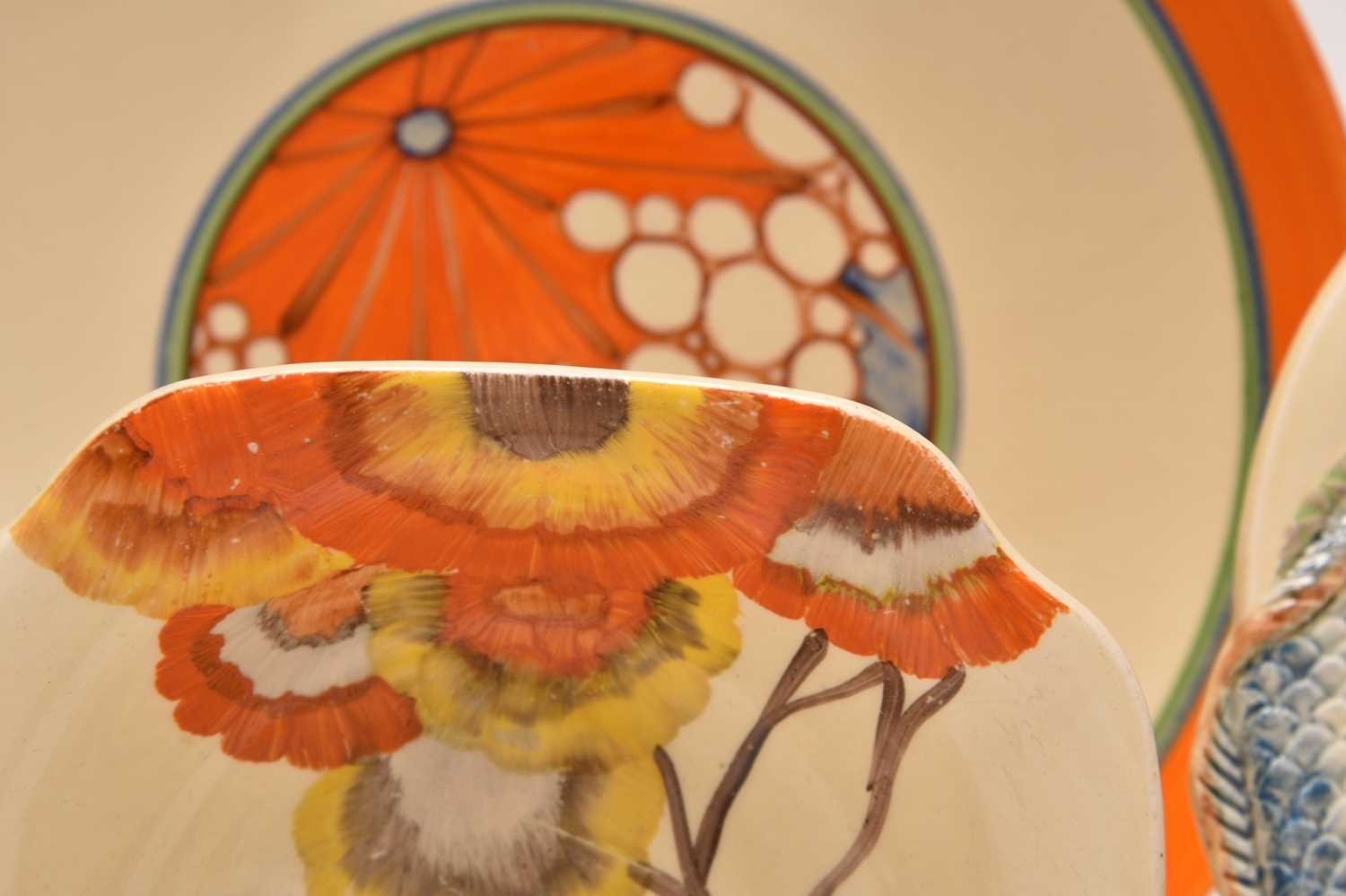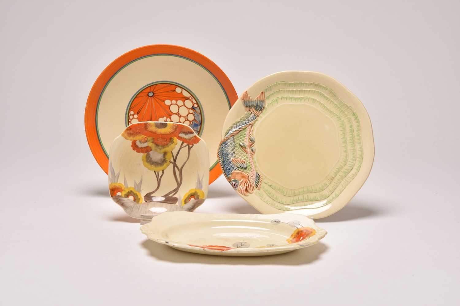 A collection of Clarice Cliff Art Deco ceramics, comprising: A 'Ravel' Odilon circular tureen and cover, circa 1930, abstract design, printed Bizarre / Newport and registration marks, 25cm handle to handle; a 'Broth' plate, Fantasque / Newport and Lawley's marks to base, 22.5cm diameter; a 'Rhodanthe' rectangular platter, 24cm, and small bowl or side dish, 13.5cm wide; plus a Wilkinson Clarice Cliff plate moulded with a fish, 21cm diameter (5) Condition:Ravel tureen - Some minor paint wear. Scratches to interior from use. 'Broth' plate - Spots of wear to the orange border, crazing throughout 'Rhodanthe' - square platter crazed throughout with some areas of decoration lot, small bowl heavily scratched to decoration Fish plate - Some light surface scratches, no damages or repairs