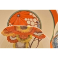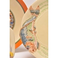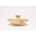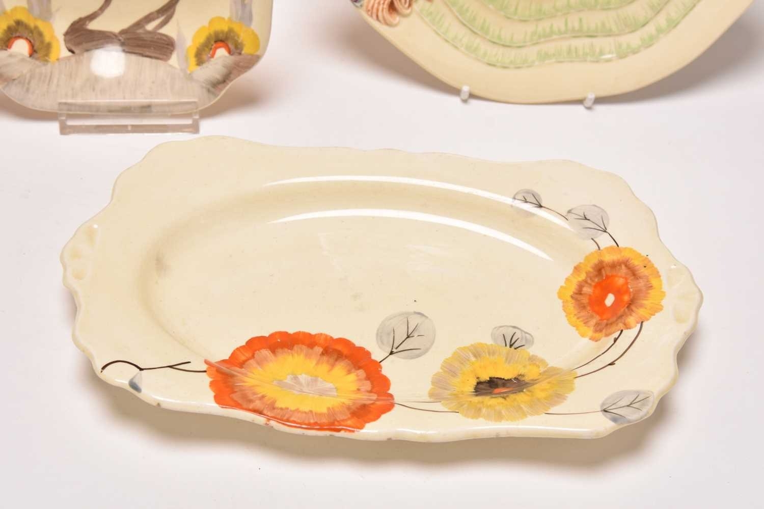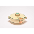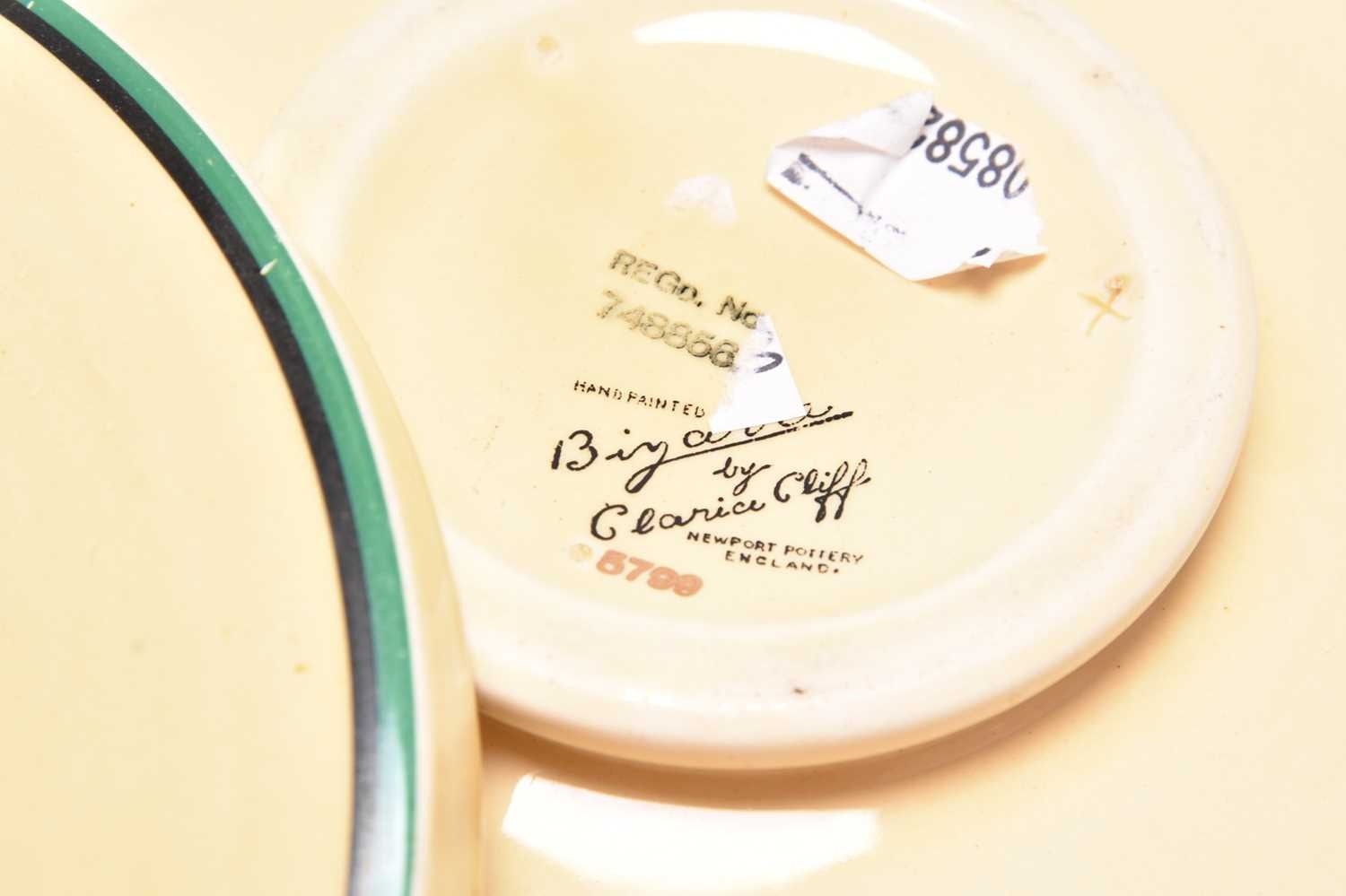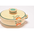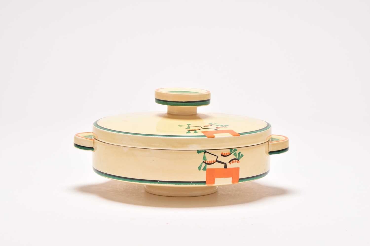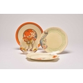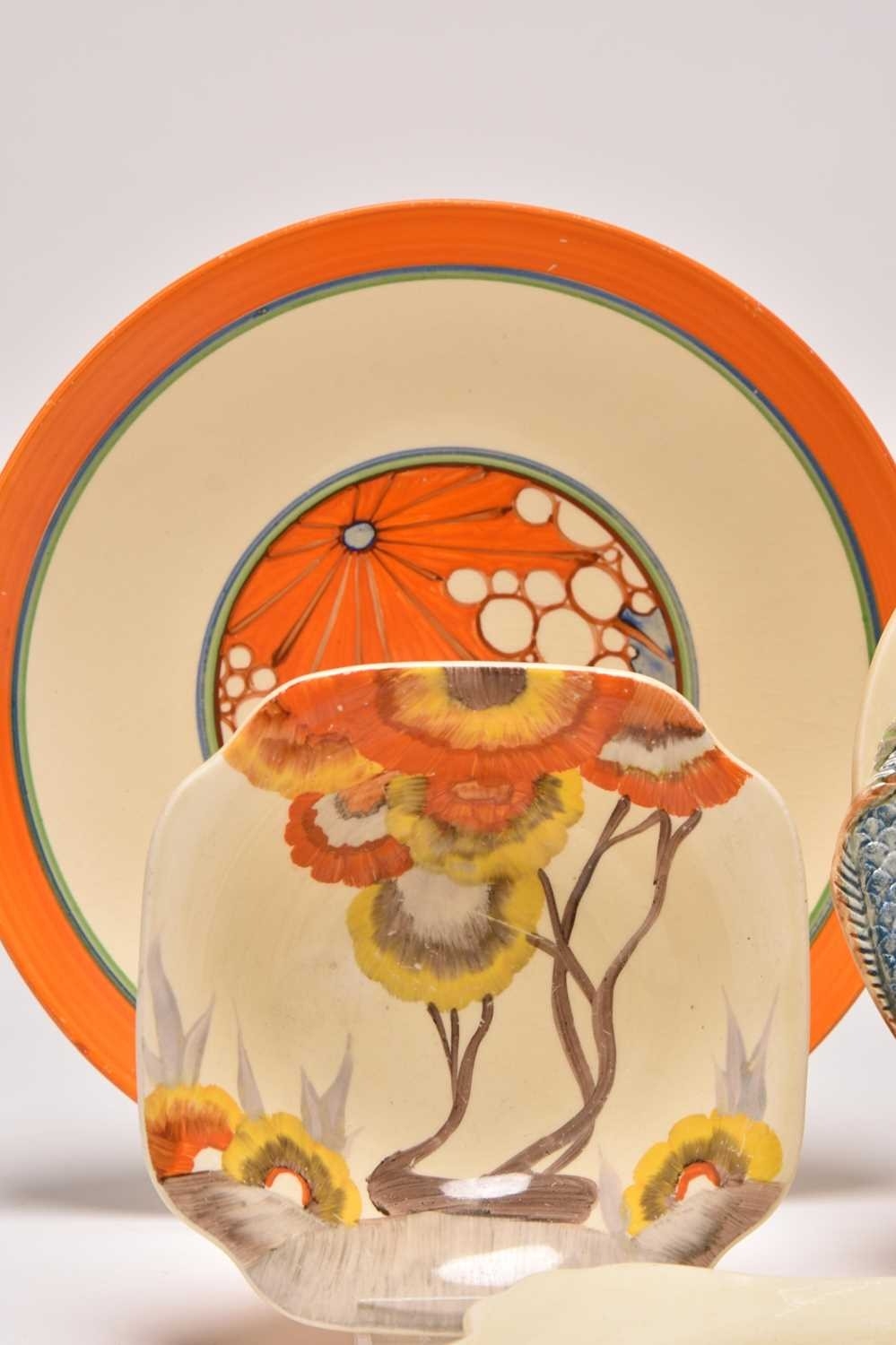 A collection of Clarice Cliff Art Deco ceramics, comprising: A 'Ravel' Odilon circular tureen and cover, circa 1930, abstract design, printed Bizarre / Newport and registration marks, 25cm handle to handle; a 'Broth' plate, Fantasque / Newport and Lawley's marks to base, 22.5cm diameter; a 'Rhodanthe' rectangular platter, 24cm, and small bowl or side dish, 13.5cm wide; plus a Wilkinson Clarice Cliff plate moulded with a fish, 21cm diameter (5) Condition:Ravel tureen - Some minor paint wear. Scratches to interior from use. 'Broth' plate - Spots of wear to the orange border, crazing throughout 'Rhodanthe' - square platter crazed throughout with some areas of decoration lot, small bowl heavily scratched to decoration Fish plate - Some light surface scratches, no damages or repairs