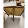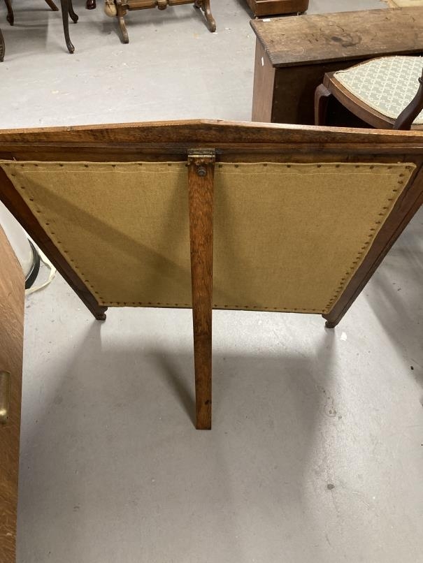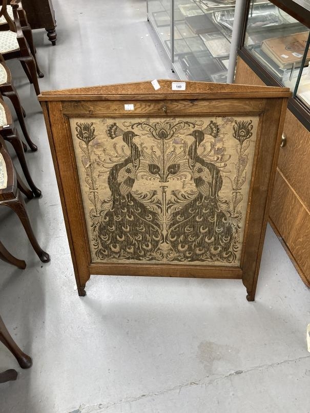 Arts & Crafts: Oak fire screen with inset tapestry panel depicting peacocks.
