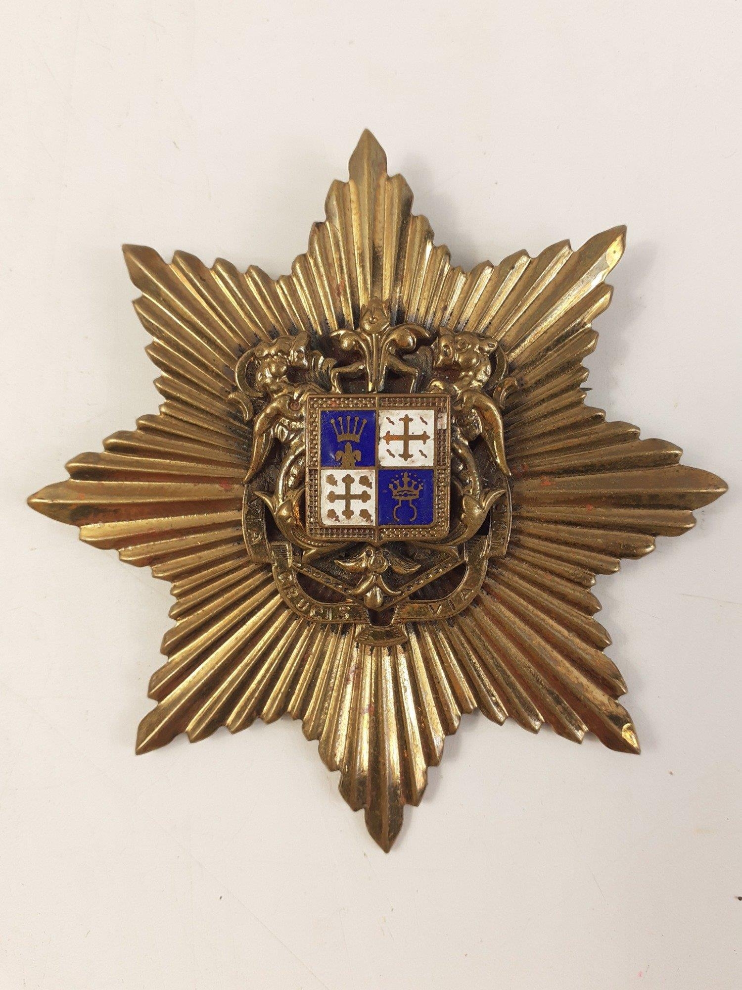 A substantial Victorian brass and enamel star-shaped sash pin with motto VIA CRUCIS VIA LUCIS, set as a pendant with an applied pin. Believed CATHOLIC RELIGIOUS interest with a VATICAN connection. In excellent order with no damage to the enamel. Measures a substantial 8cm across. 57g approx