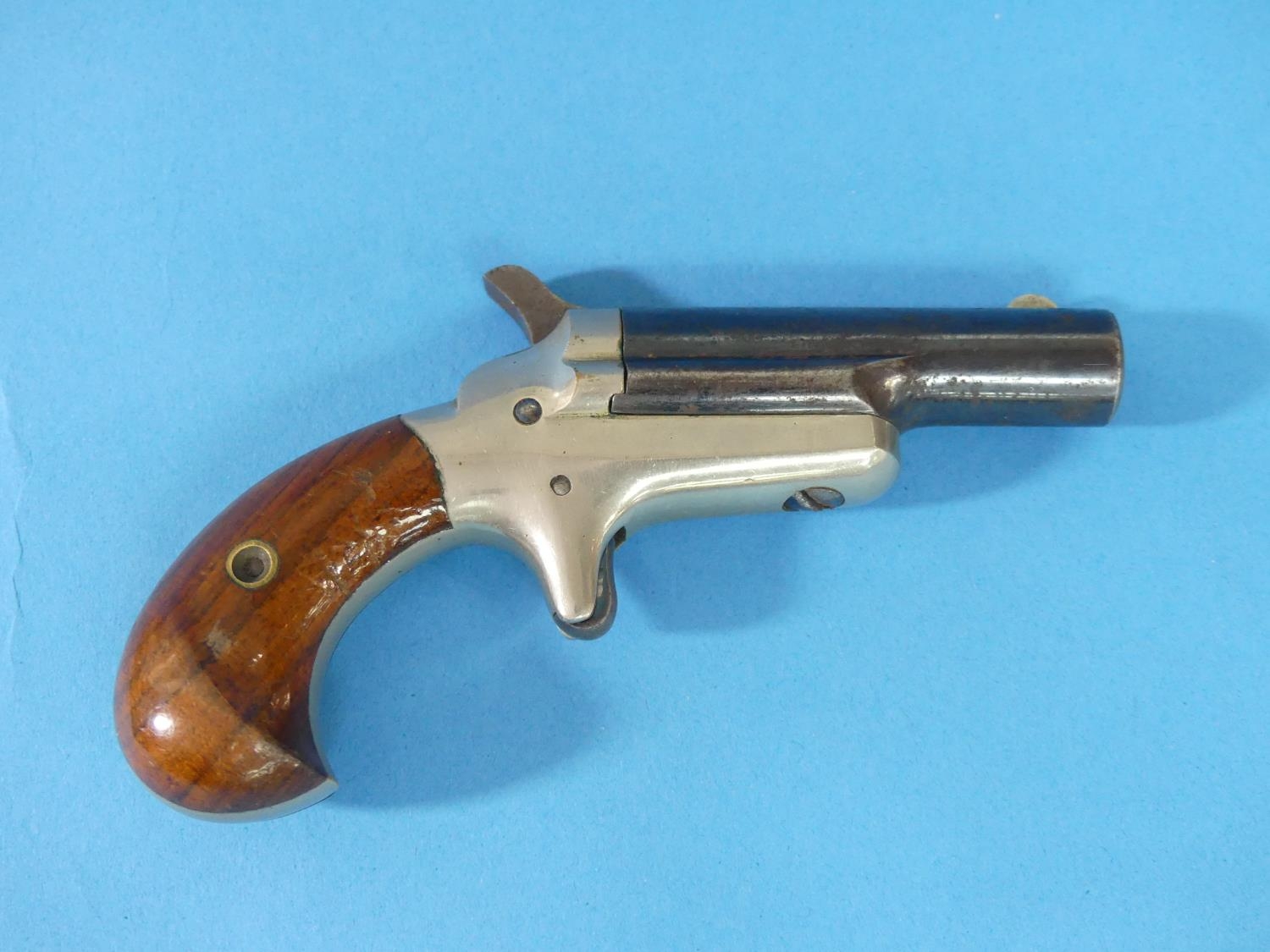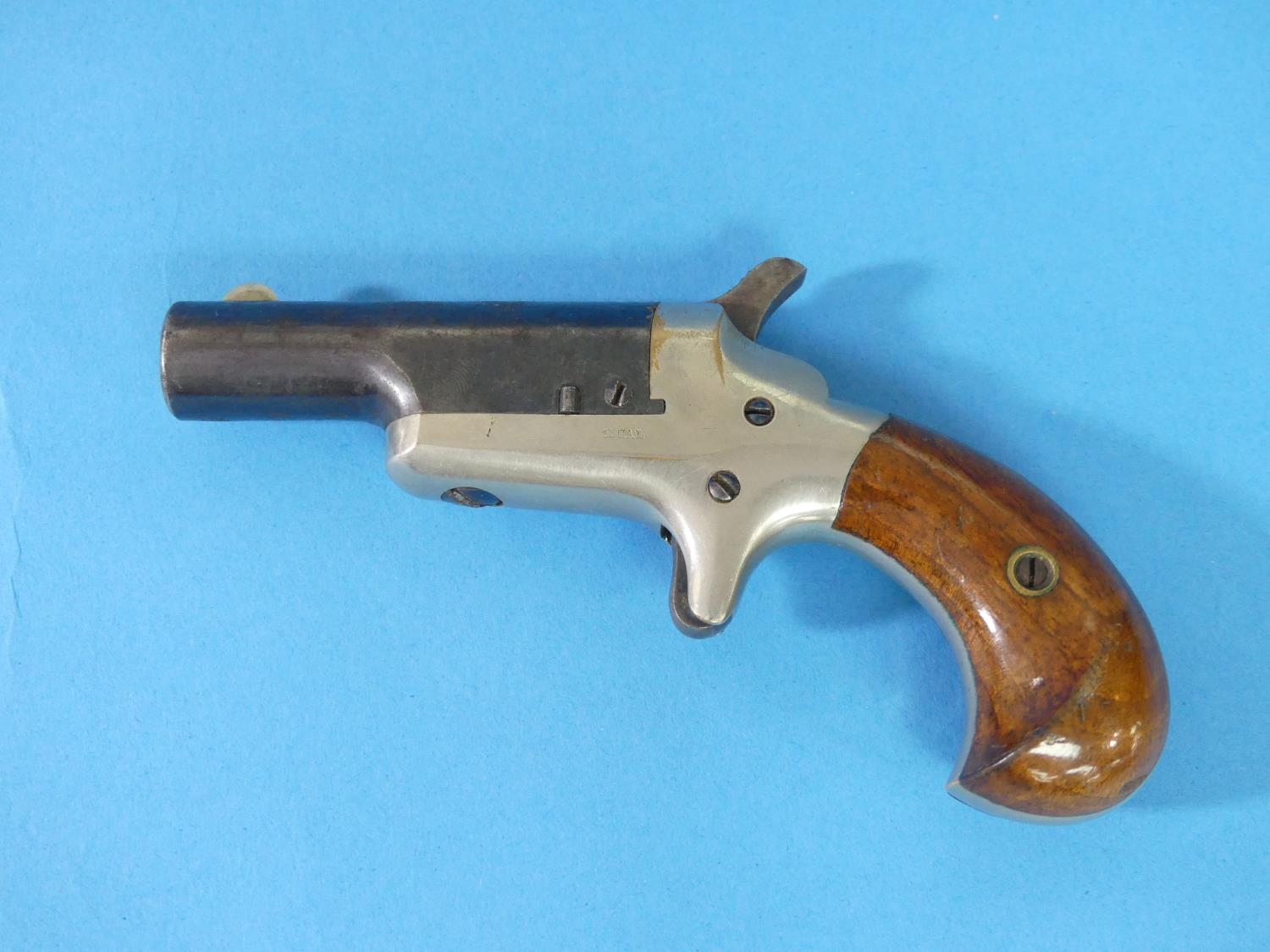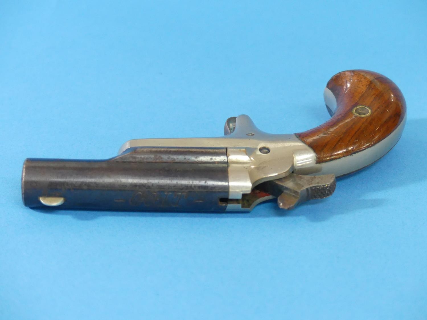 A Colt .41 cal Derringer Pistol, the 2½in hinged barrel signed on the top 'COLT', with crescent fore-sight, nickel-plated bronze frame, exposed central hammer, spur trigger and smooth two-piece walnut grip.
