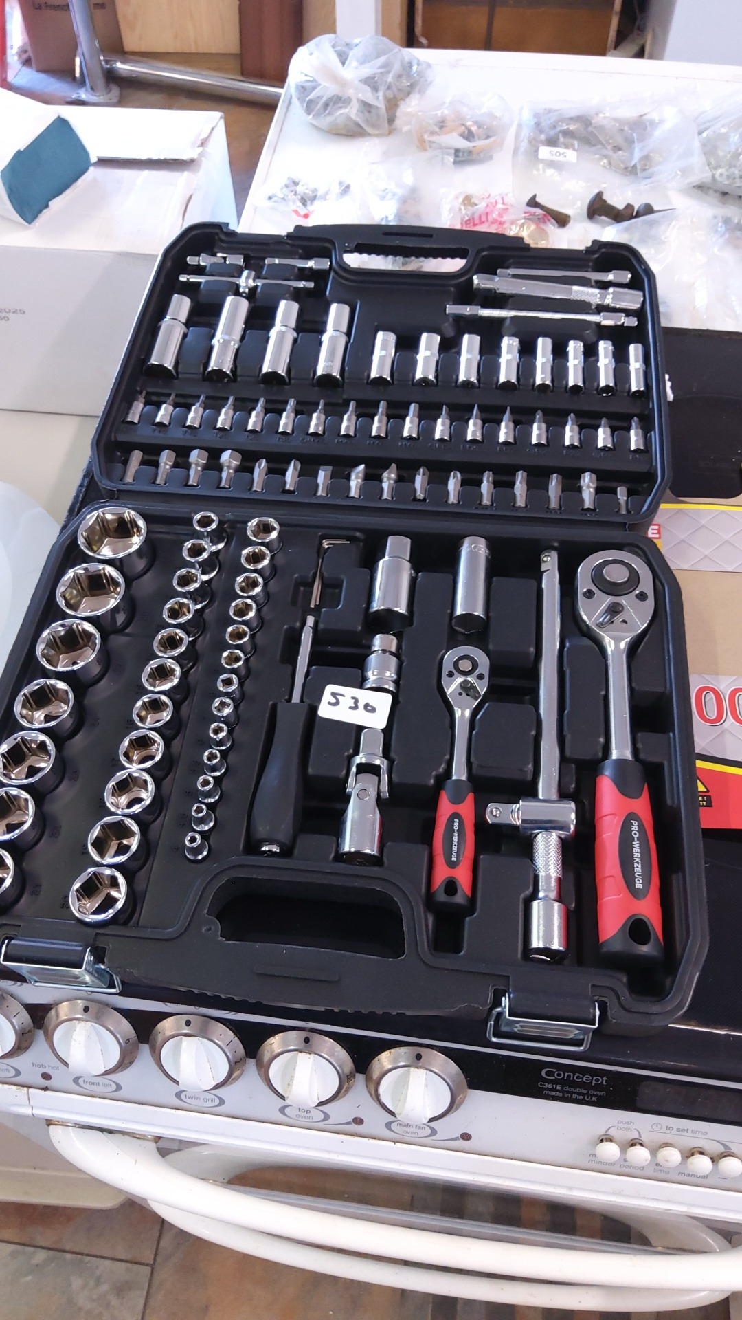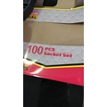 PRO-WERKZEUGE 100-piece socket set, comprising ratchets, extension bars, assorted metric sockets, screwdriver bits, and accessories, fitted in a moulded black plastic carry case; bearing original retail sleeve.