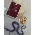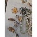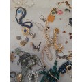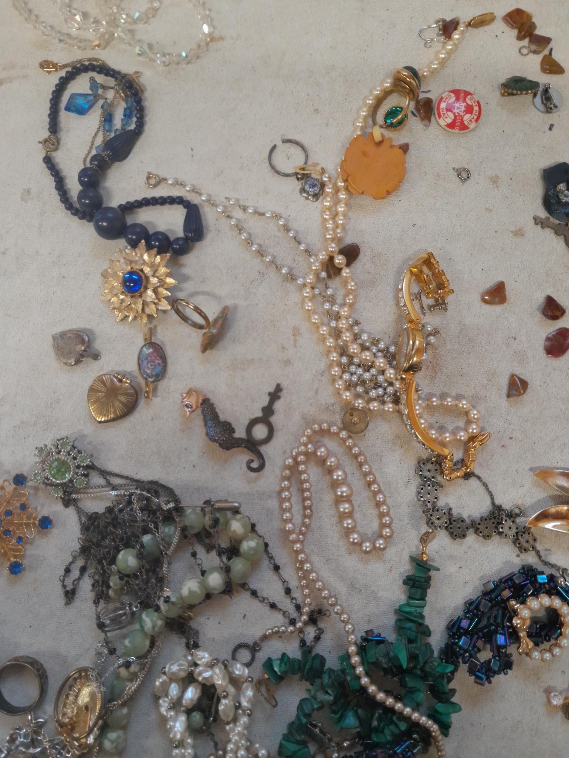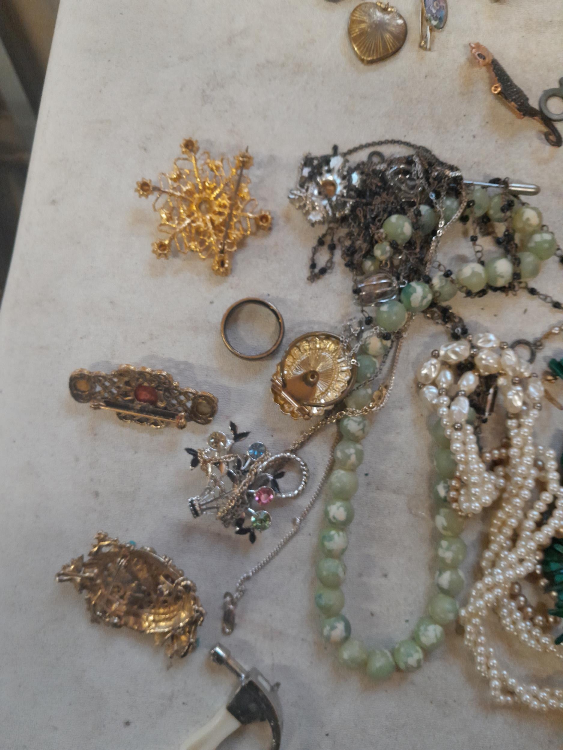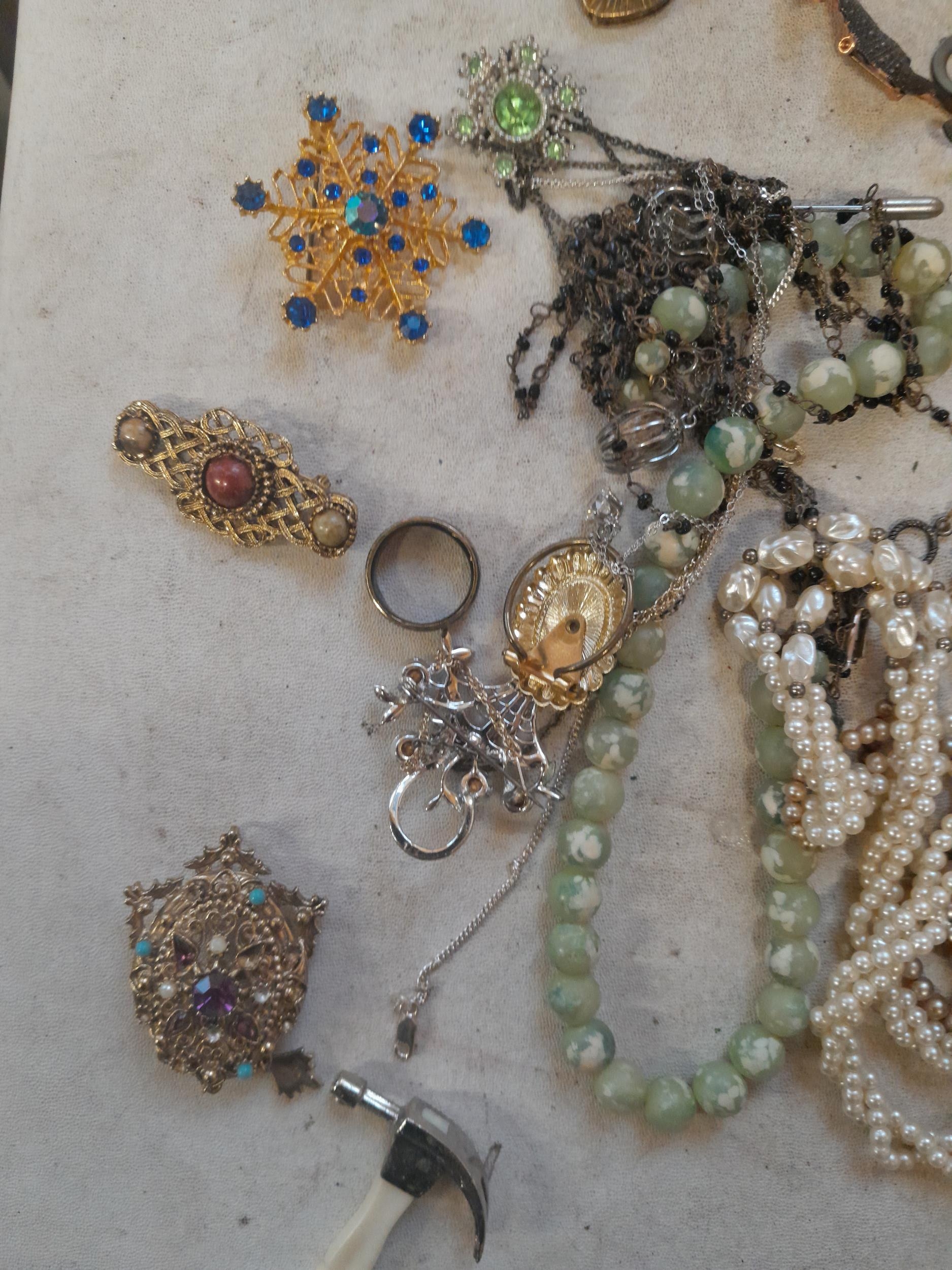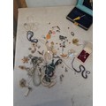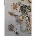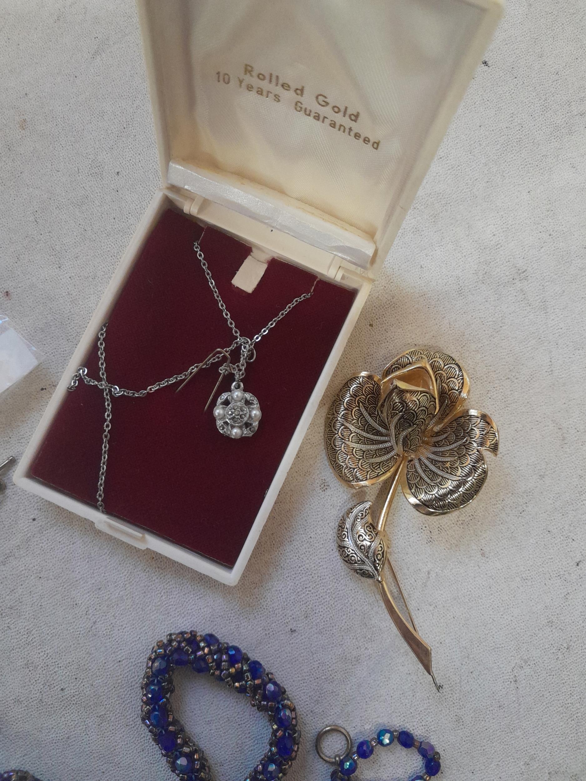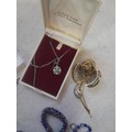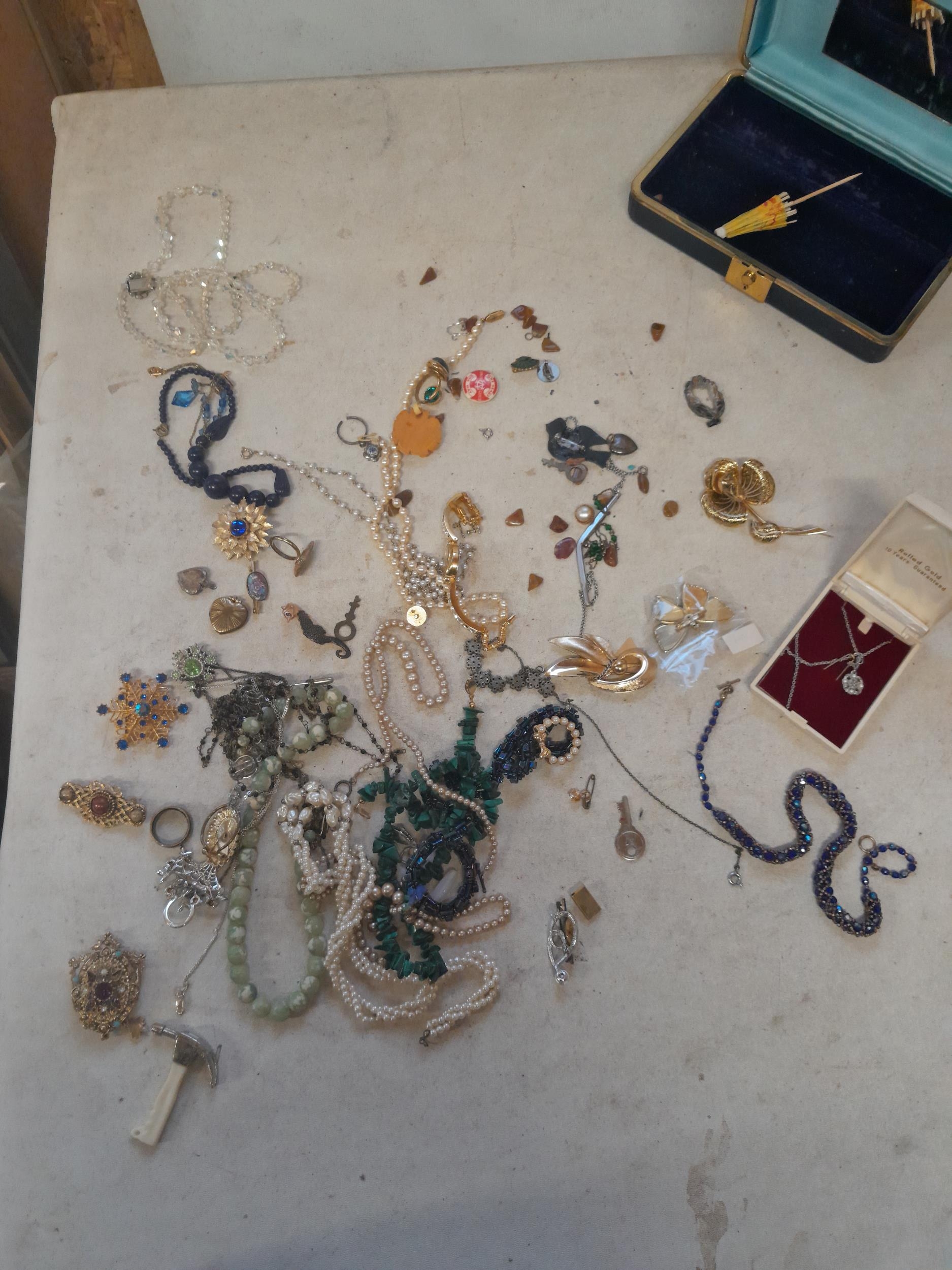 Assorted costume jewellery : silver niello work spray brooch, simulated pearls, necklaces etc.