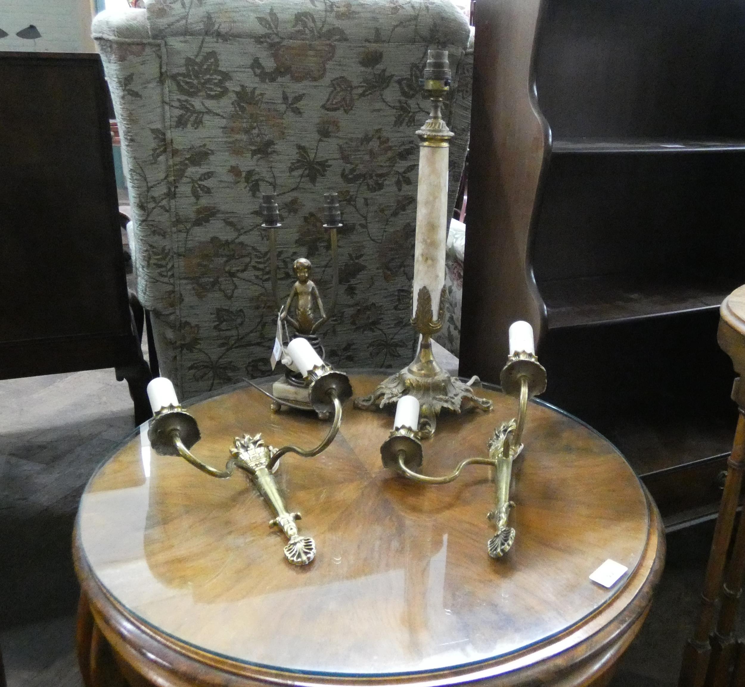 A pair of brass Girandole style wall lights, small cherub table lamp and a brass and marble table lamp